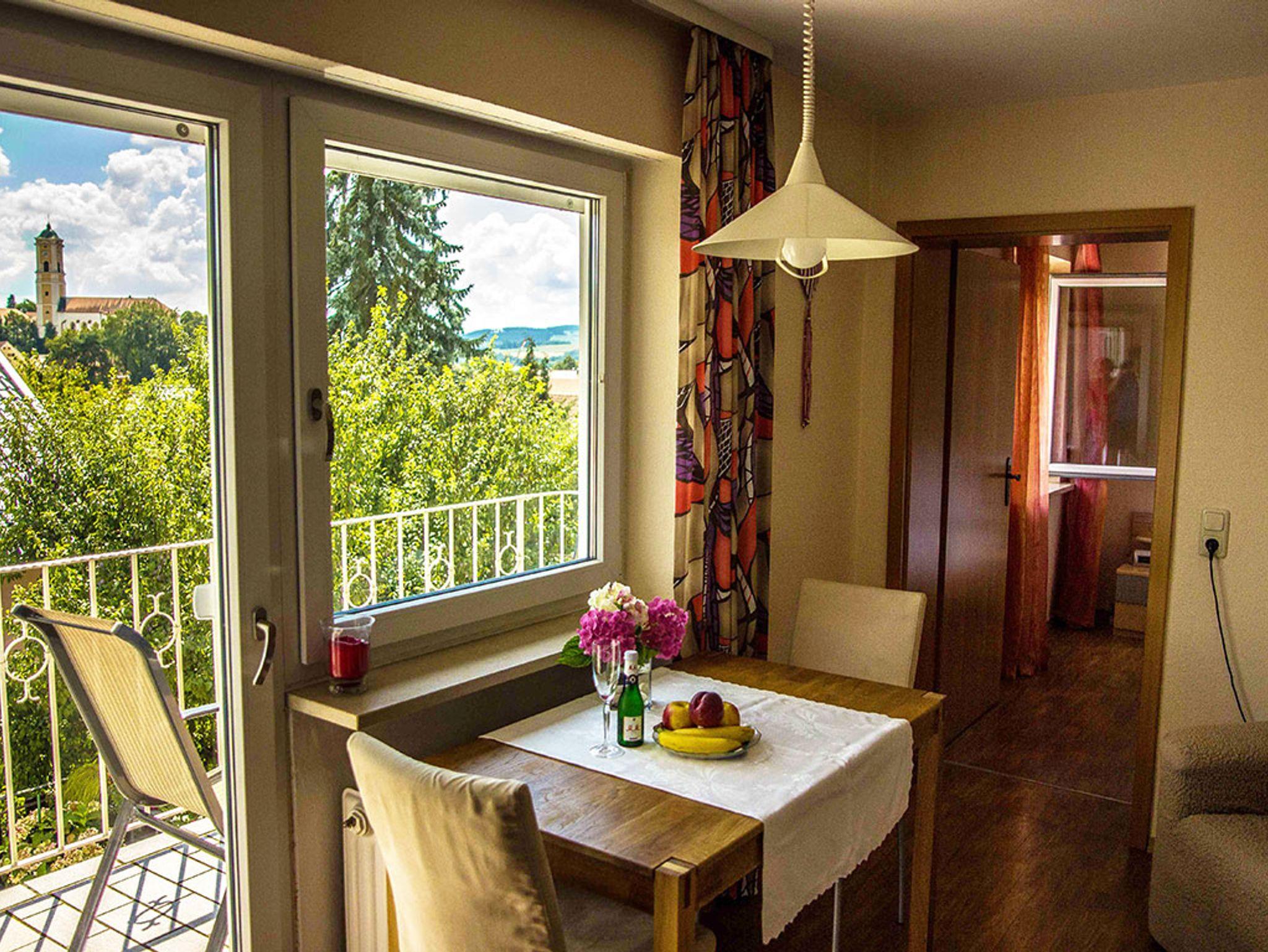 Die Ferienwohnung im Obergeschoss hat 35qm und ist bestens geeignet für 1-2 Personen. Das gemütliche Schlafzimmer ist ausgestattet mit einem Doppelbett. Die Wohnküche besteht aus einer Sitzgelegenheit, Couch und Küchenzeile. Die voll ausgestattete Küchenzeile mit Kaffeemaschine, Kühlschrank, Mikrowelle, Toaster, sowie Tisch- und Küchenwäsche lässt keine Wünsche offen. Das Badezimmer mit Doppel-Waschbecken, Dusche/WC, Bademänteln und Fön rundet das Gesamtbild ab. Ein besonderes Highlight ist die großartige Aussicht, die Sie von Ihrem Balkon genießen können. Bettwäsche und Handtücher sind vorhanden. Parkplätze finden Sie direkt vor dem Haus. Die Wohnung befindet sich in Bad Birnbach, nur wenige Minuten von der Rottal Terme und dem Golfpark Bella Vista entfernt.
