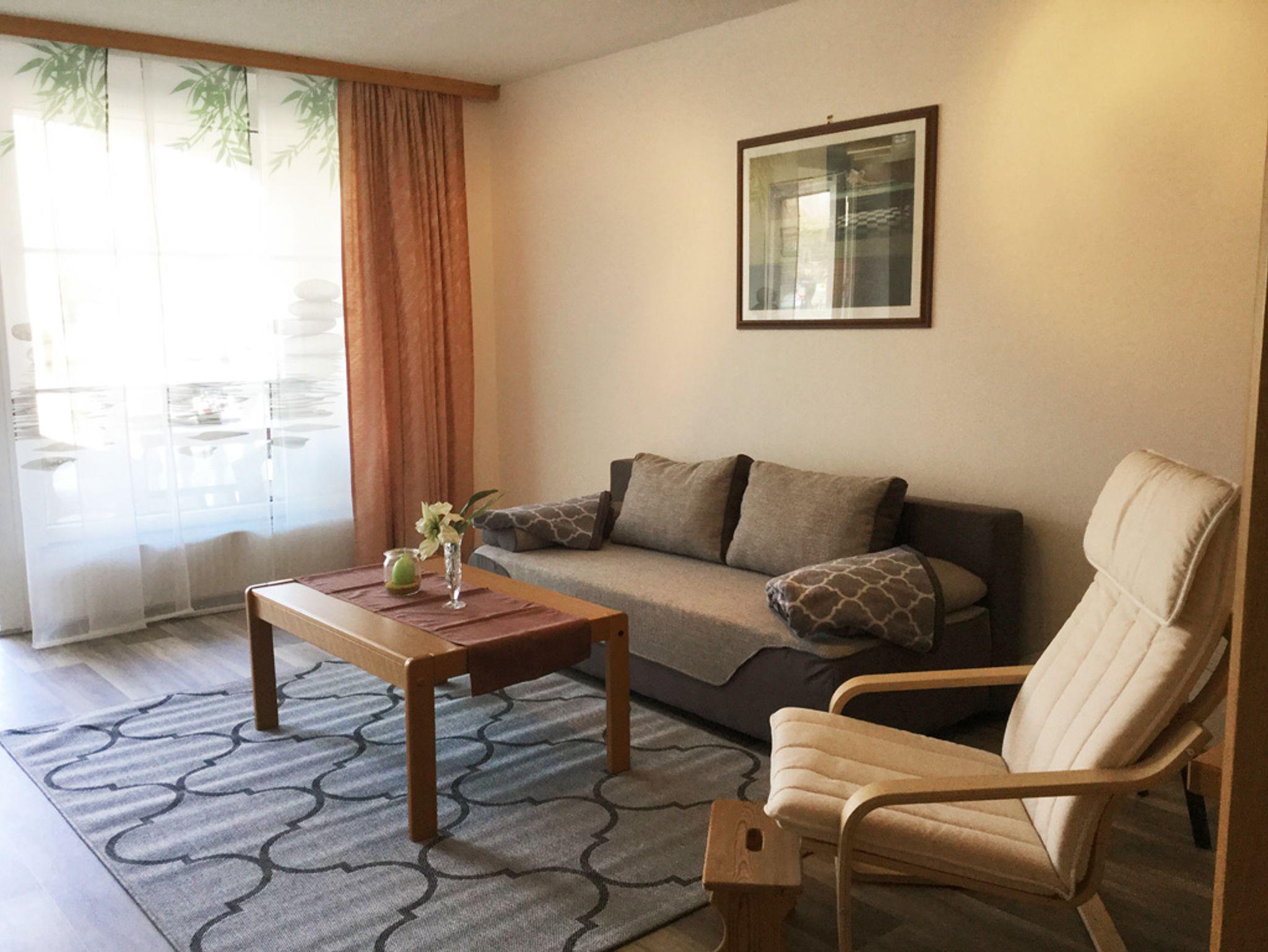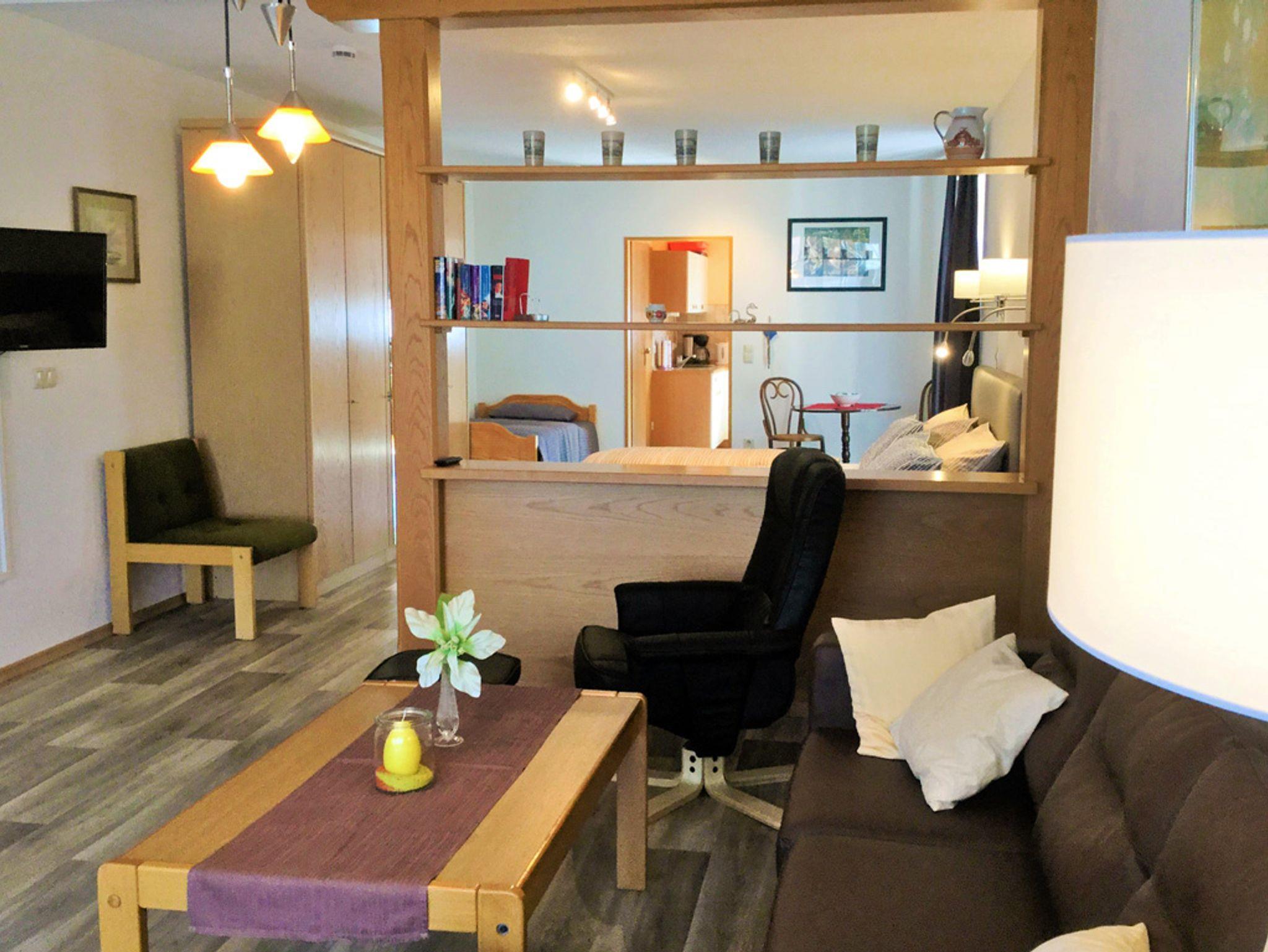 Das Familienappartement befindet sich im Erdgeschoss und ist ca. 50qm groß. Es verfügt über einen kombinierten Wohn- und Schlafbereich mit einem Raumteiler, sowie einem Boxspringbett und einer Schlafcouch. Die Küche ist voll eingerichtet mit Kühlschrank, Kaffeemaschine, Mikrowelle, Wasserkocher, Toaster und Essecke. Außerdem verfügt das Appartement über kostenfreies WLAN und Flachbild TV.