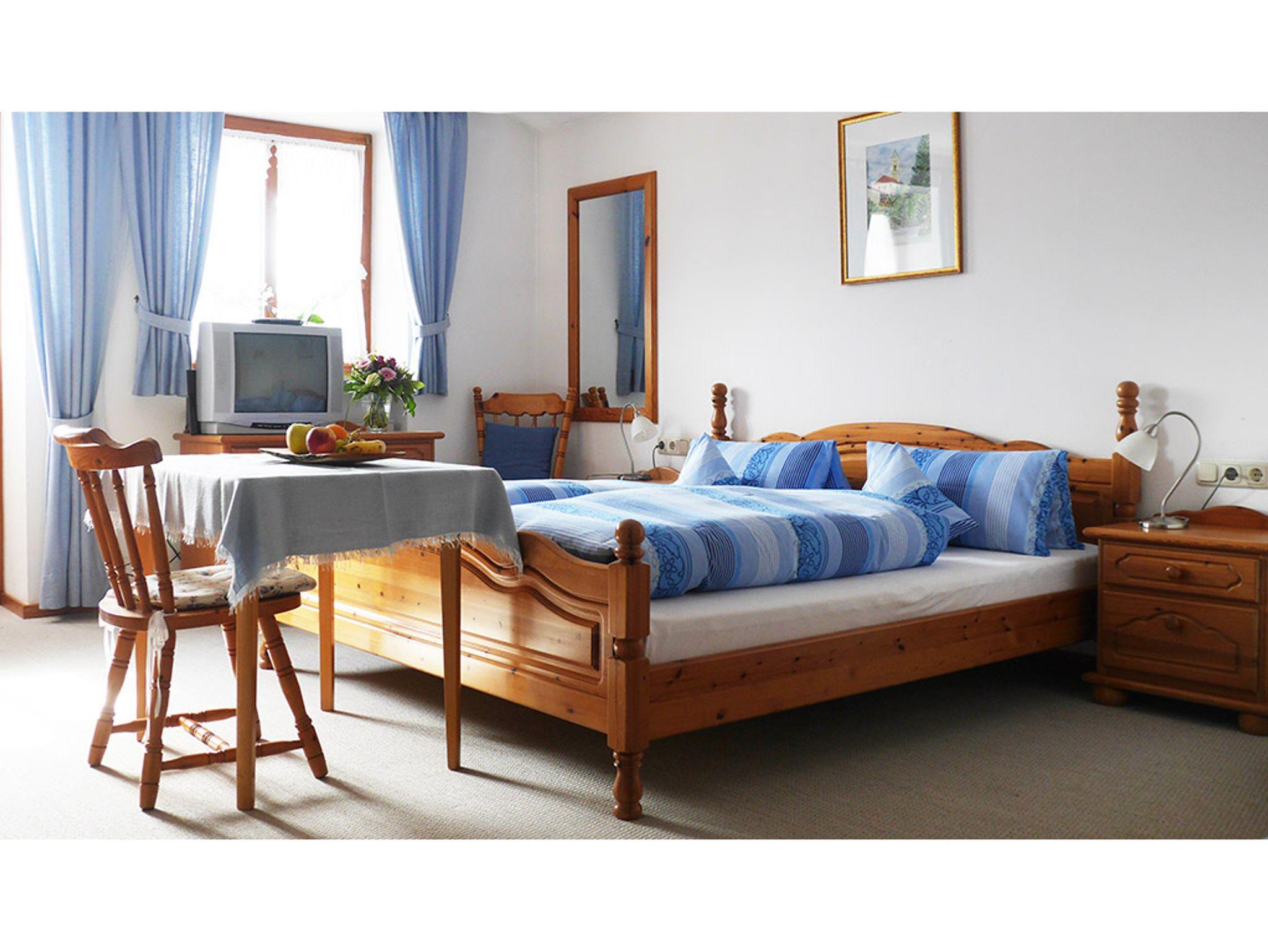 Das helle und geräumige Doppelzimmer verfügt über ein Doppelbett. Auf den gemütlichen massiven Kieferholzmöbeln mit TV können Sie entspannte Abende verbringen. Das Badezimmer mit Dusche, WC und Fön rundet das Gesamtbild ab. Vor allem im Sommer können Sie sich auf dem eigenen Balkon entspannen. Selbstverständlich können Sie auch die Grillmöglichkeiten in unserem Garten nutzen.