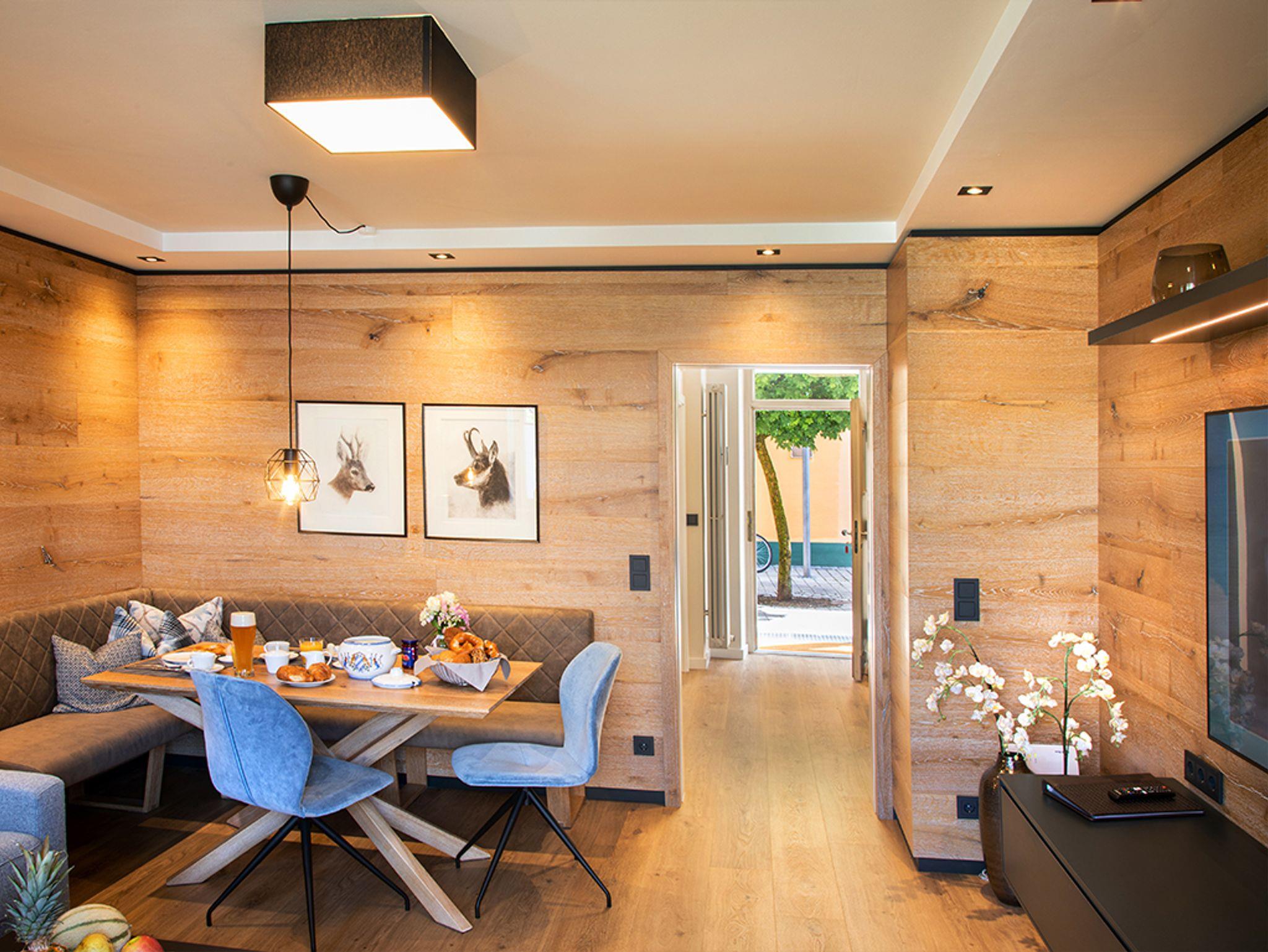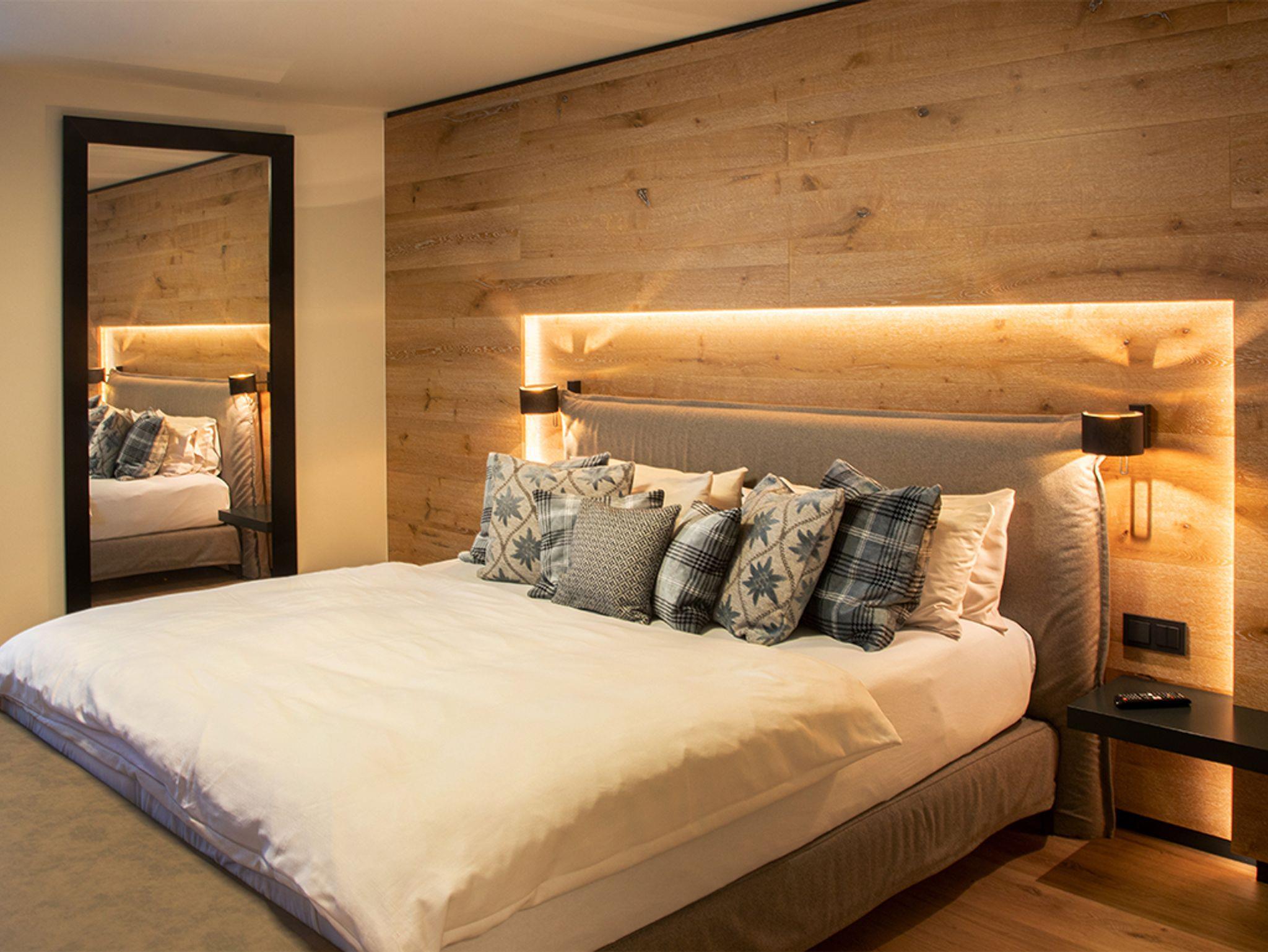 Gemütliche Holzvertäfelung kombiniert mit modernen Einbaumöbeln in warmen Holztönen, vereinen Tradition und Design. Die ebenso in höchster Handwerkskunst gefertigten Boxspringbetten der Fa. Treca Paris versprechen erholsamen Schlaf und Energie für Ihre Urlaubsaktivitäten rund um das ländliche Bad.