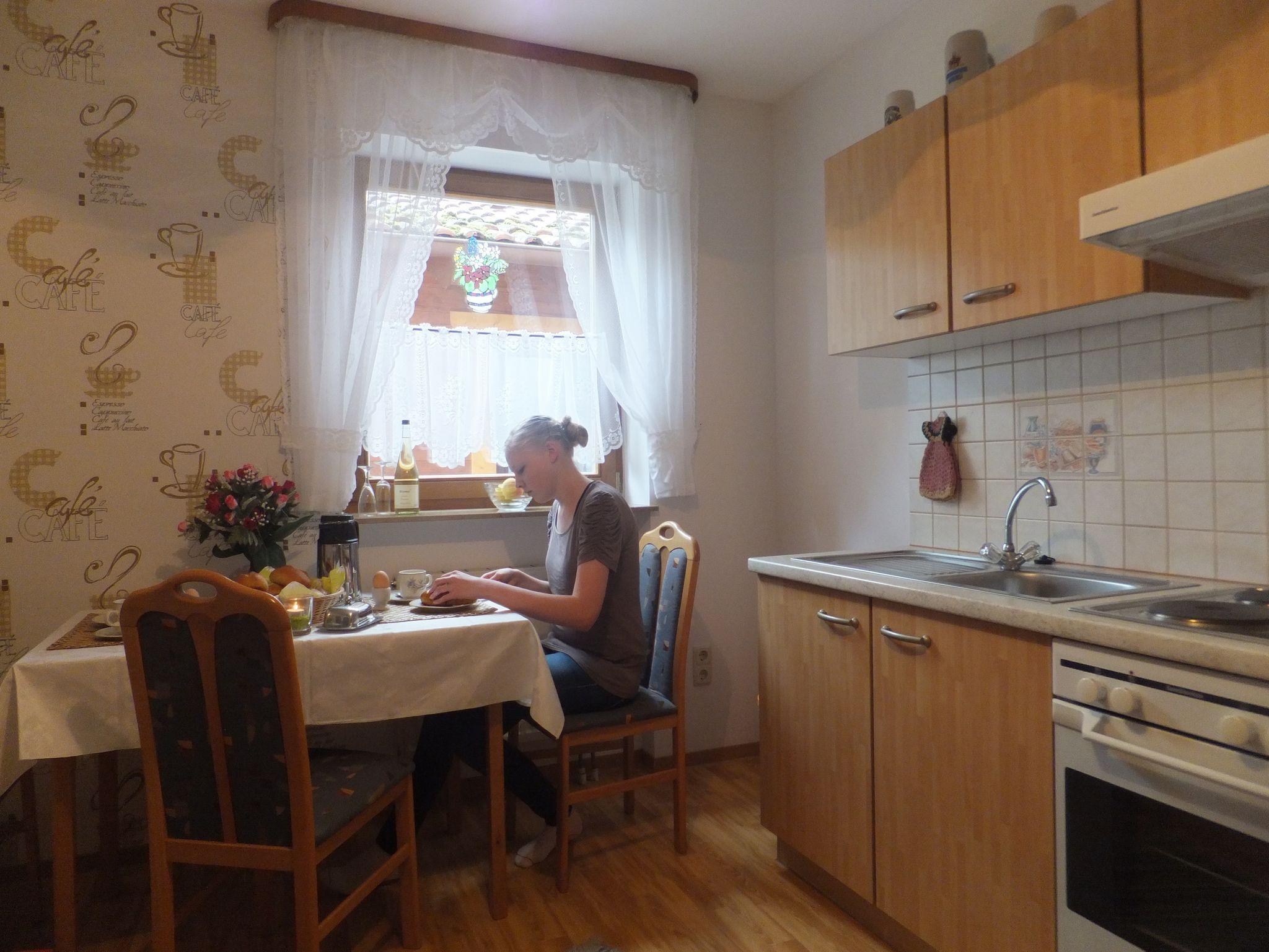 Wohnküche mit Essecke, Kühlschrank, Mikrowelle, ausreichend Küchenutensilien, Backofen, Herd....., Schlafsofa für eine Zusatzperson.