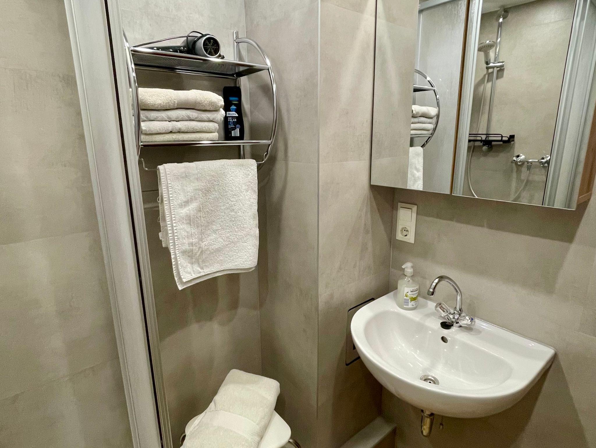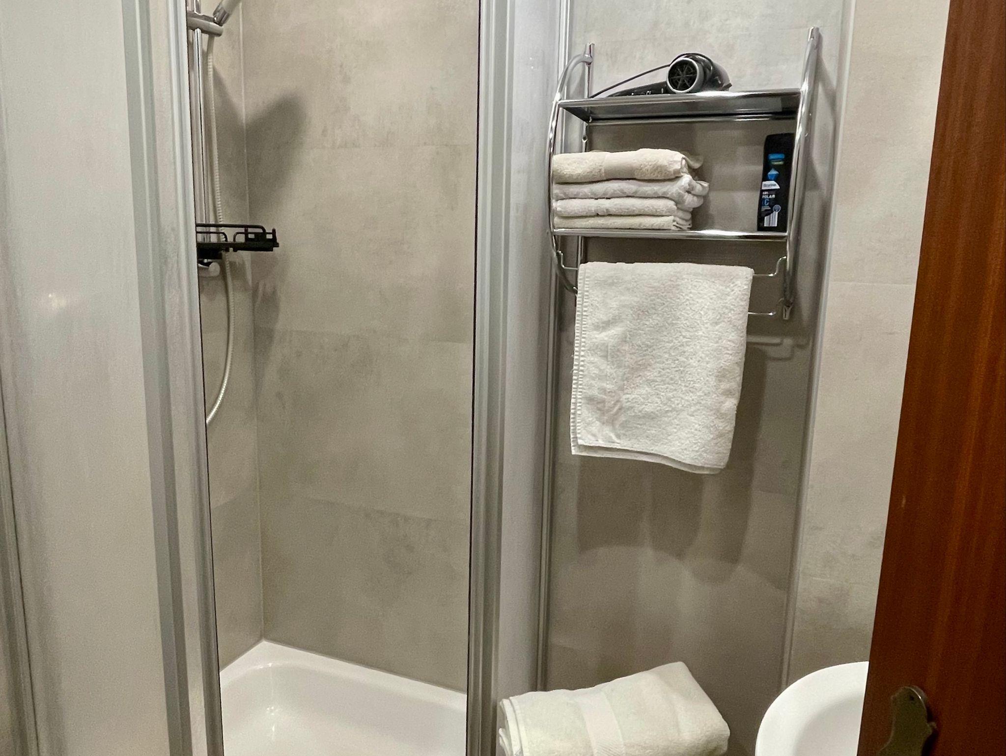 Haltegriffe in der Dusche und am WC, Duschmatte, Duschhocker, Fön.