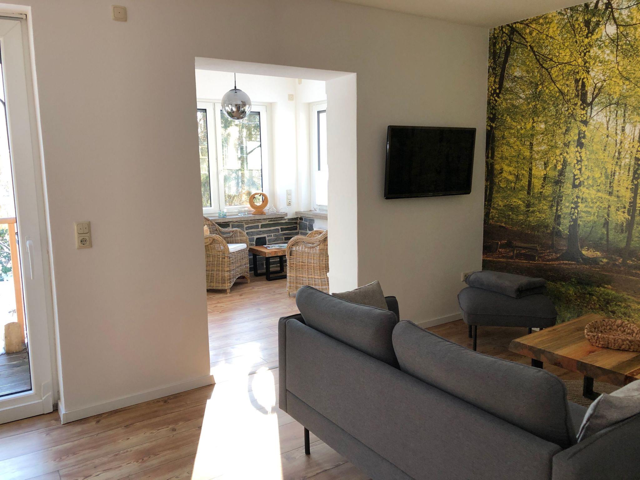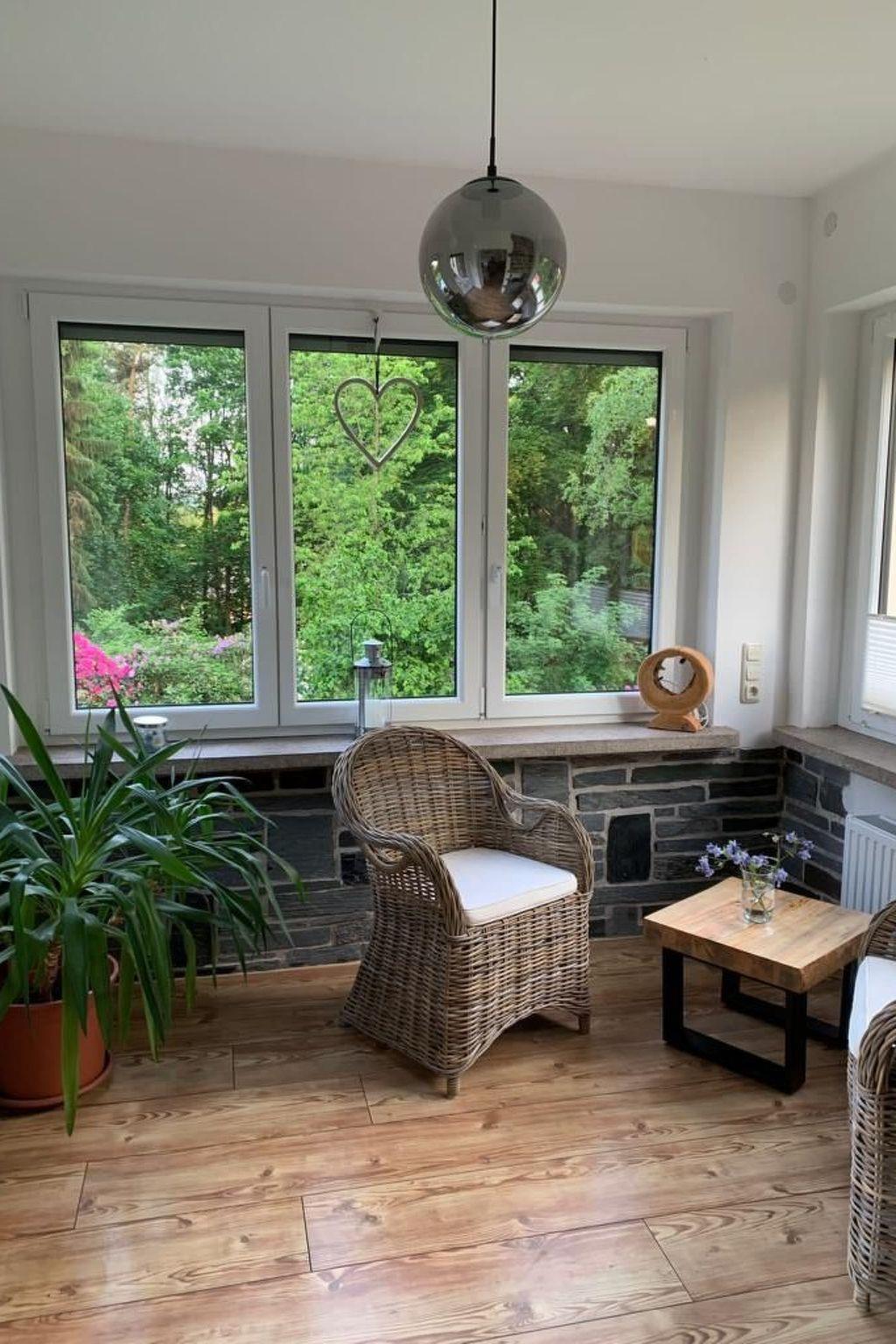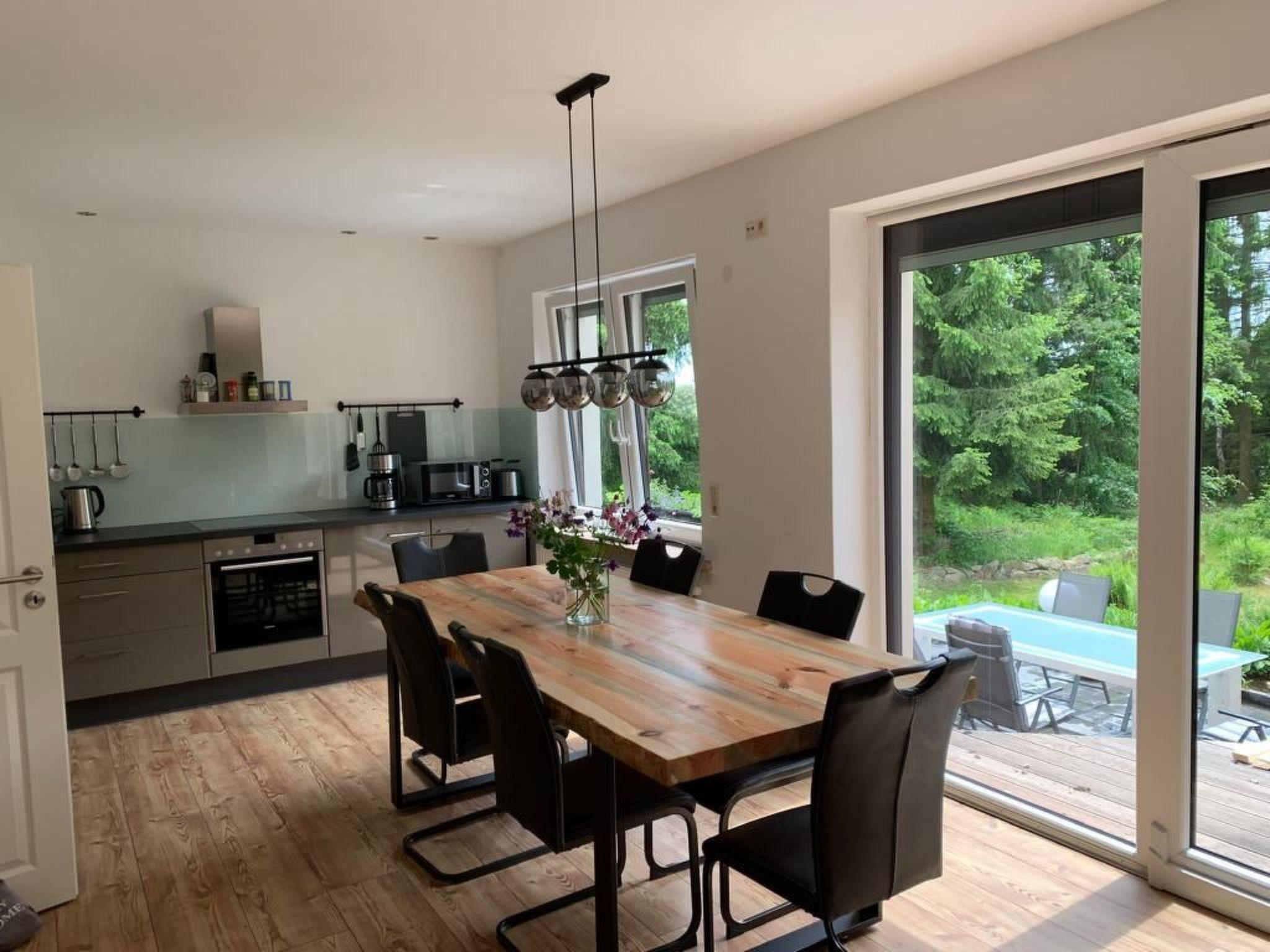 On the ground floor there is a fully equipped high-gloss kitchen with a large dining area and a view of the terrace and garden. There is also a cosy living room with TV and bay window.