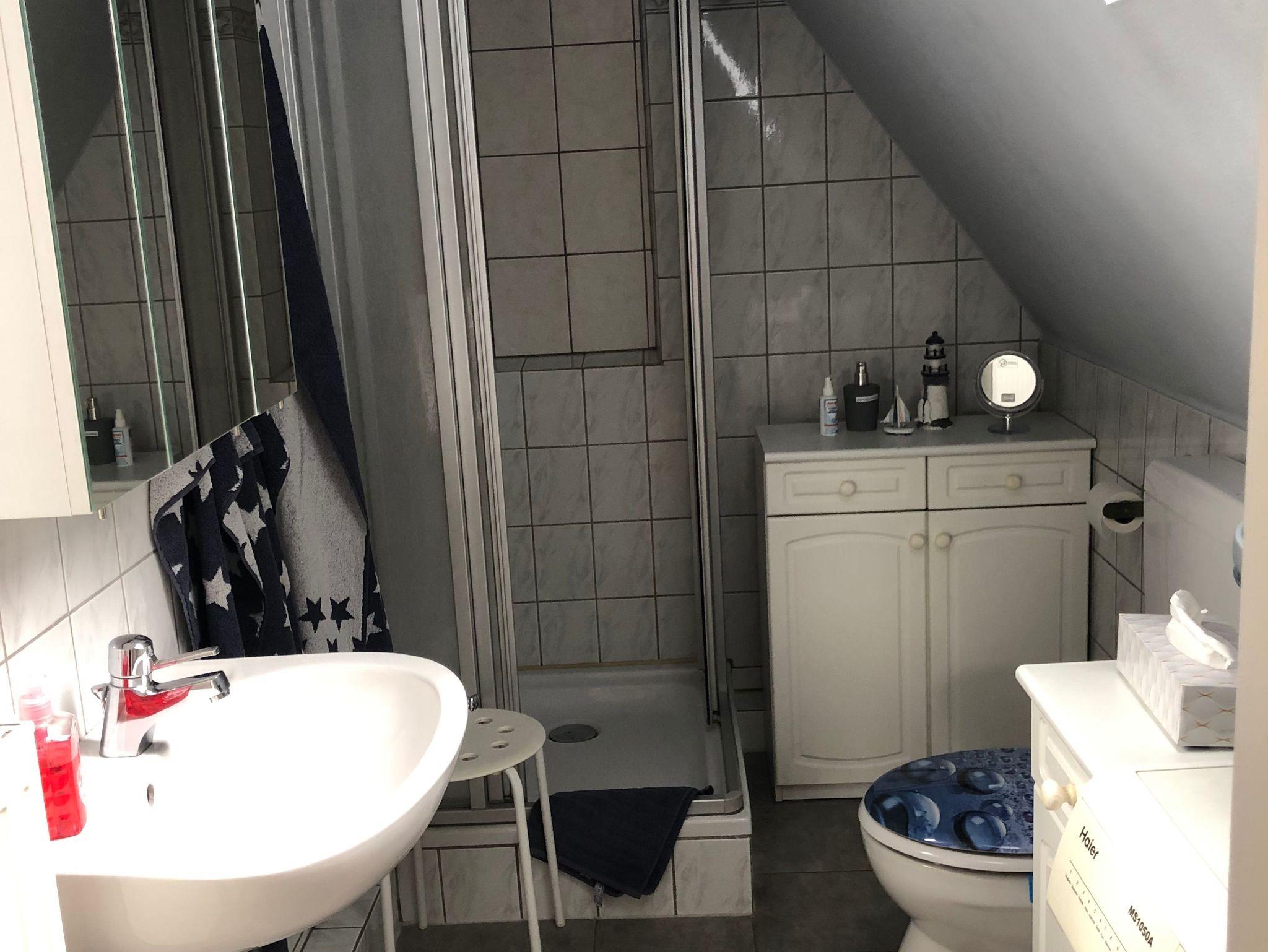 Bad: Außenfenster, Dusche, Waschbecken, WC, Föhn und Kosmetikspiegel, Waschmaschine.