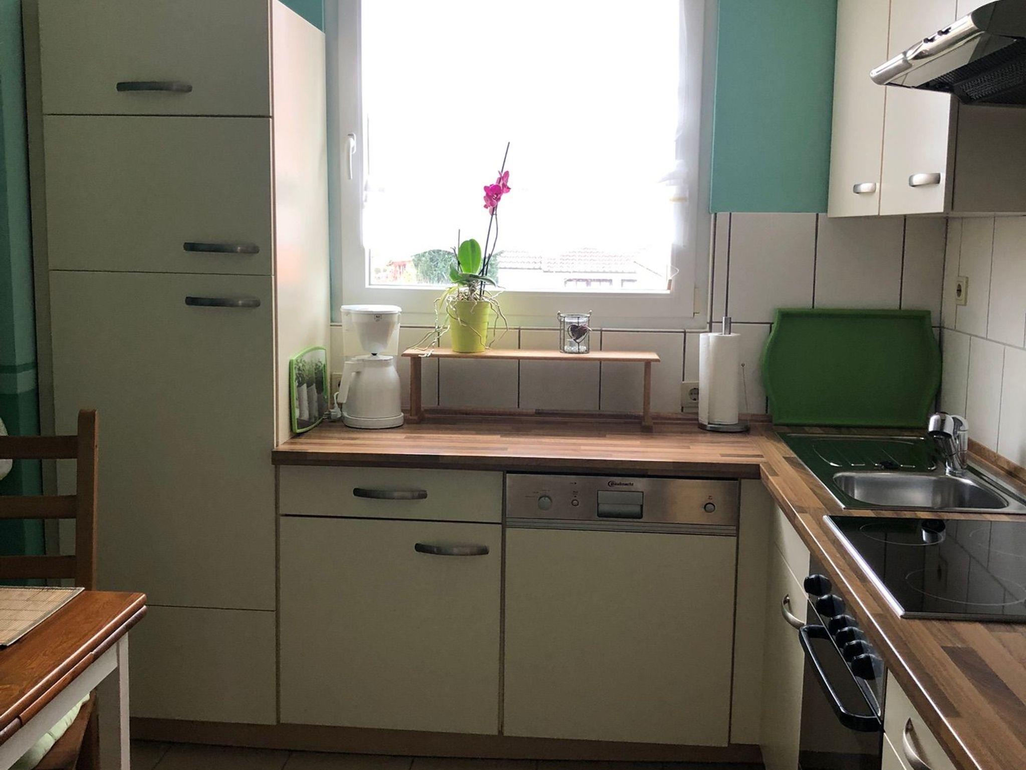 Die Einbau-Küche: Herd mit Ceranfeld und mit Backofen, Mikrowelle, Dunstabzug, Spülmaschine, Wasserkocher, Kaffeemaschine, Kühlschrank mit Gefrierfach, Toaster und Mixer; Sitz-/Essbereich