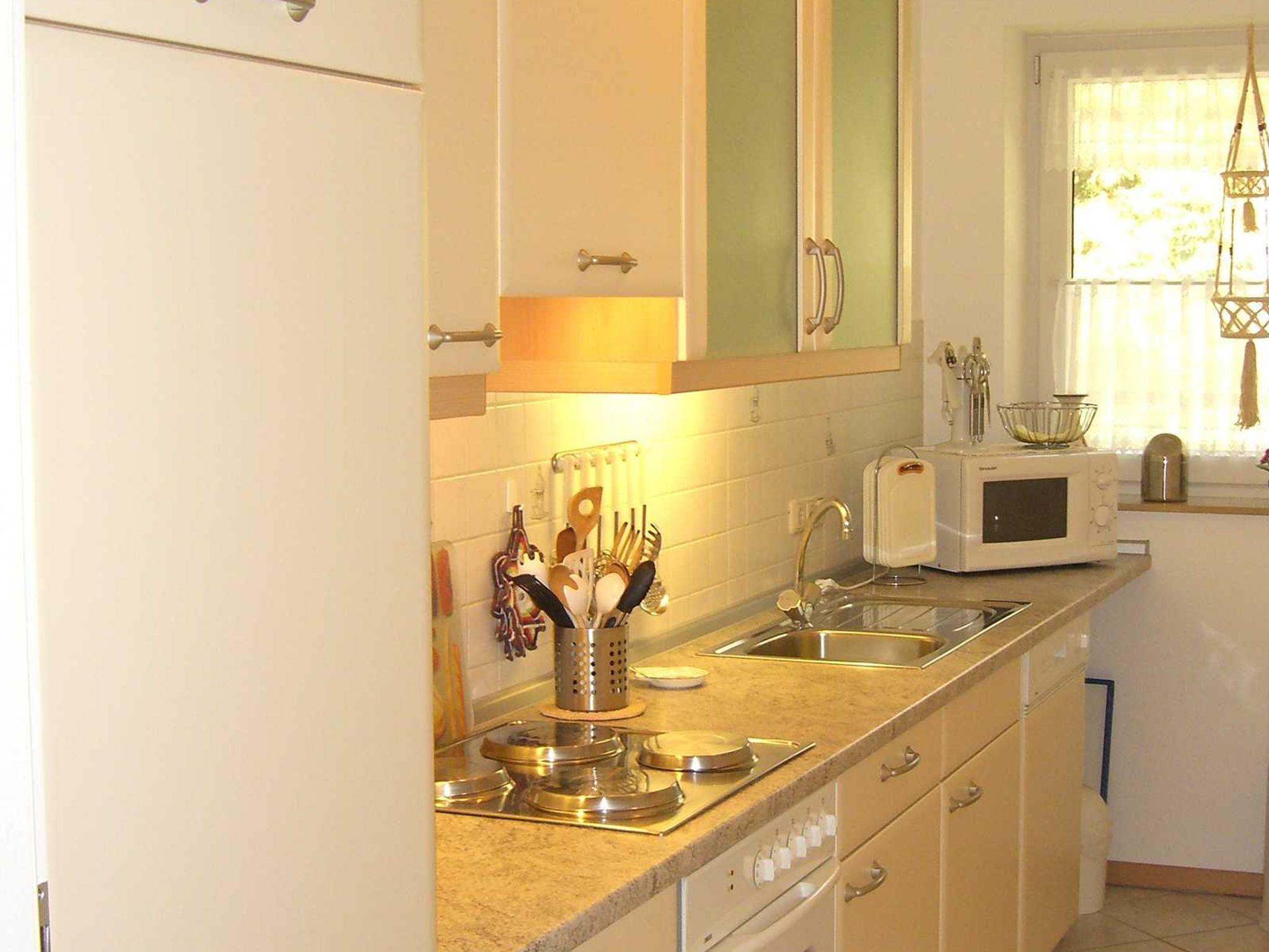Die Einbauküche ist u.a. mit Backofen, Dunstabzug, Spülmaschine, Kaffeemaschine, Senseo, Mikrowelle, Toaster, Mixer, Wasserkocher, Eierkocher und Brotschneidemaschine ausgestattet.