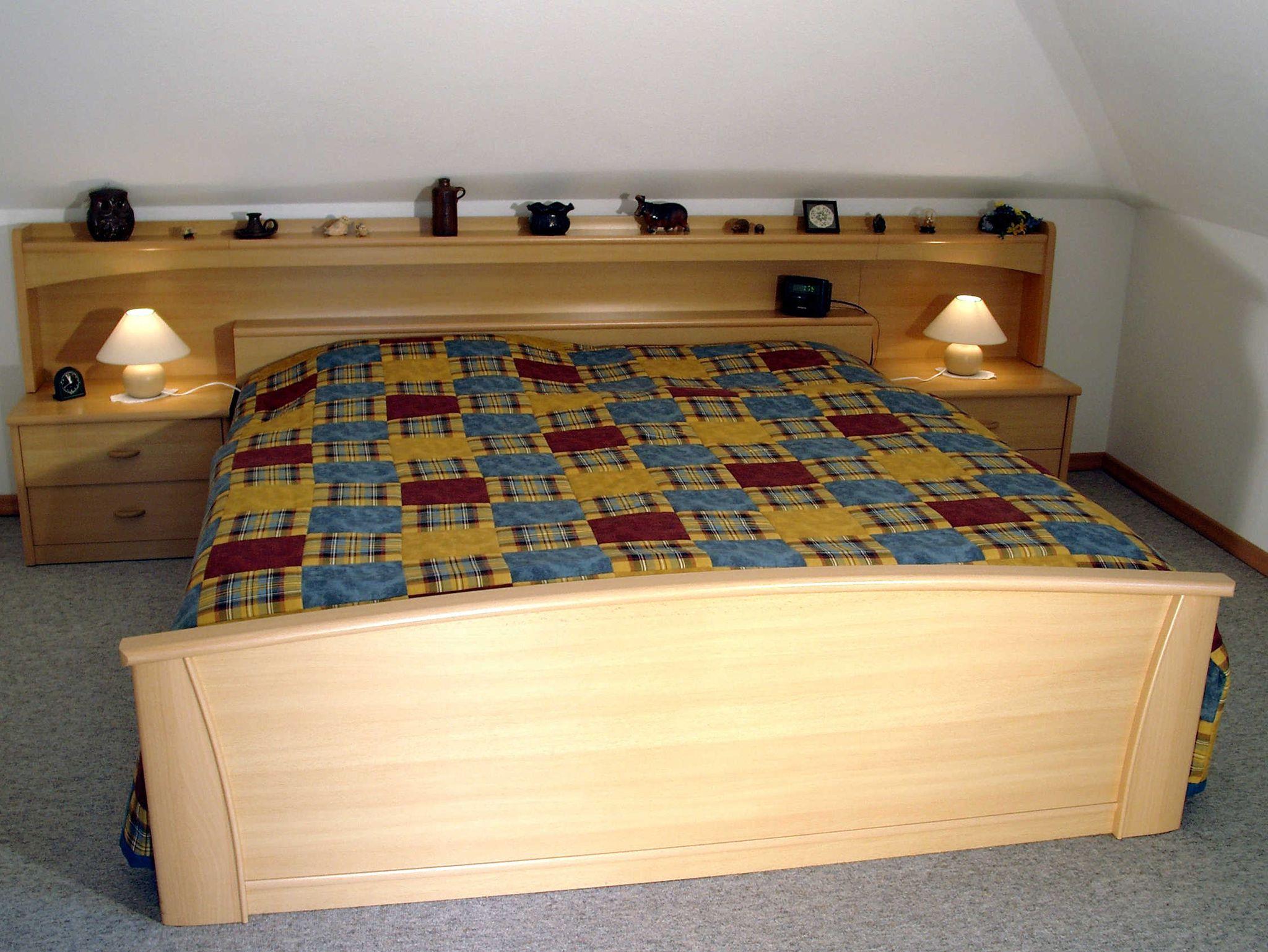 Das geräumige Schlafzimmer ist mit einem erhöhten Doppelbett (Gesundheitsbetten, am Fußende mit Wandbegrenzung, pro Person 0,90x2,00m) möbliert, mit verstellbaren Lattenrosten und orthop. Matratzen sowie Nachttischen und Leselampen. Bettwäsche und Handtücher gehören zum Standard. Auf Wunsch werden zusätzliche Decken und Kopfkissen gereicht..