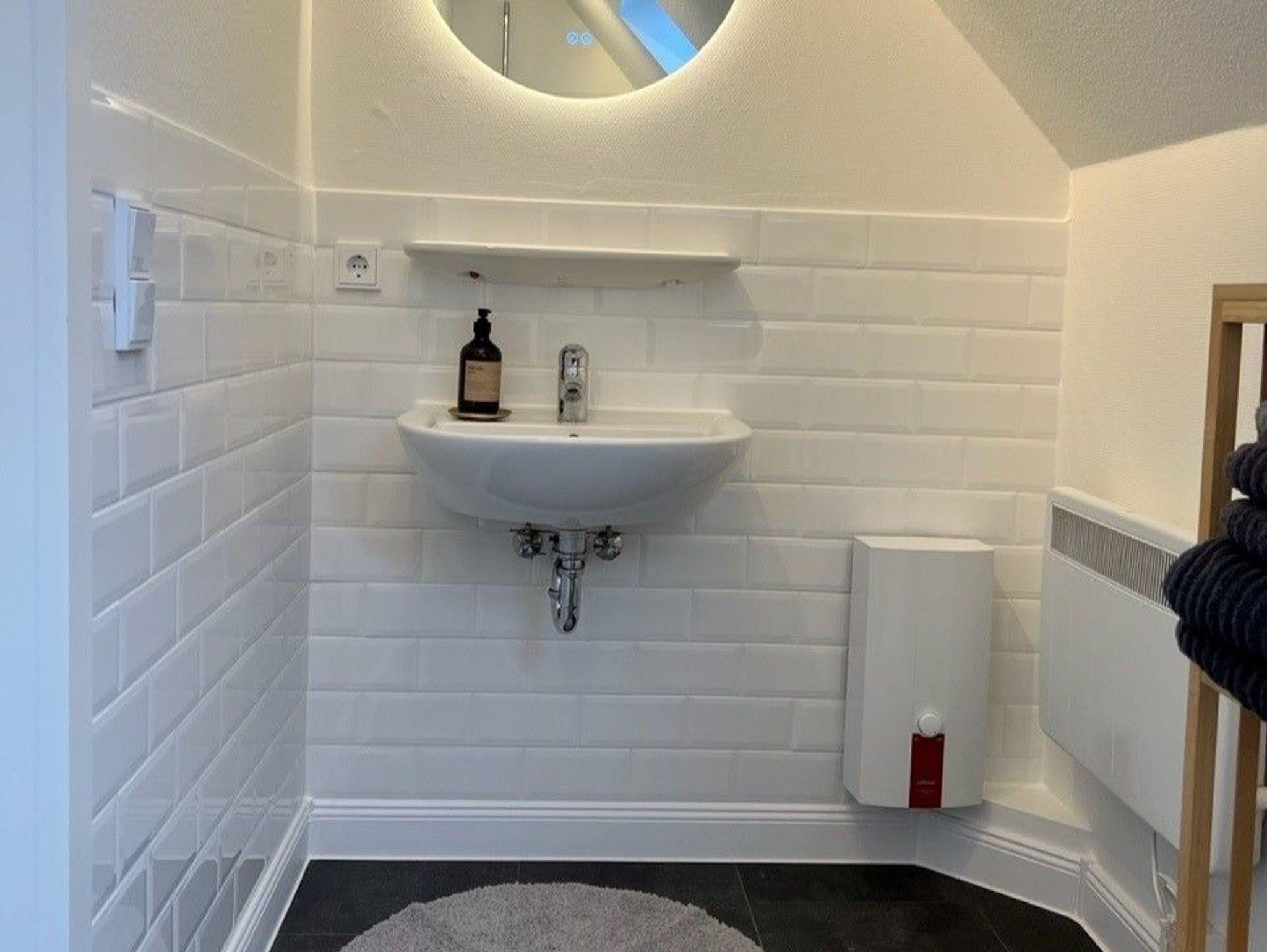 Das moderne Badezimmer verfügt unter anderem über Waschbecken, WC, Dusche und eine Waschmaschine. Außerdem stellt der Gastgeber frische Seifen bereit.