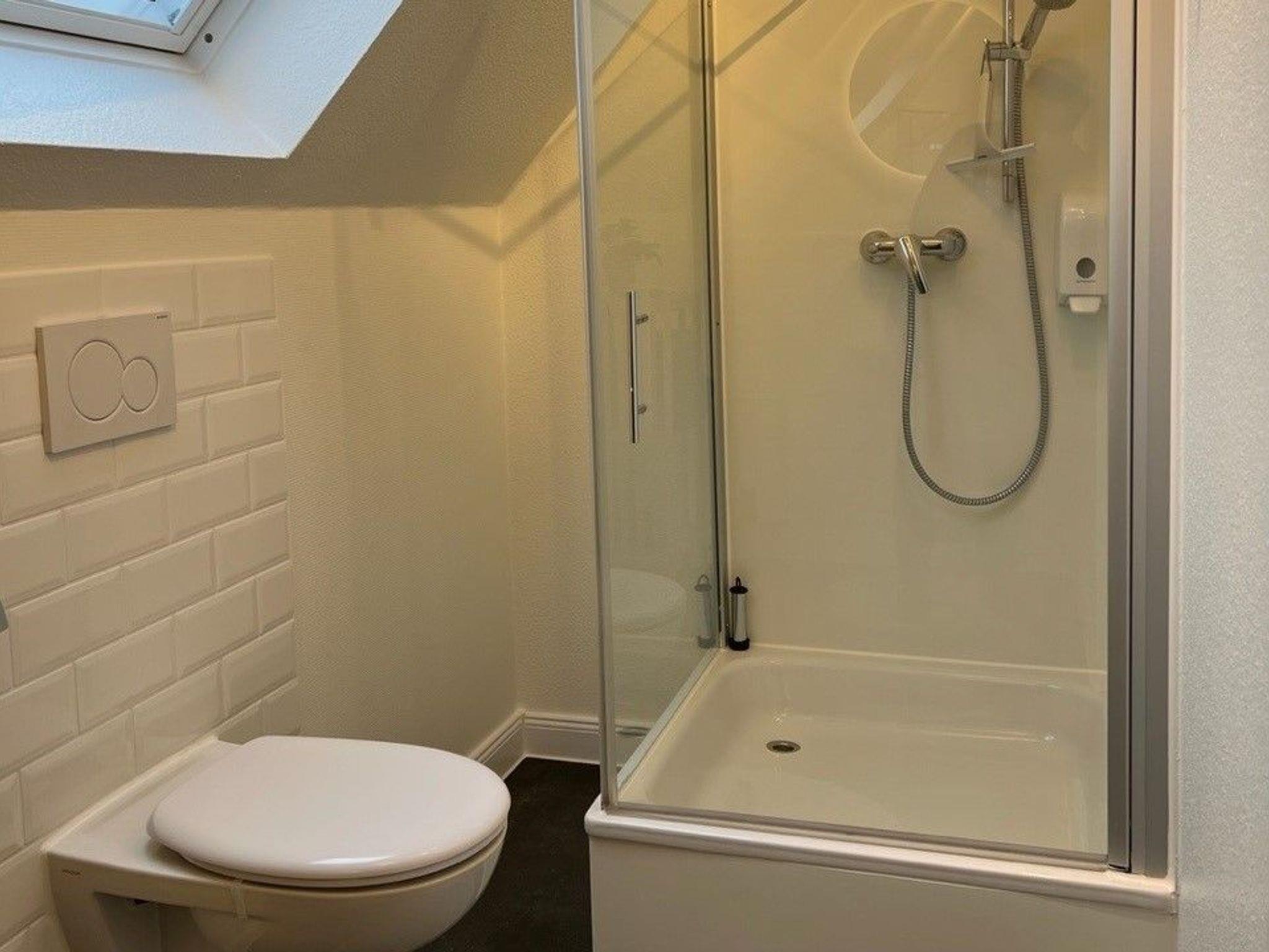 Das Badezimmer ist mit einer Dusche, einem WC, einem Haartrockner und einer Waschmaschine ausgestattet.