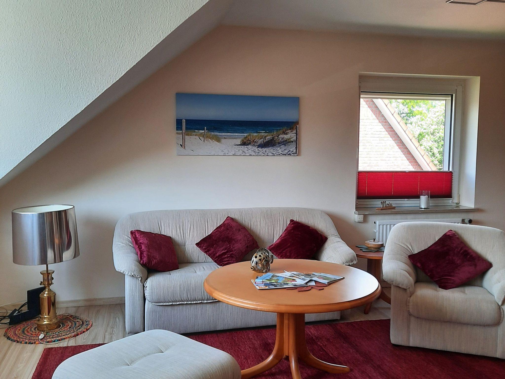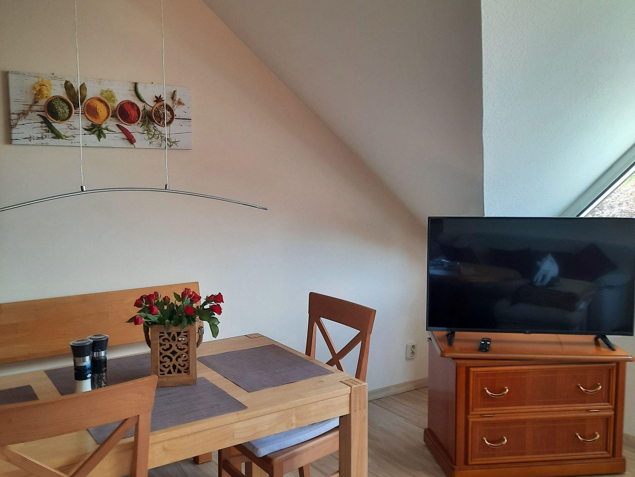 Die Wohnfläche von 50 qm verteilt sich auf zwei Zimmer, Schlafzimmer mit Doppelbett und ein gemütliches Wohnzimmer mit integrierter Essecke.