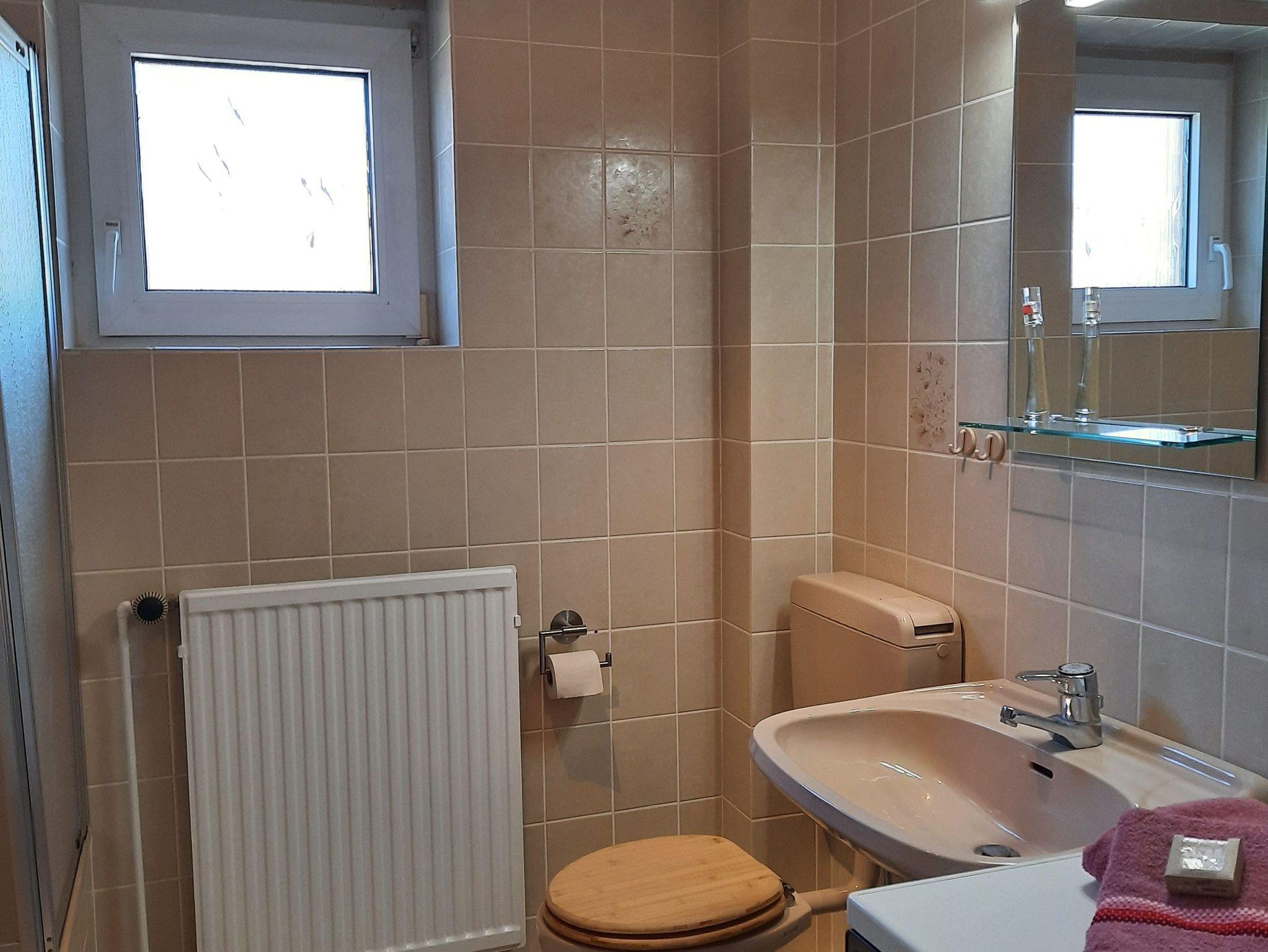Das Badezimmer ist mit einer Badewanne mit integrierter Dusche und Duschwand, sowie