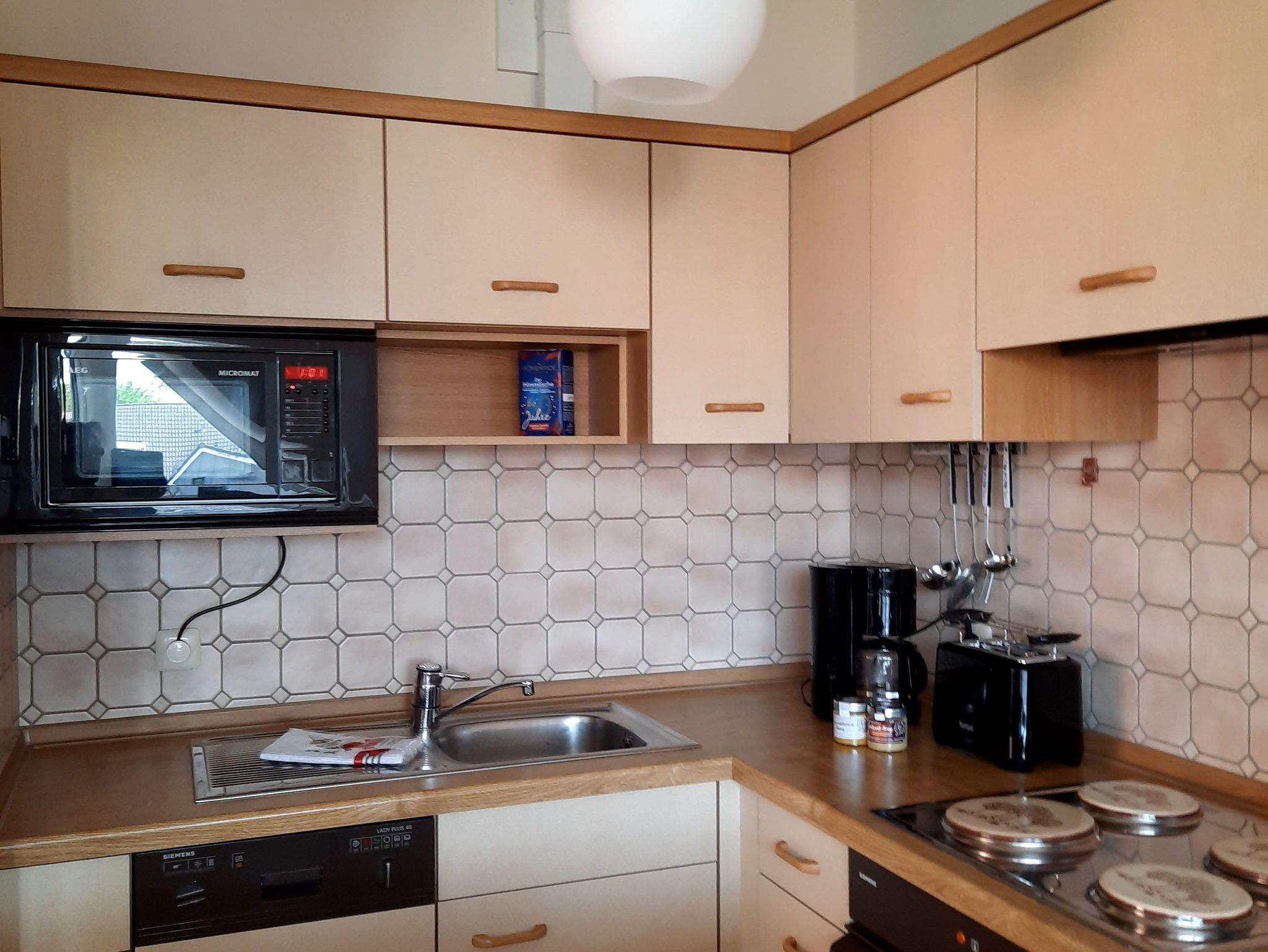 Ausgestattet ist die Küche mit einem E-Herd, Spülmaschine, Kühlschrank und Mikrowelle.