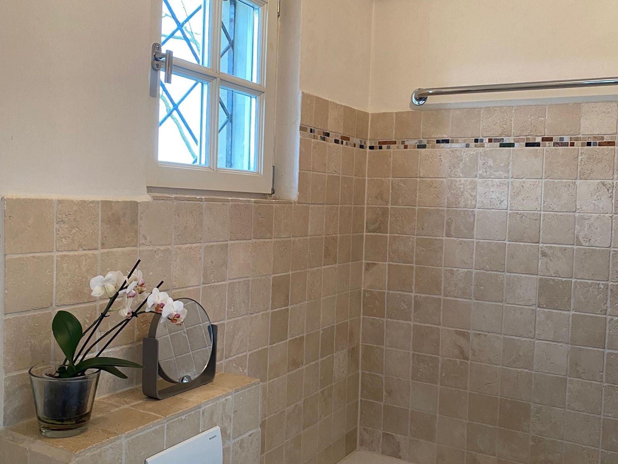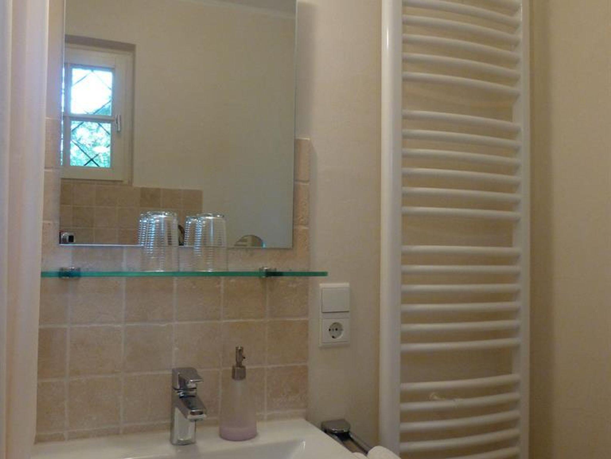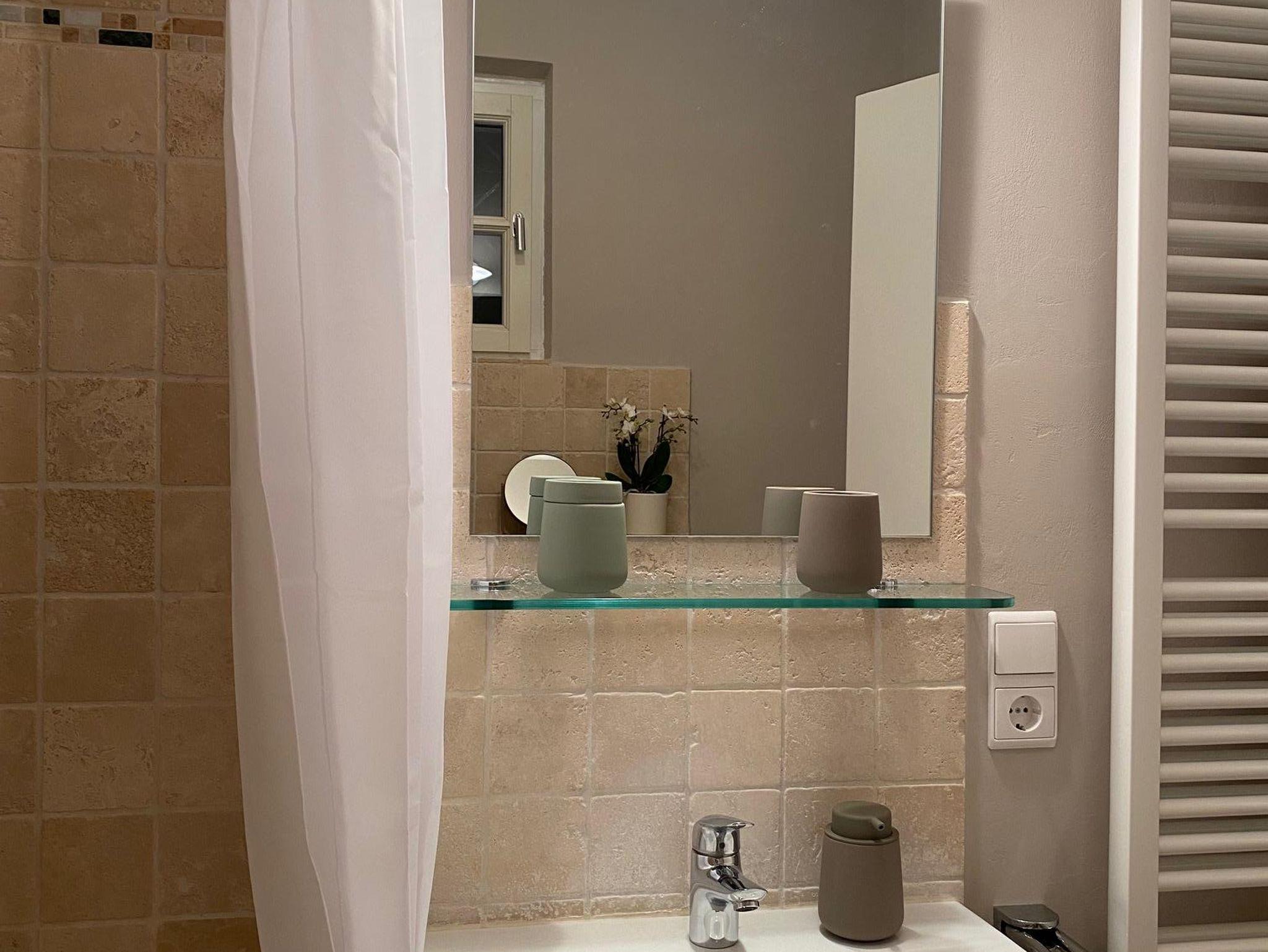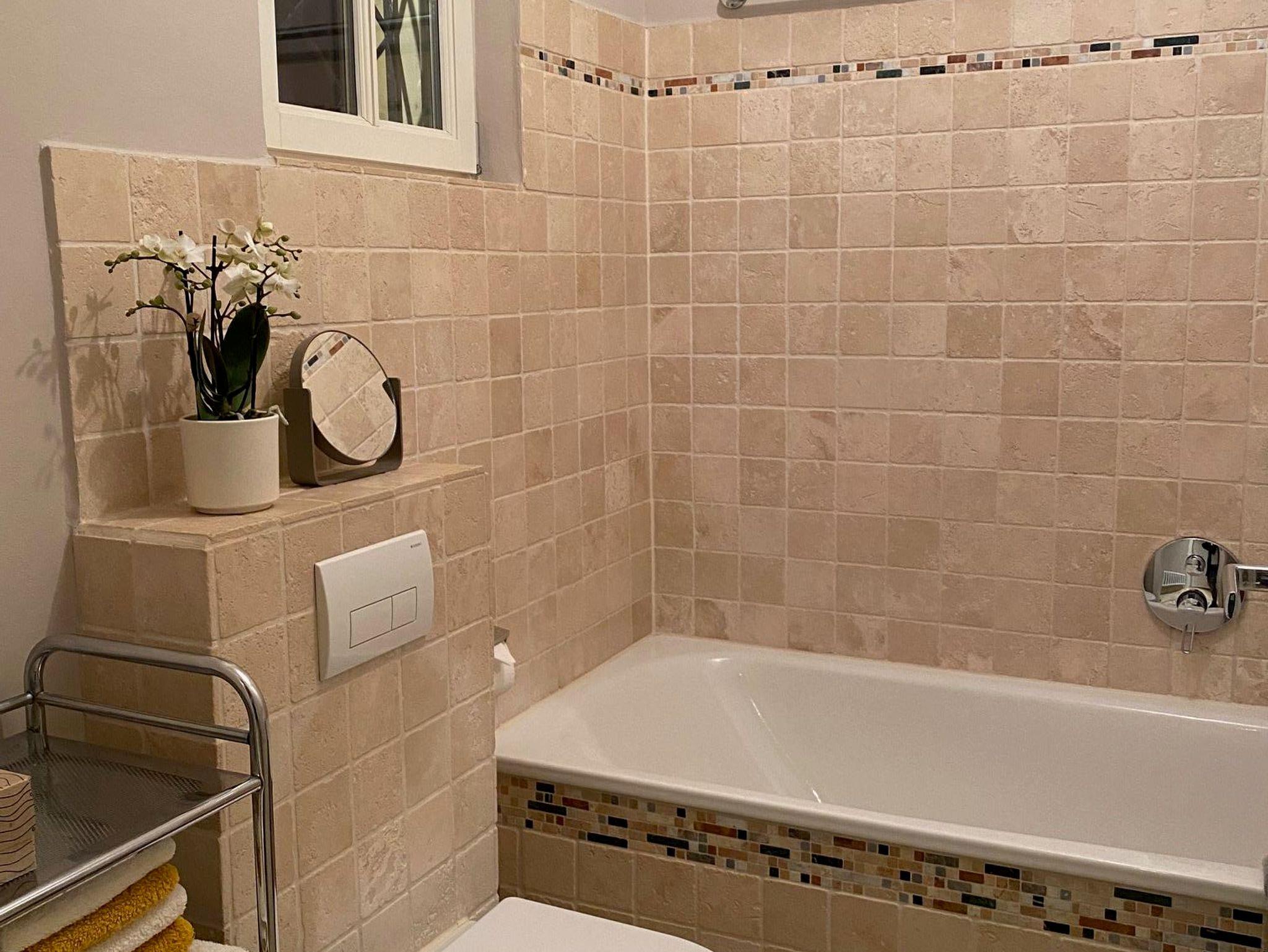 Bad: 3,60m² mit Badewanne mit Duschmöglichkeit, WC, Waschbecken, Fön, Marmorboden.