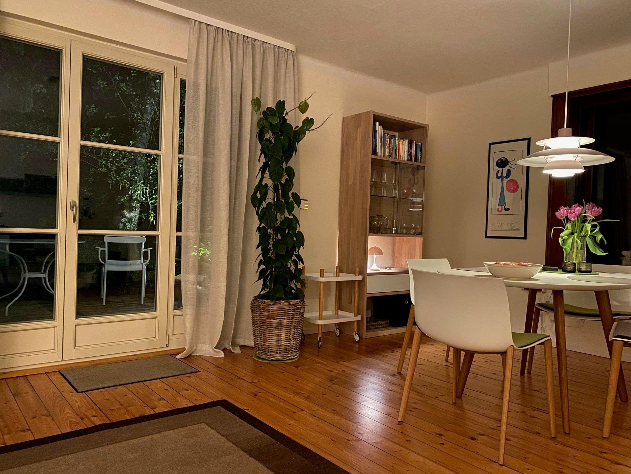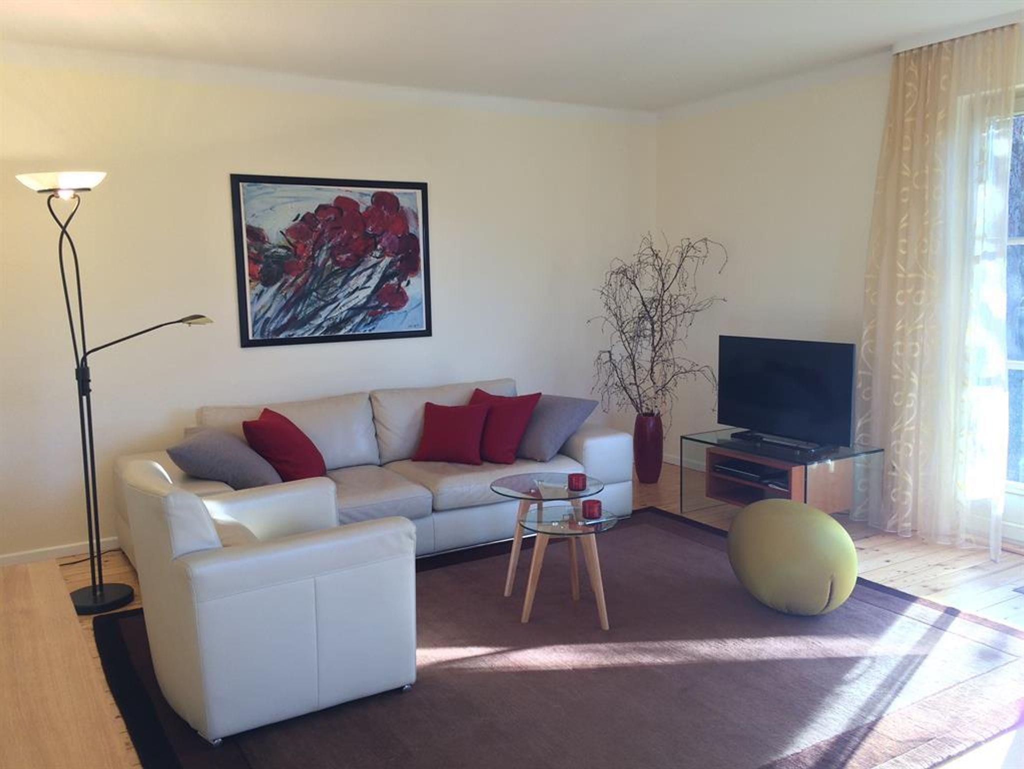 Wohn/Esszimmer: 29,00 m² mit hochwertiger Möblierung (Team 7, Arper), moderner Ledercouch und Sessel, TV mit Soundbar und Apple TV, Radio, Holzdielenboden und Teppich.