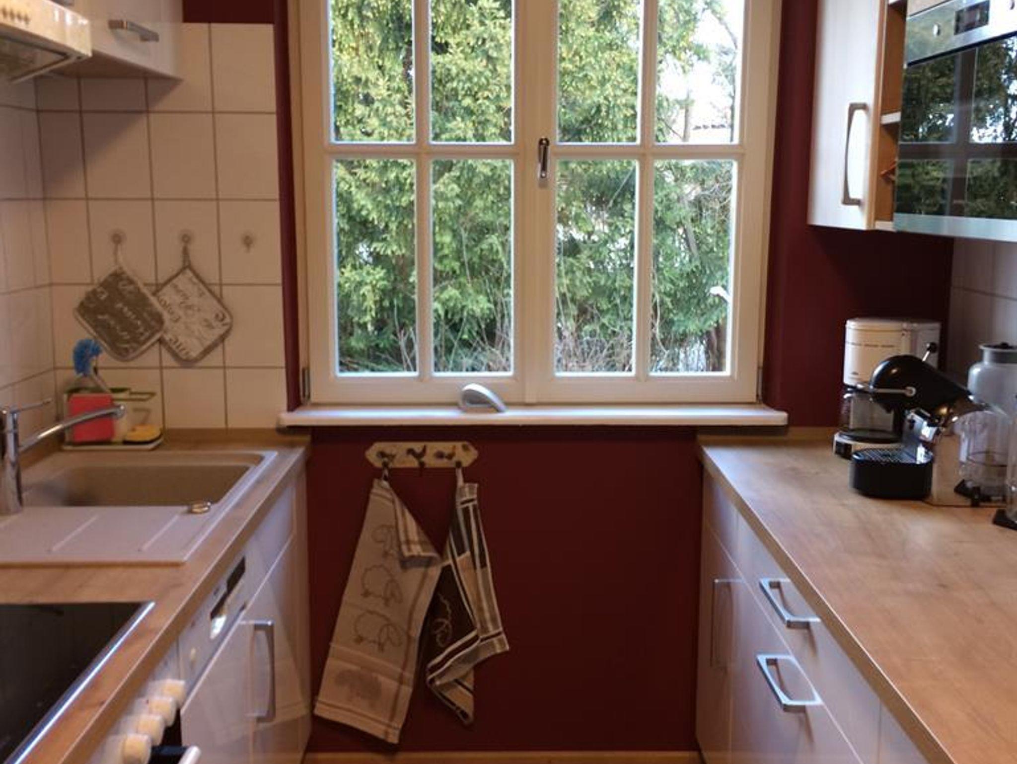 Küche: 8,20 m² mit E-Cerankochfeld, Backofen, Kühlschrank, Mikrowelle, Wasserkocher, Toaster, Geschirrspülmaschine, Kork-Designboden.