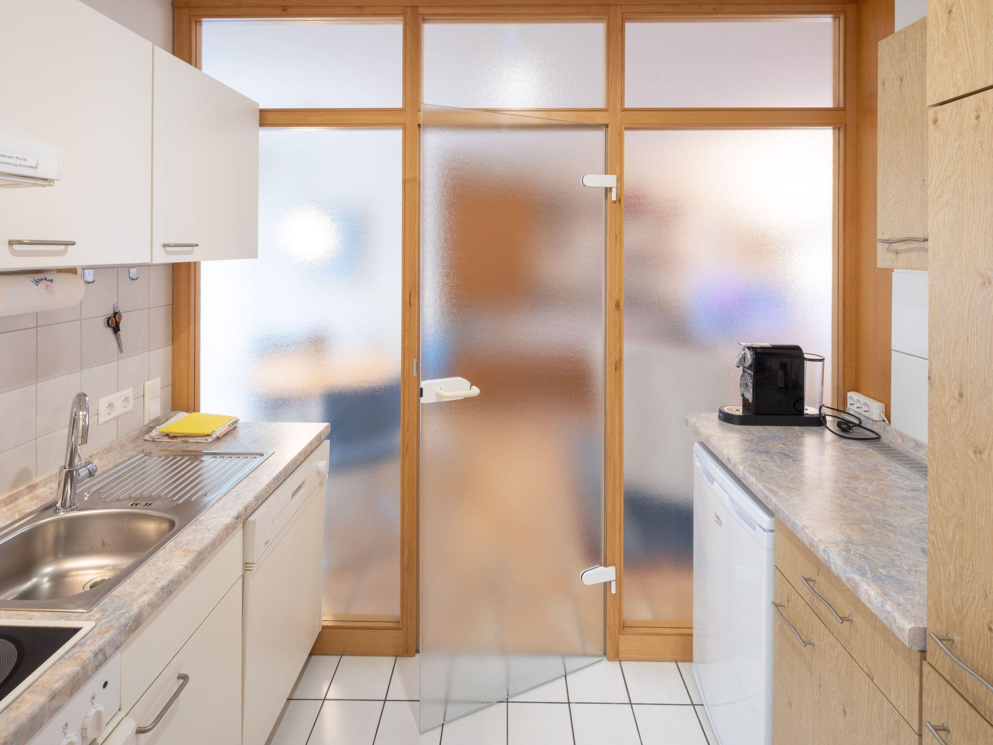 The studio (45 m2) is suitable for up to two people. It consists of a large living room/bedroom (33 m²), a fitted kitchen (dishwasher, coffee machine, microwave) and a bathroom with shower and WC. The living room is furnished with a double bed, wardrobe, two armchairs with coffee table, a wall unit and a dining table with 4 chairs. Other equipment: telephone, radio, large television, cable TV, DVD player. The flat has an east-facing terrace (approx. 10 m²) and a seating area in the south-facing garden.