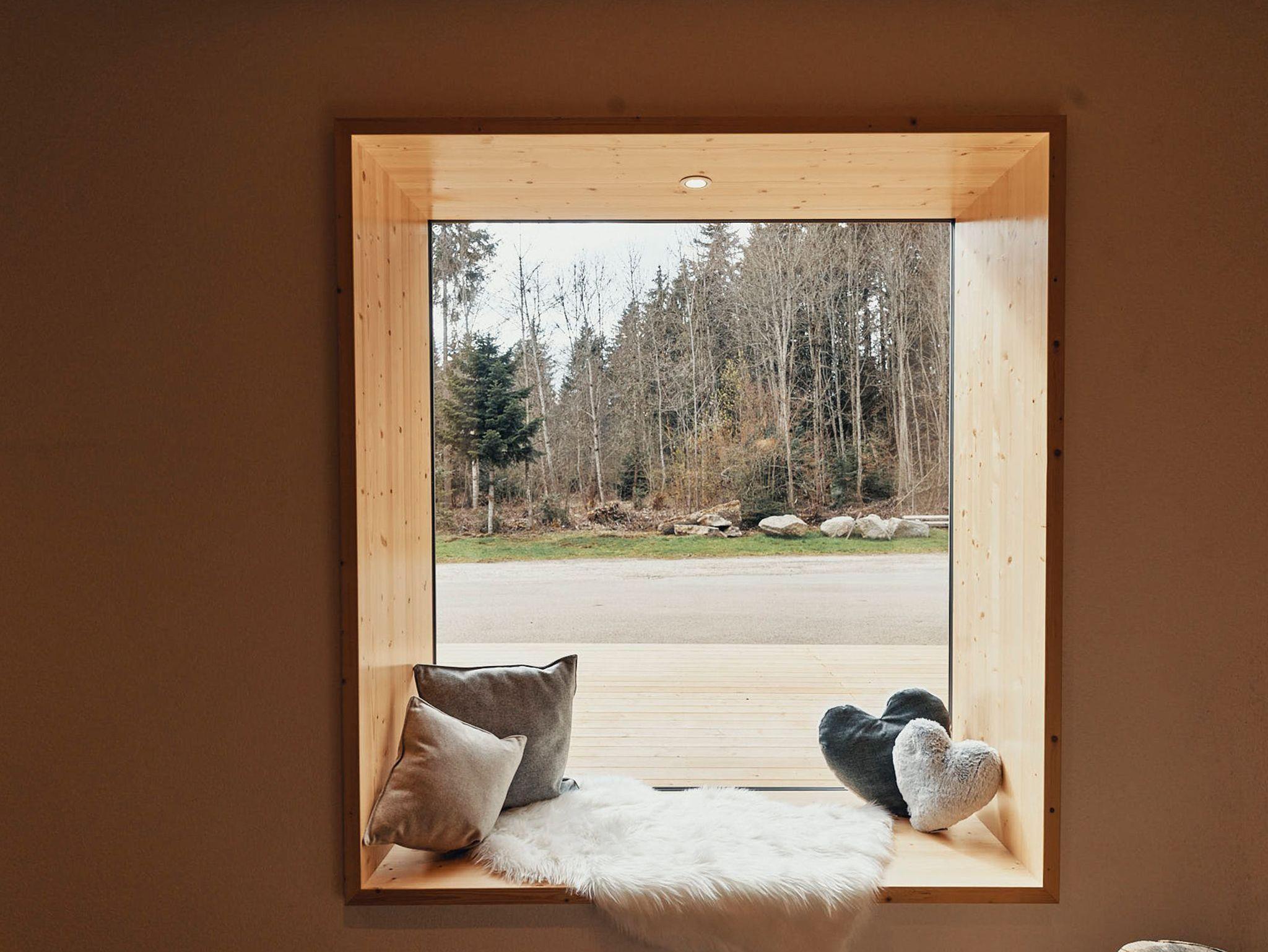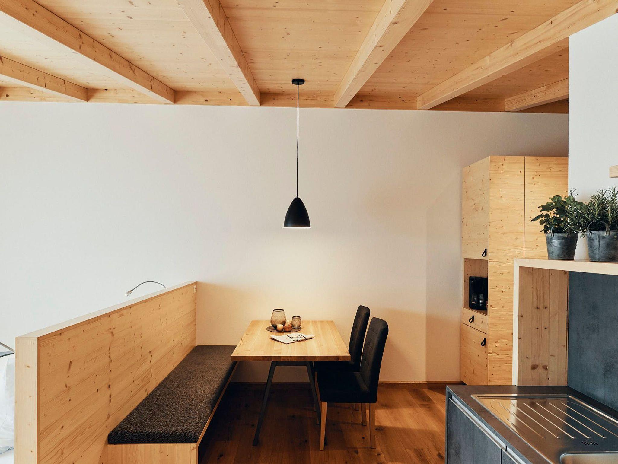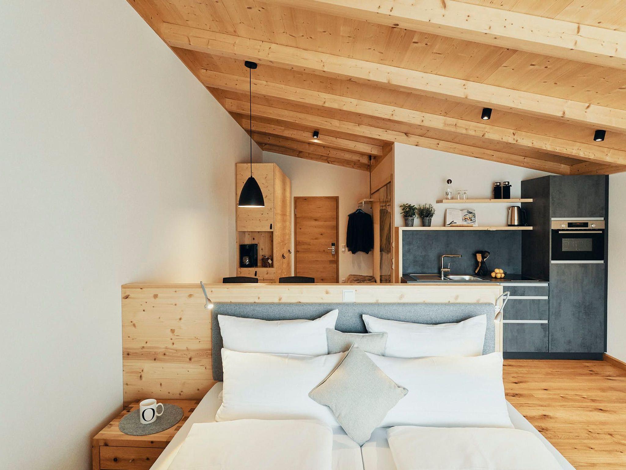 Acht einzigartige Apartments lichtdurchflutet und mit Platz für bis zu sechs Personen. Raumhohe Fenster lassen die Natur herein, während heimische Fichtenholzdecken eine Atmosphäre der Geborgenheit schaffen. Wohnen und Schlafen sind nur durch transparente Elemente getrennt, was den loftartigen Charakter der Räume unterstreicht.