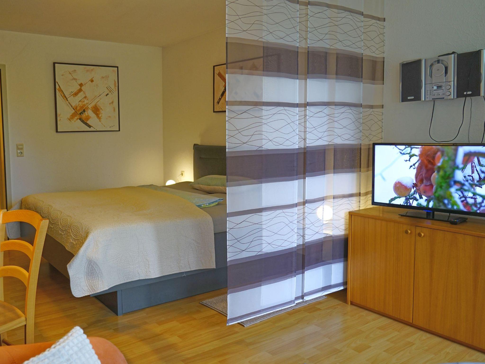 Doppelbett und Kleiderschrank sind durch einen Raumteiler vom Wohnbereich