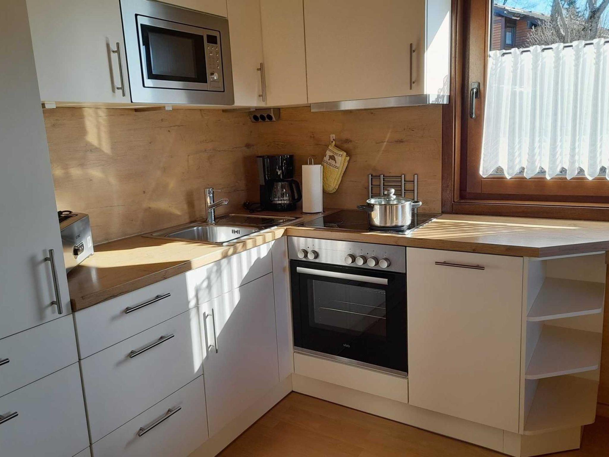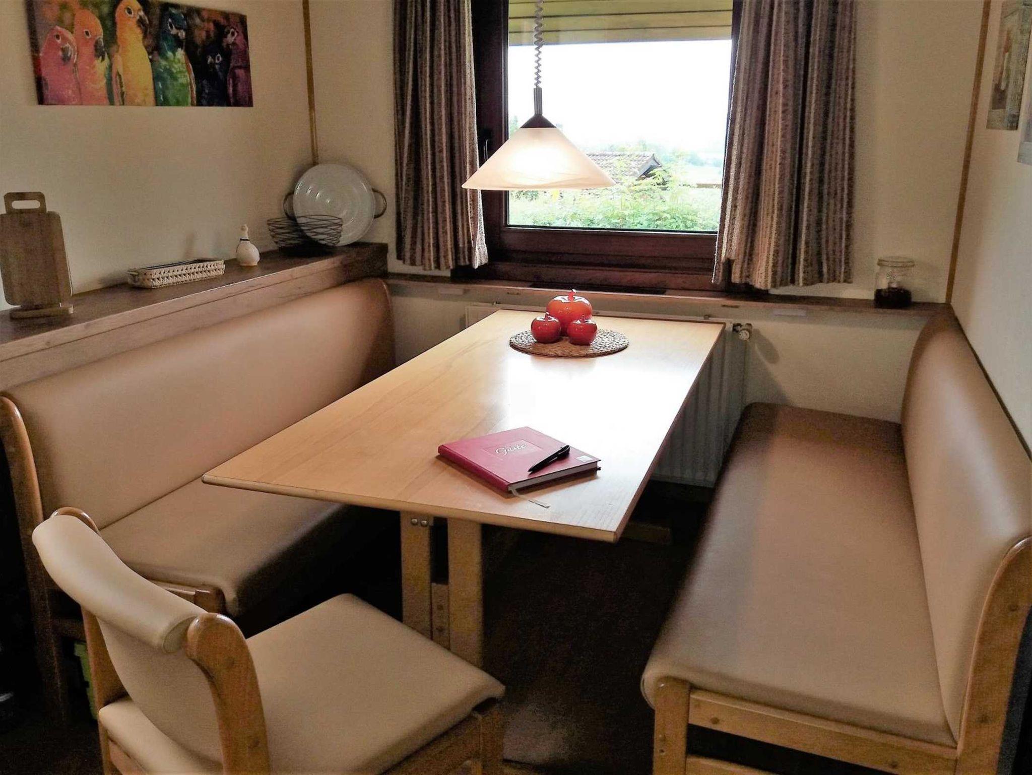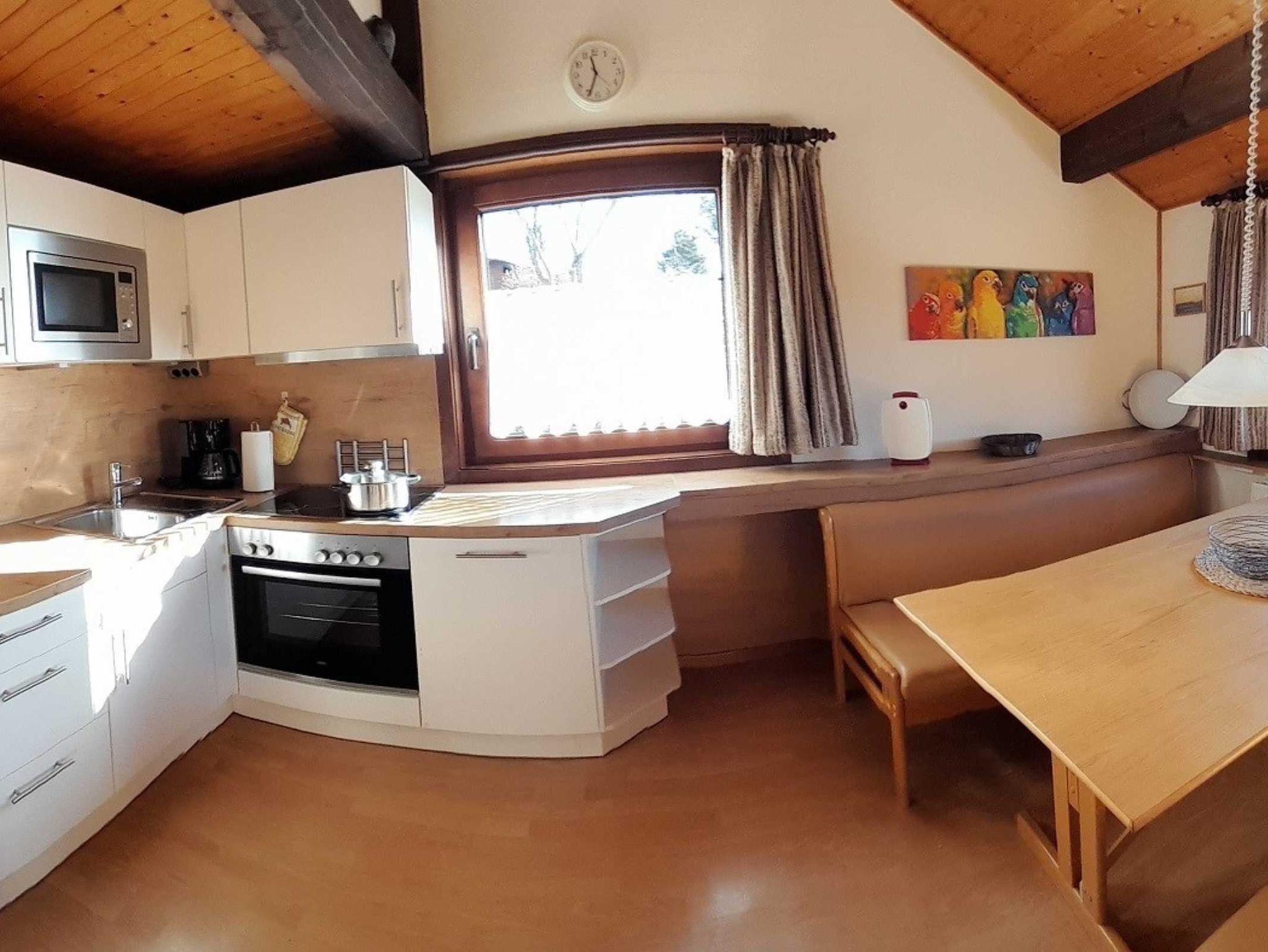 Die moderne Einbauküche ist komplett ausgestattet mit Spülmaschine, Mikrowelle, Kühlschrank mit Gefrierfach, Kaffeemaschine, Toaster, Wasserkocher und vielem mehr. Die integrierte Essecke hat Platz für bis zu 6 Personen und bietet Ihnen bereits zum Frühstück eine traumhafte Fernsicht.