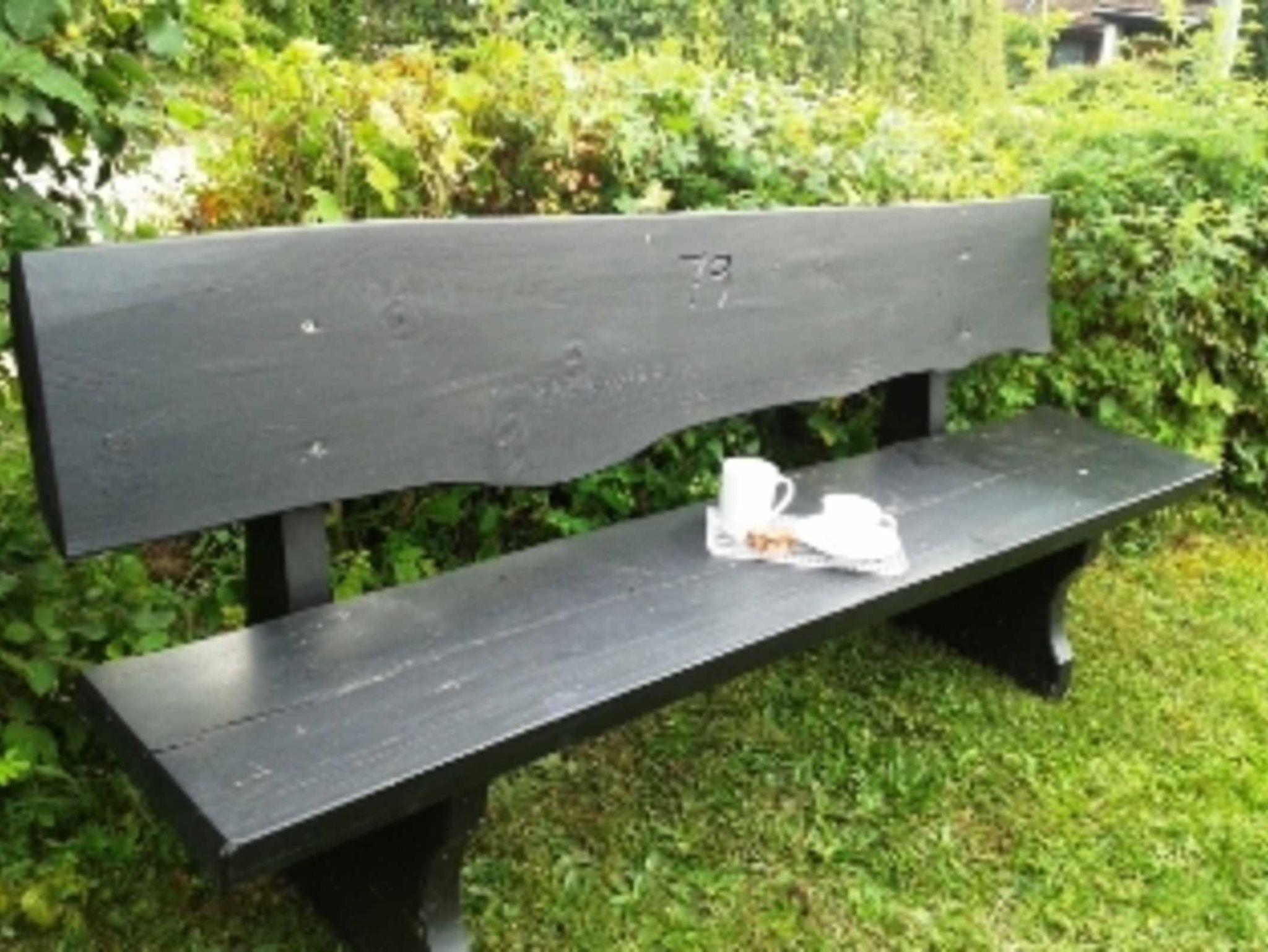 Wir haben einen Garten mit Südterrasse und einer rustikalen Holzbank für die kleine Pause zwischendurch.