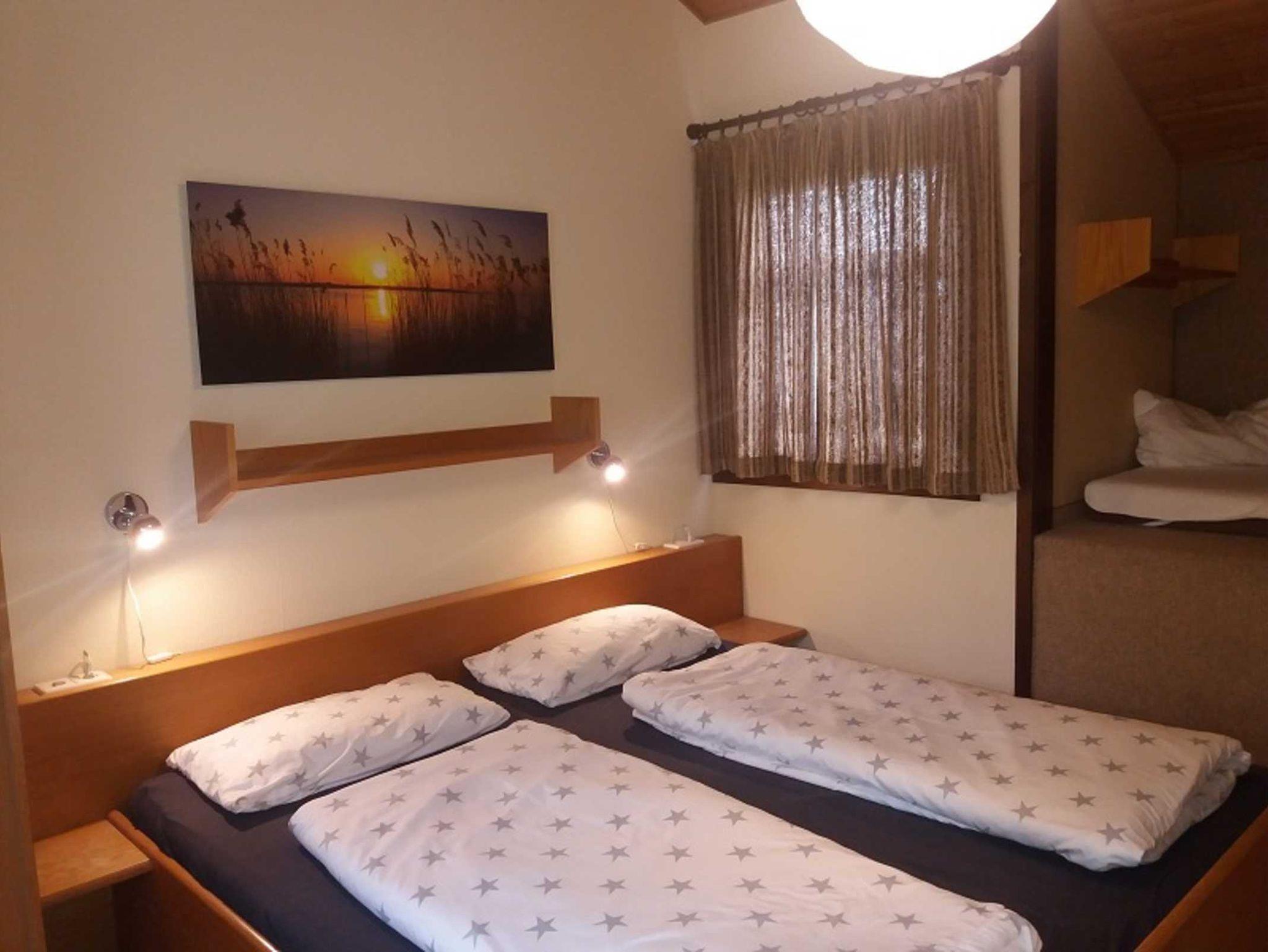 Beide Schlafzimmer sind jeweils mit einem Doppelbett, Schrank, Stuhl und Garderobe ausgestattet. Eines der Schlafzimmer verfügt zusätzlich über zwei Betten auf einer Empore. Beide Schlafzimmer verfügen über Jalousien.