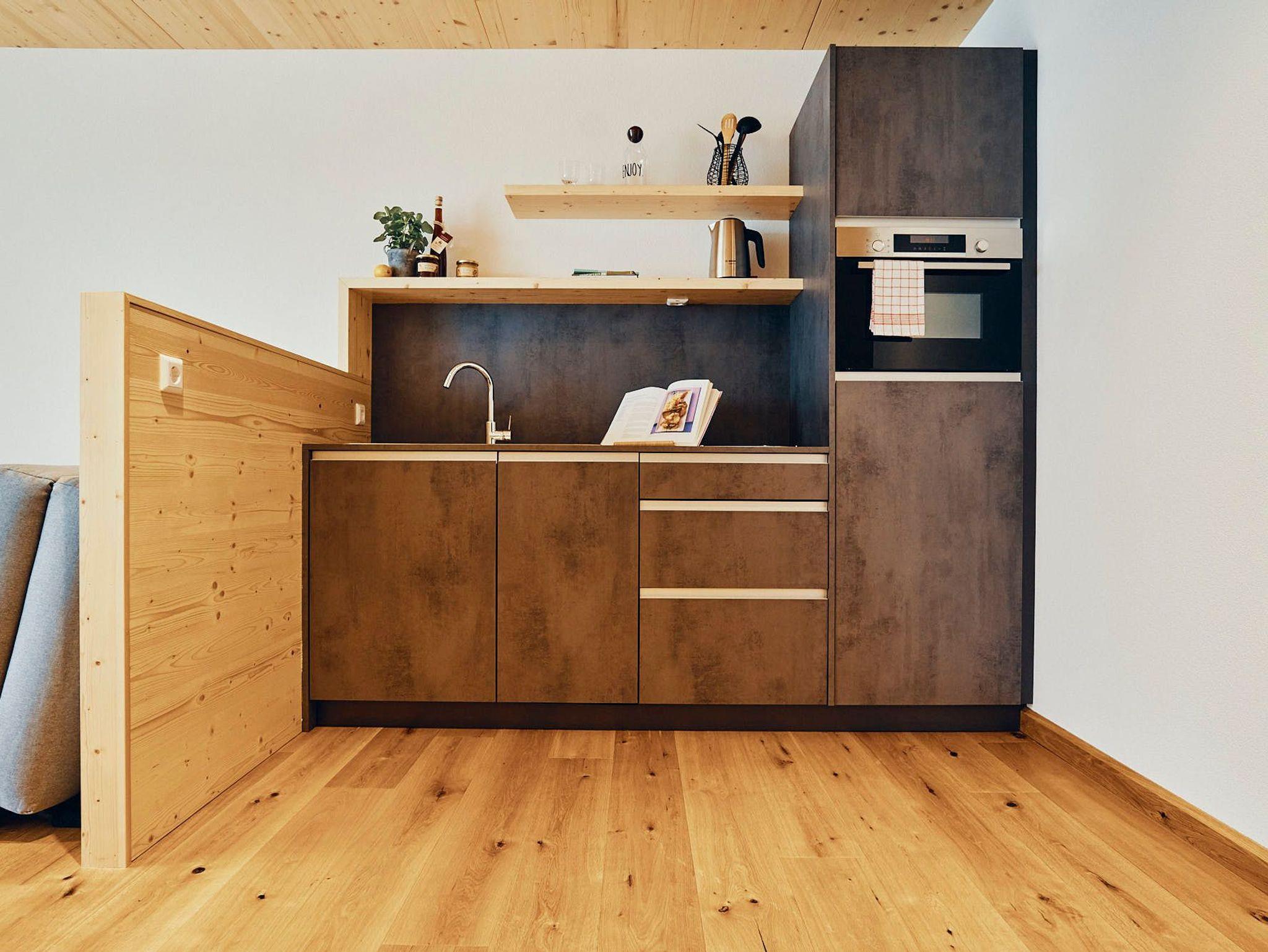 Fließende Übergänge verleihen Leichtigkeit, während handgefertigte Möbel aus der Tischlerwerkstatt individuelle Akzente setzen. Der gehobelte Eichenholzboden natürlich naturgeölt sorgt für eine spürbare Erdung und angenehme Wärme. Die kompakte, aber voll ausgestattete Küche macht Selbstversorgung zum Vergnügen. Eine ausziehbare Schlafcouch bietet zusätzlichen Raum für Gäste oder Tagträumer.