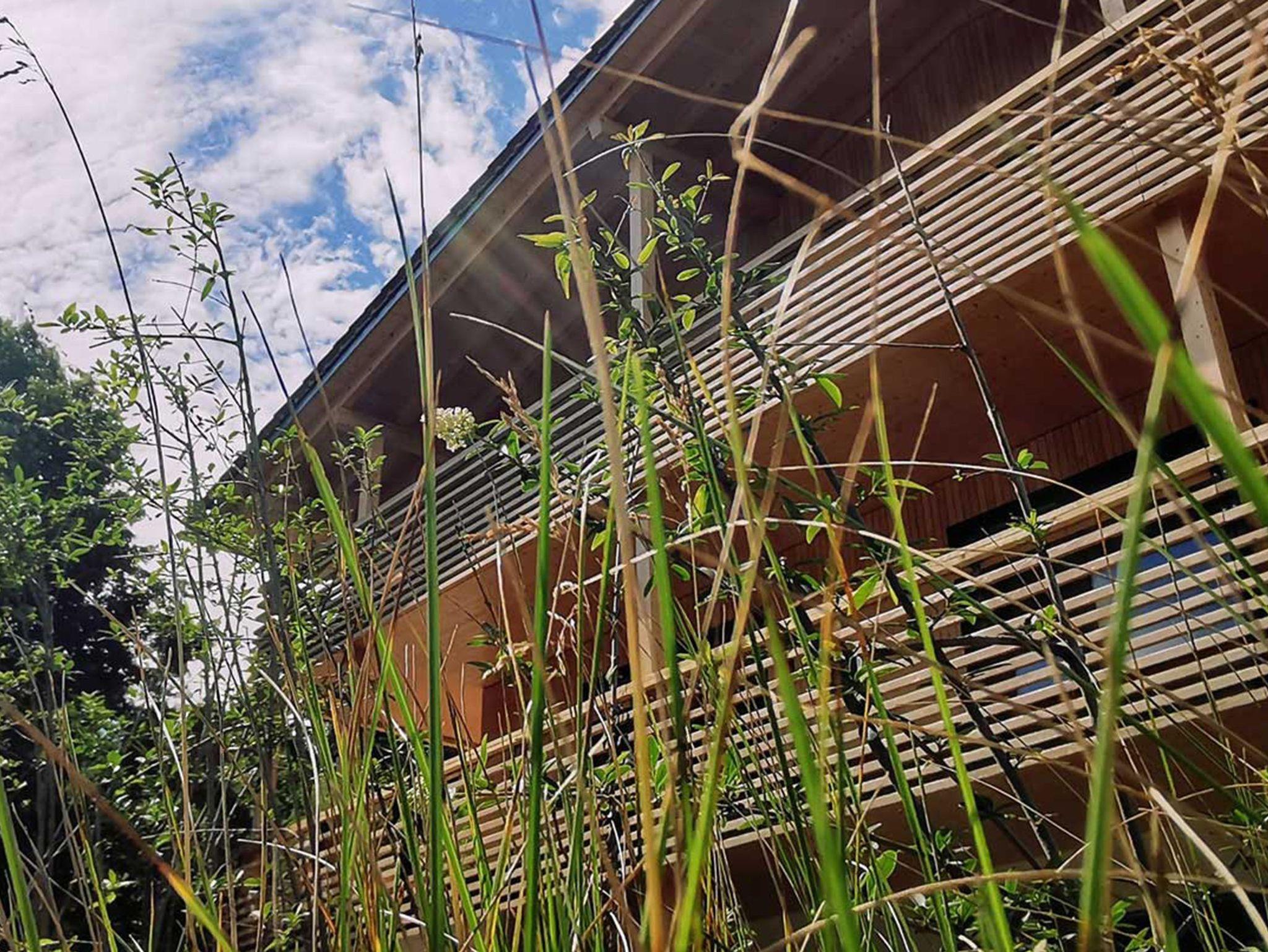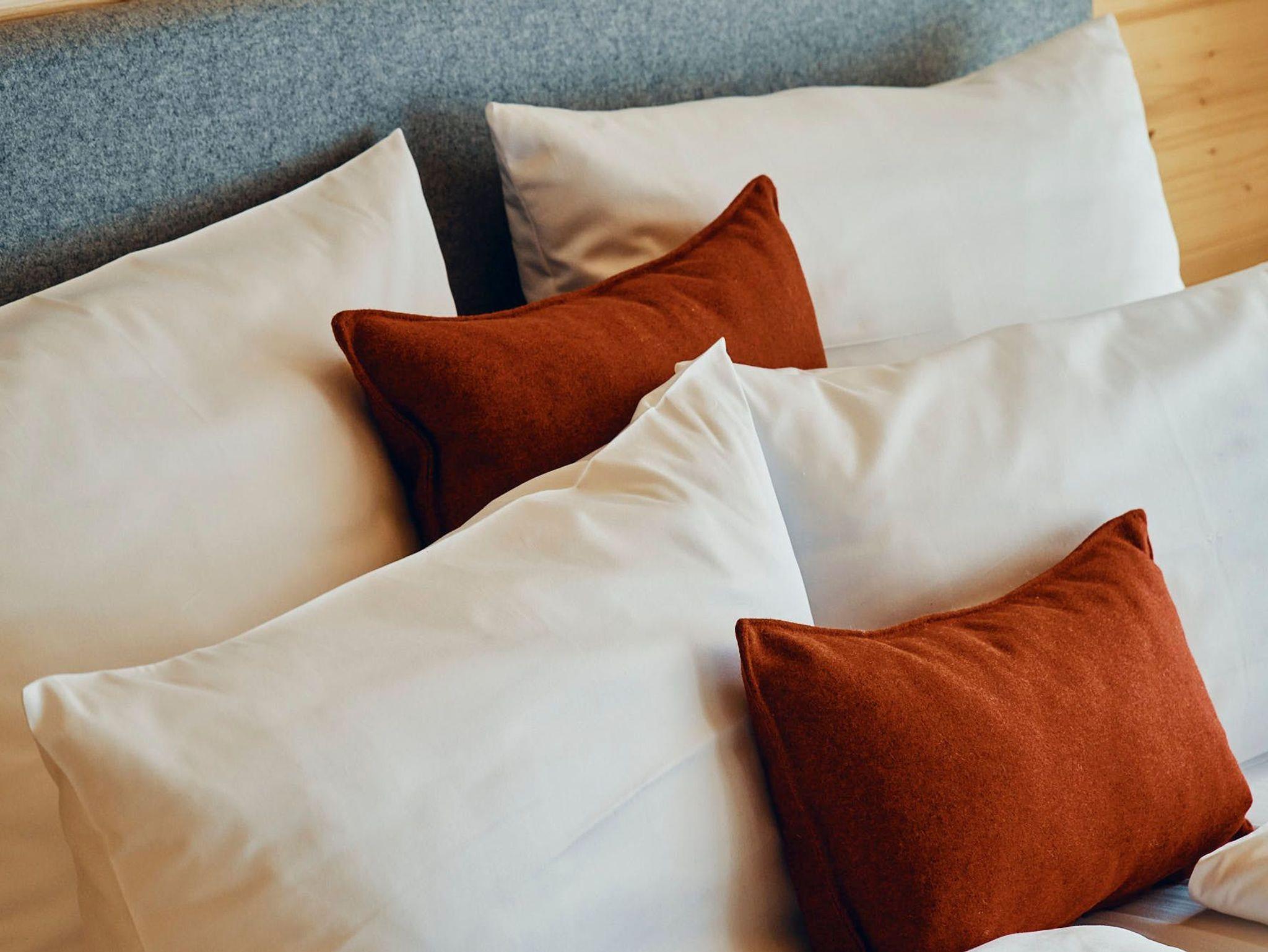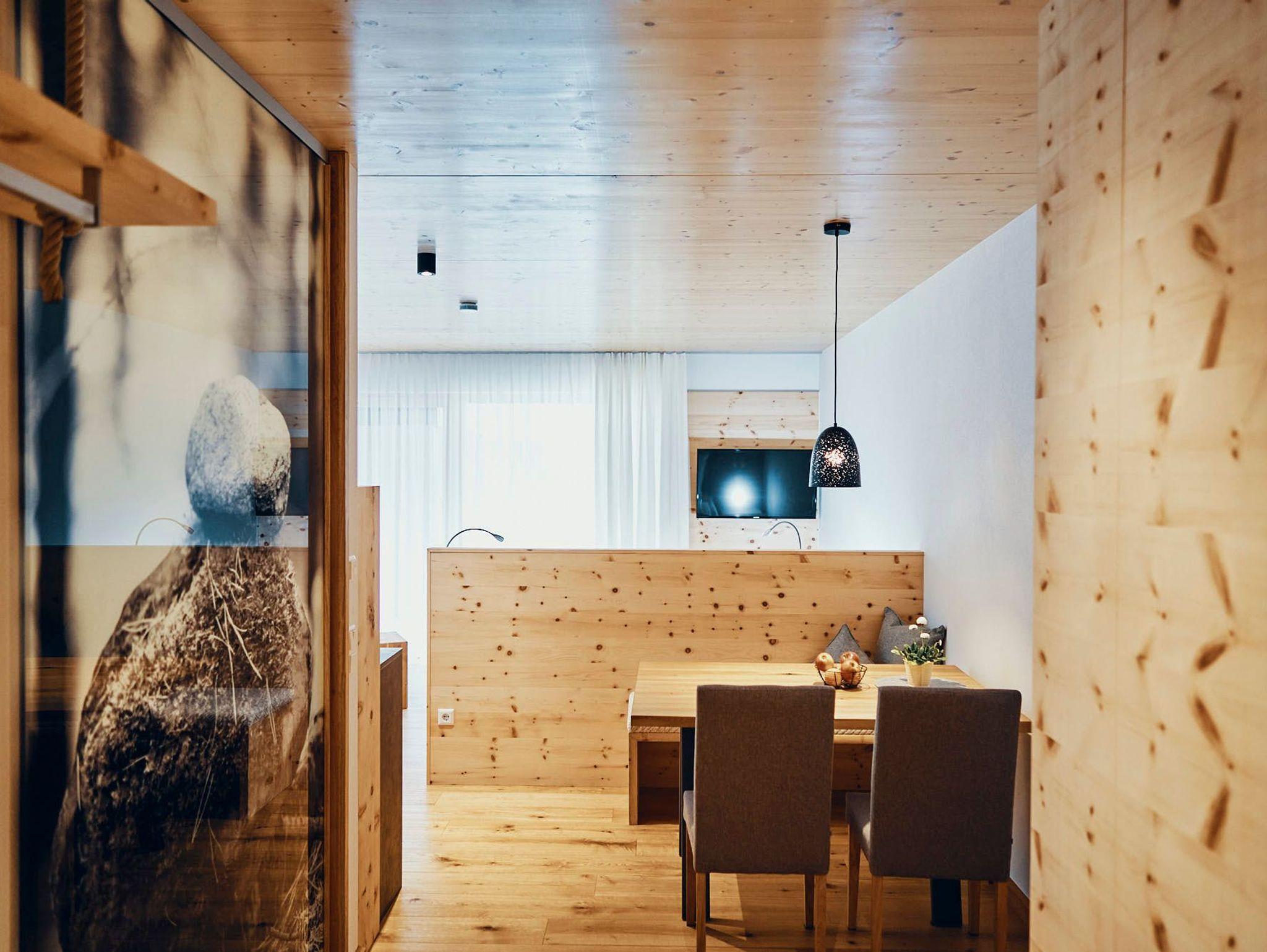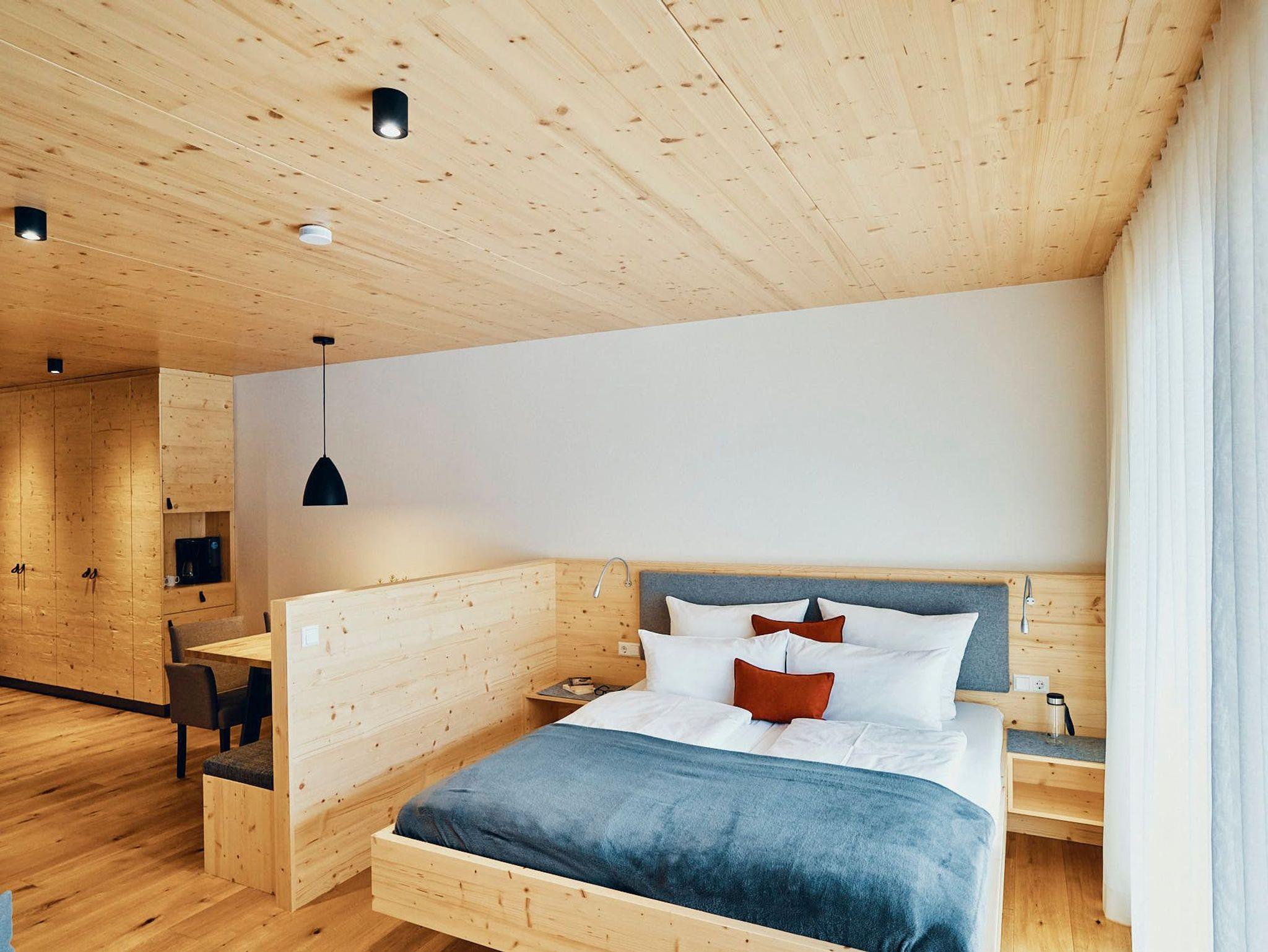 Acht einzigartige Apartments lichtdurchflutet und mit Platz für bis zu sechs Personen. Raumhohe Fenster lassen die Natur herein, während heimische Fichtenholzdecken eine Atmosphäre der Geborgenheit schaffen. Wohnen und Schlafen sind nur durch transparente Elemente getrennt, was den loftartigen Charakter der Räume unterstreicht.