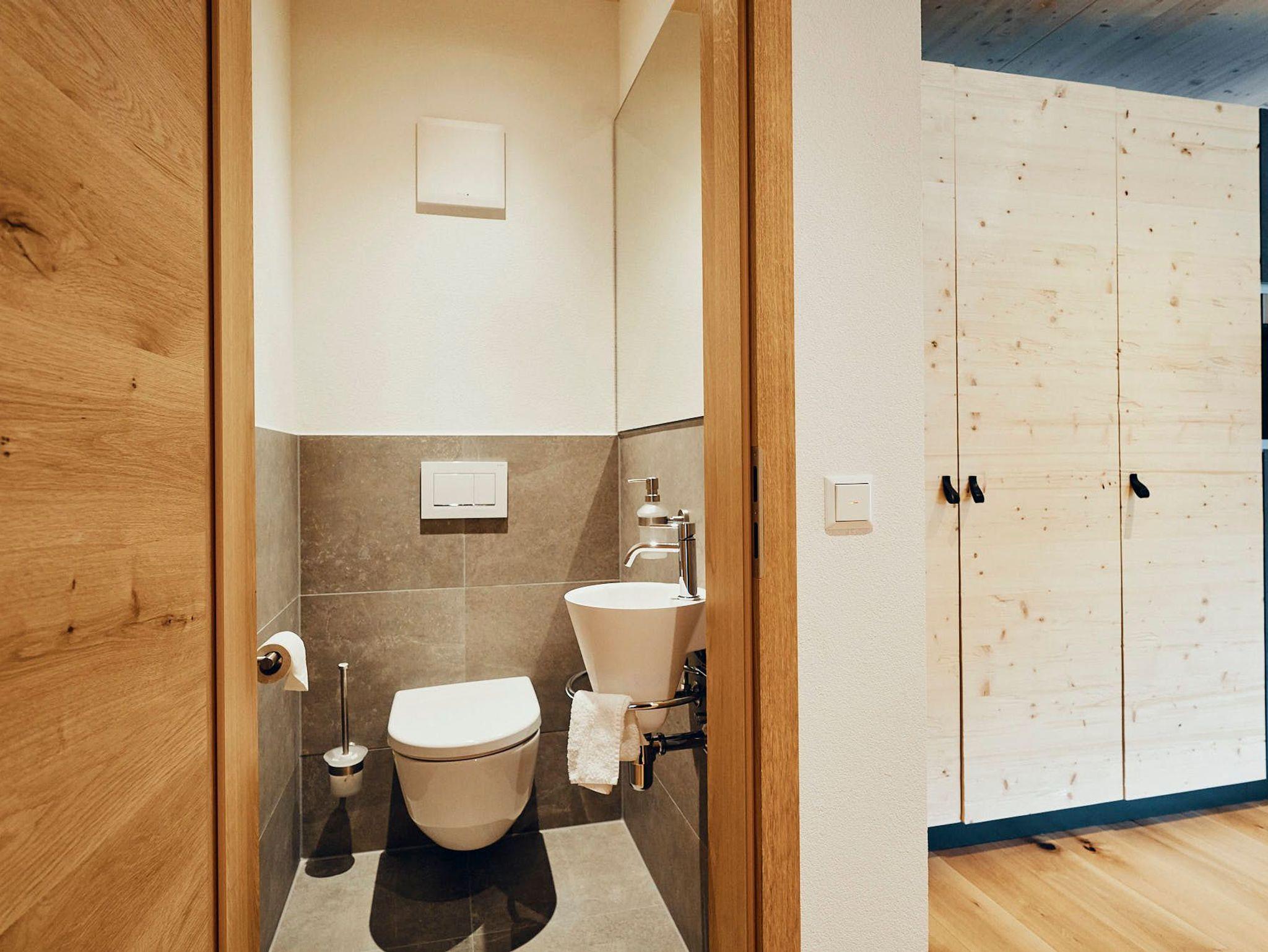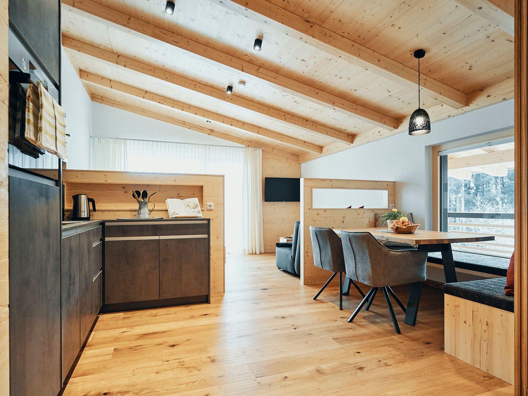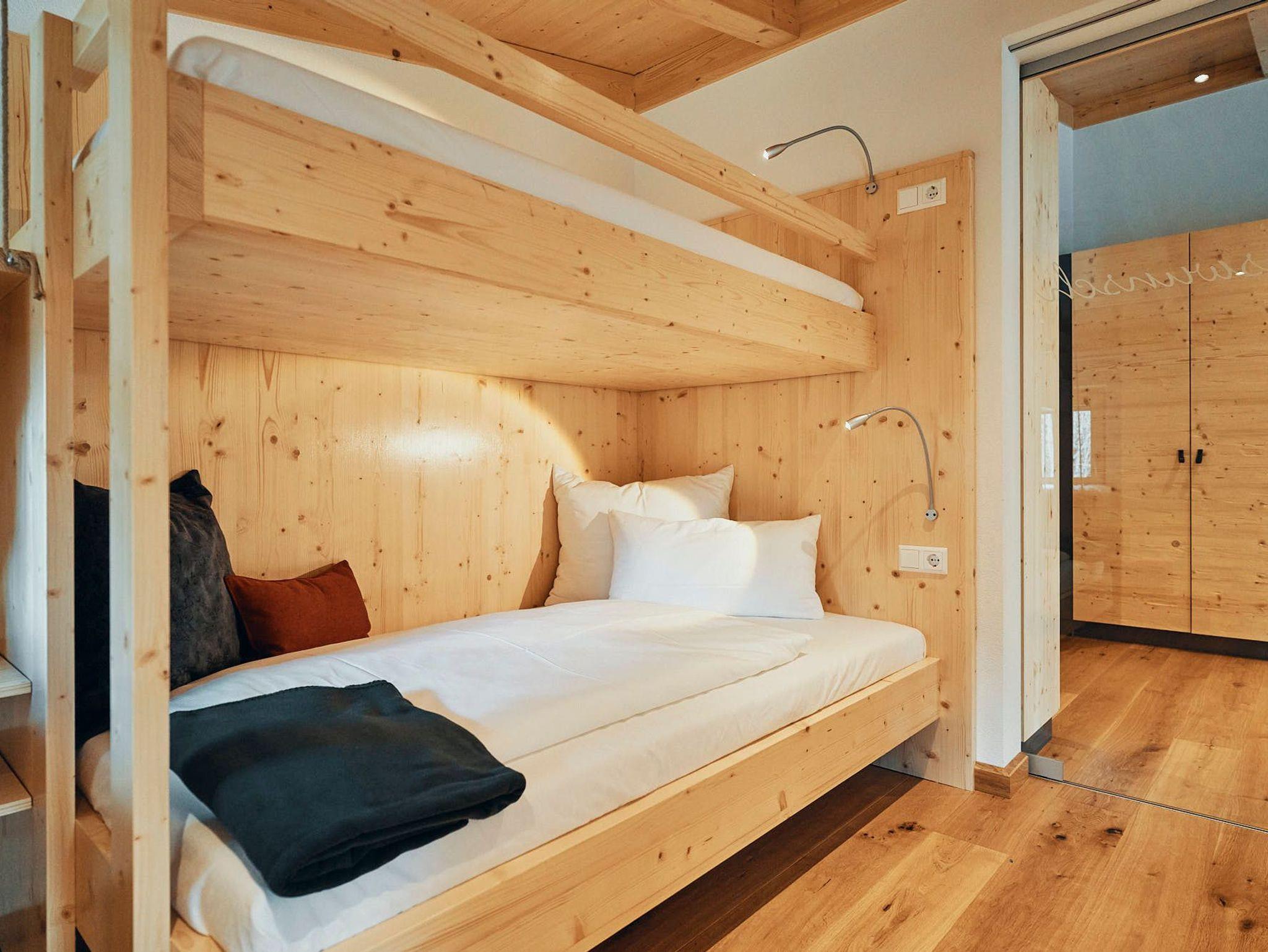 Acht einzigartige Apartments lichtdurchflutet und mit Platz für bis zu sechs Personen. Raumhohe Fenster lassen die Natur herein, während heimische Fichtenholzdecken eine Atmosphäre der Geborgenheit schaffen. Wohnen und Schlafen sind nur durch transparente Elemente getrennt, was den loftartigen Charakter der Räume unterstreicht.
