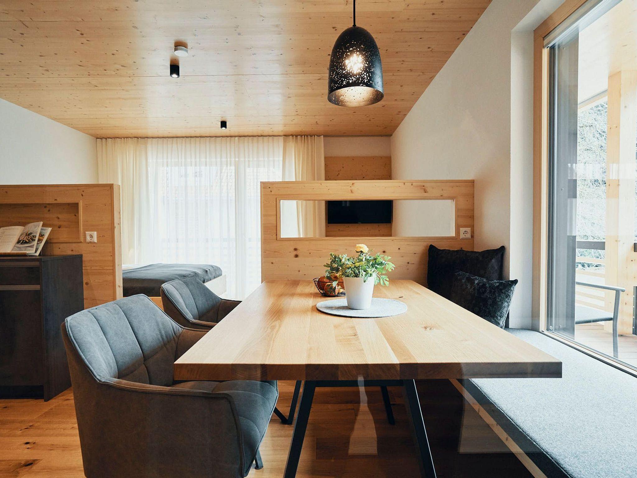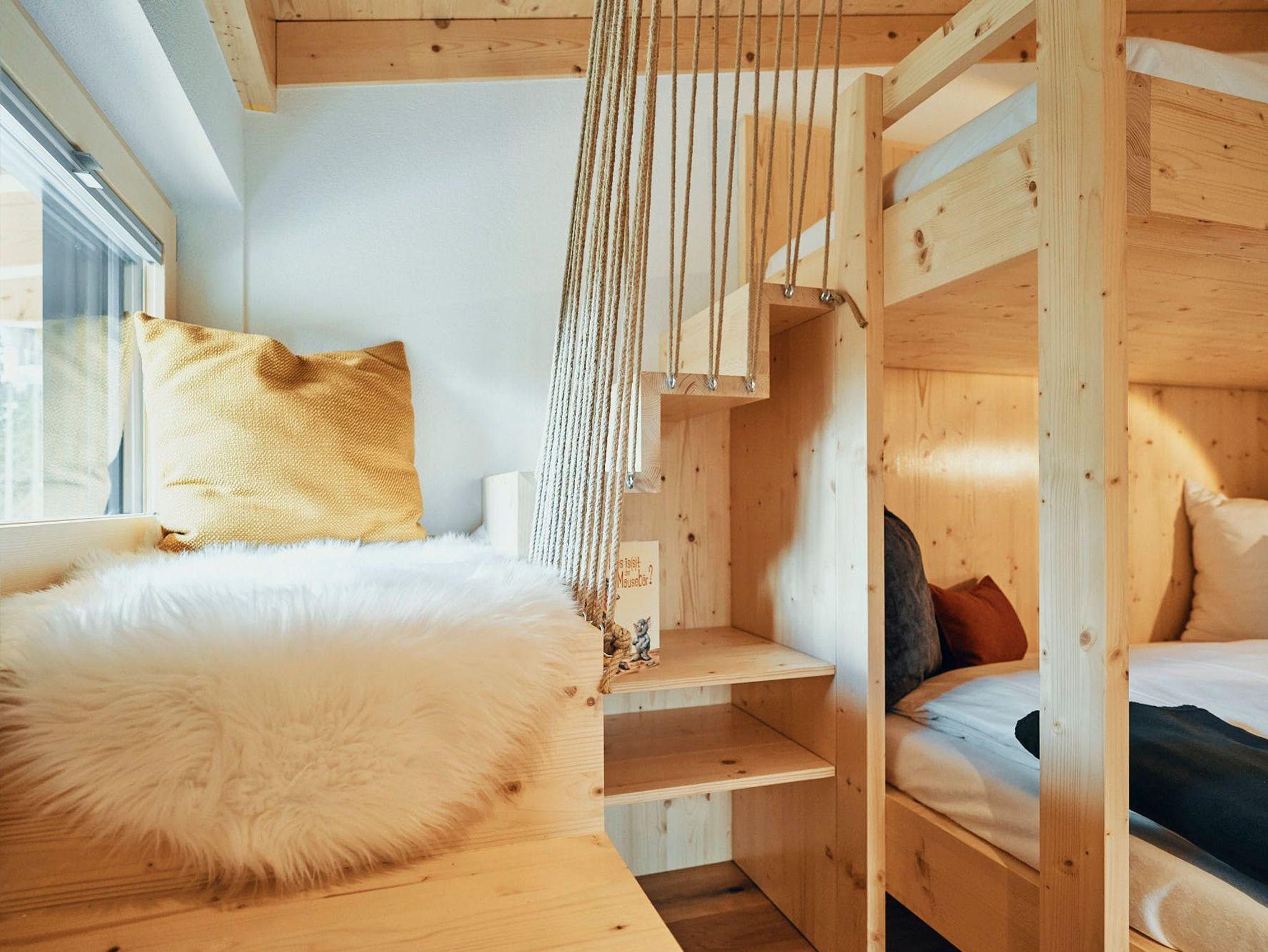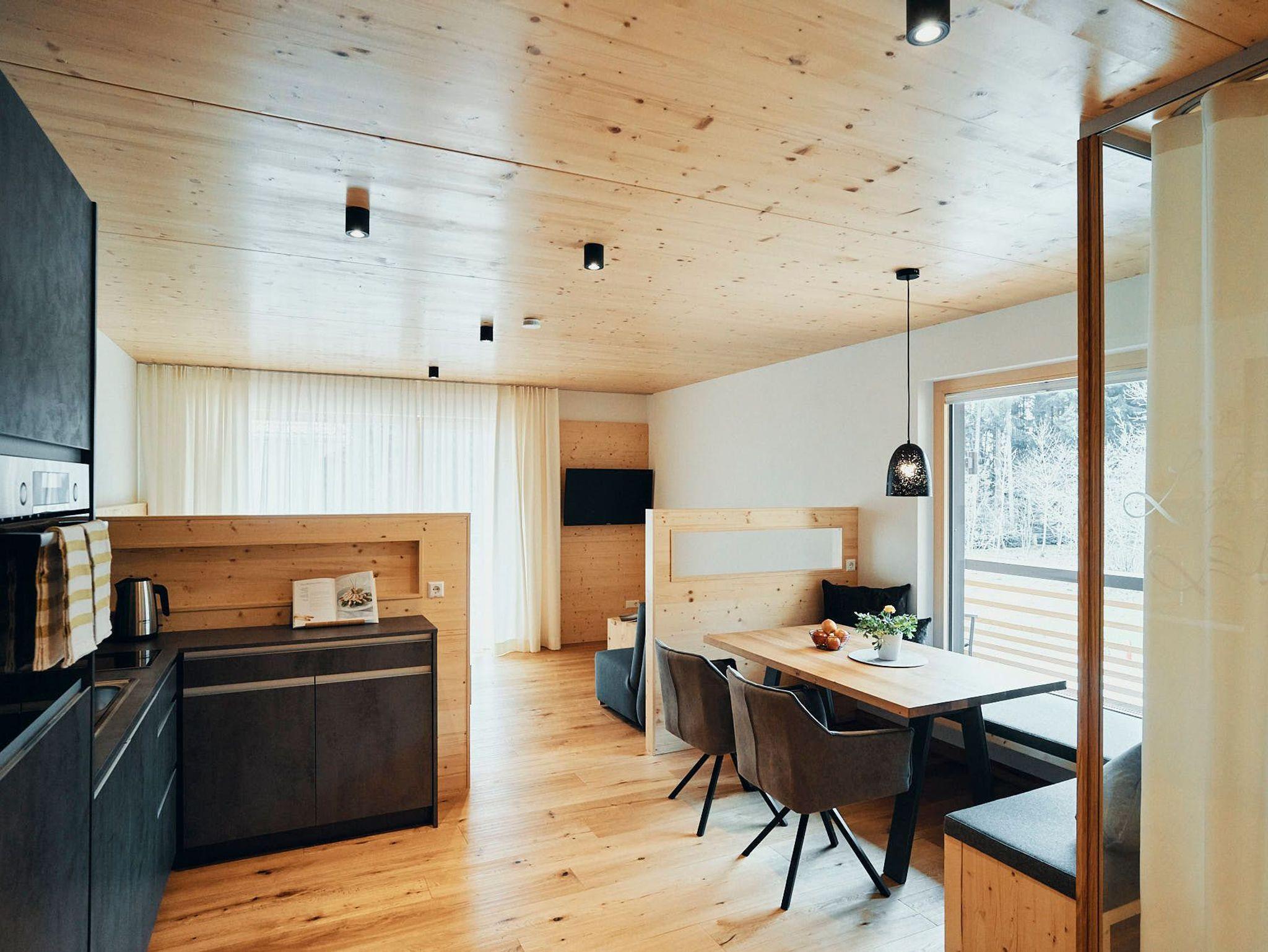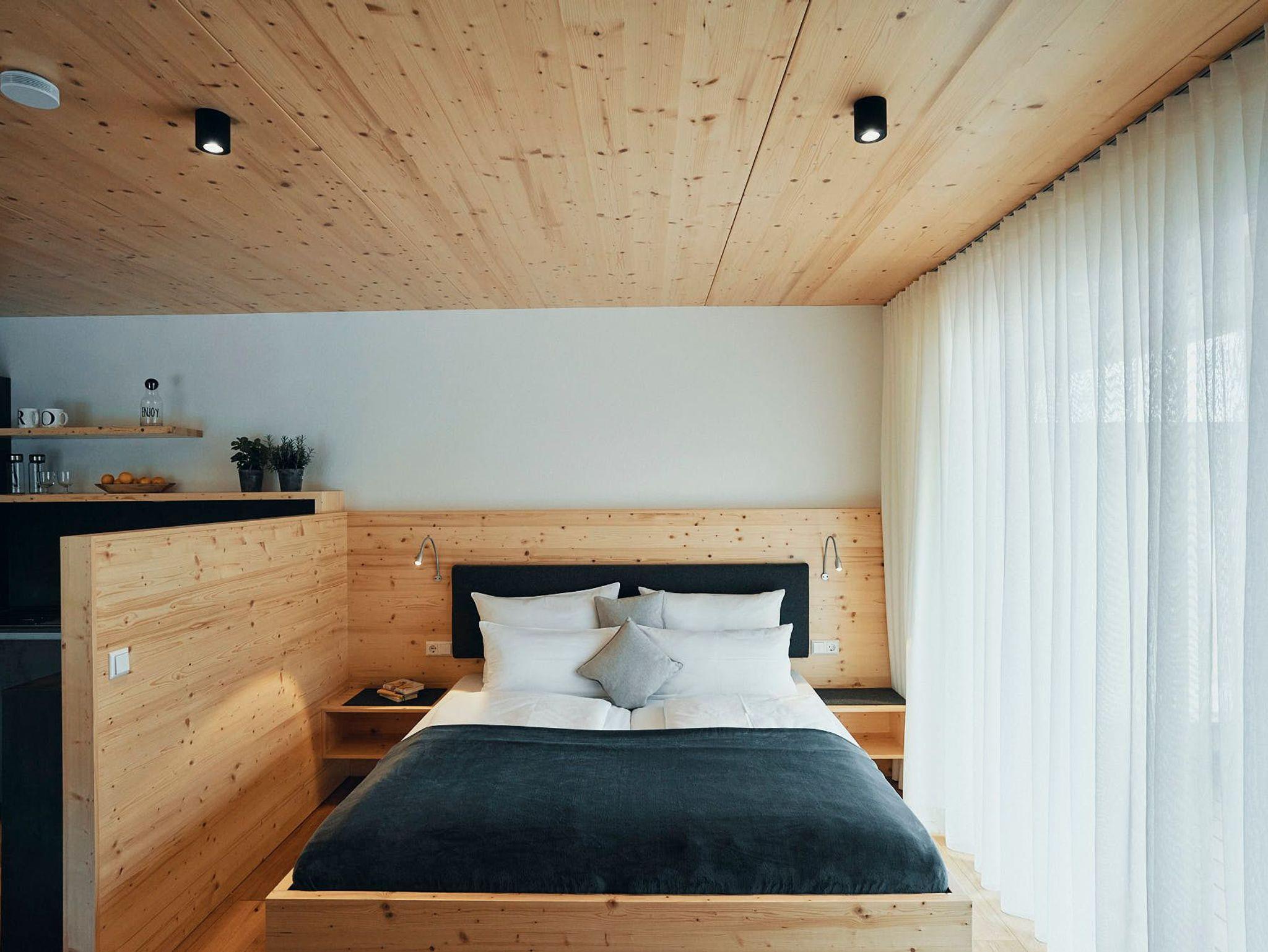 Acht einzigartige Apartments lichtdurchflutet und mit Platz für bis zu sechs Personen. Raumhohe Fenster lassen die Natur herein, während heimische Fichtenholzdecken eine Atmosphäre der Geborgenheit schaffen. Wohnen und Schlafen sind nur durch transparente Elemente getrennt, was den loftartigen Charakter der Räume unterstreicht.