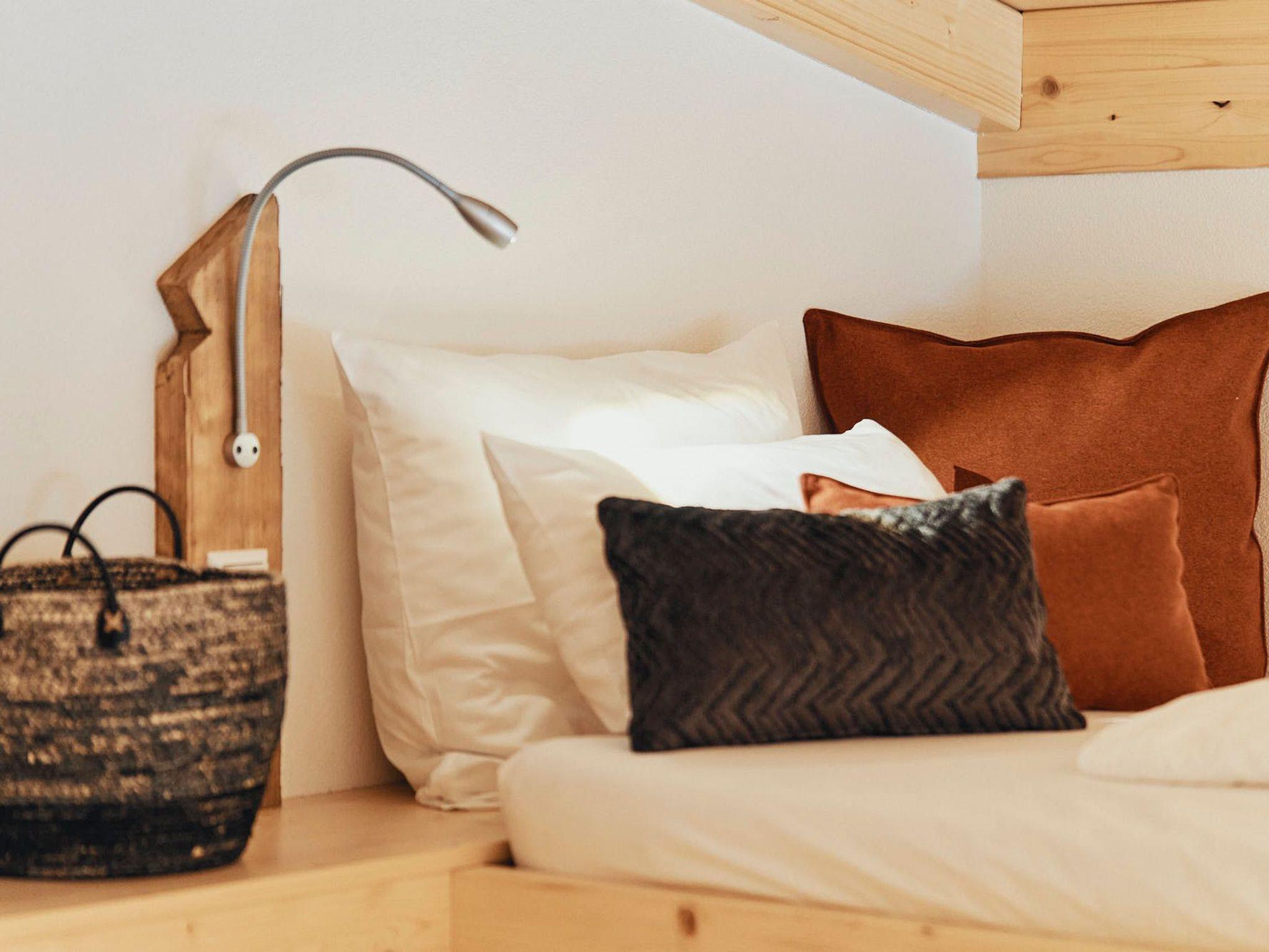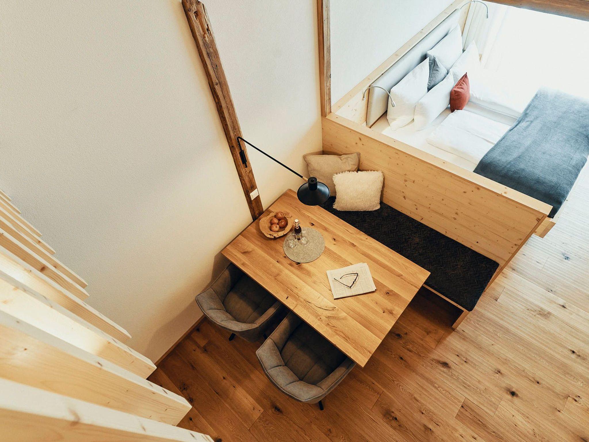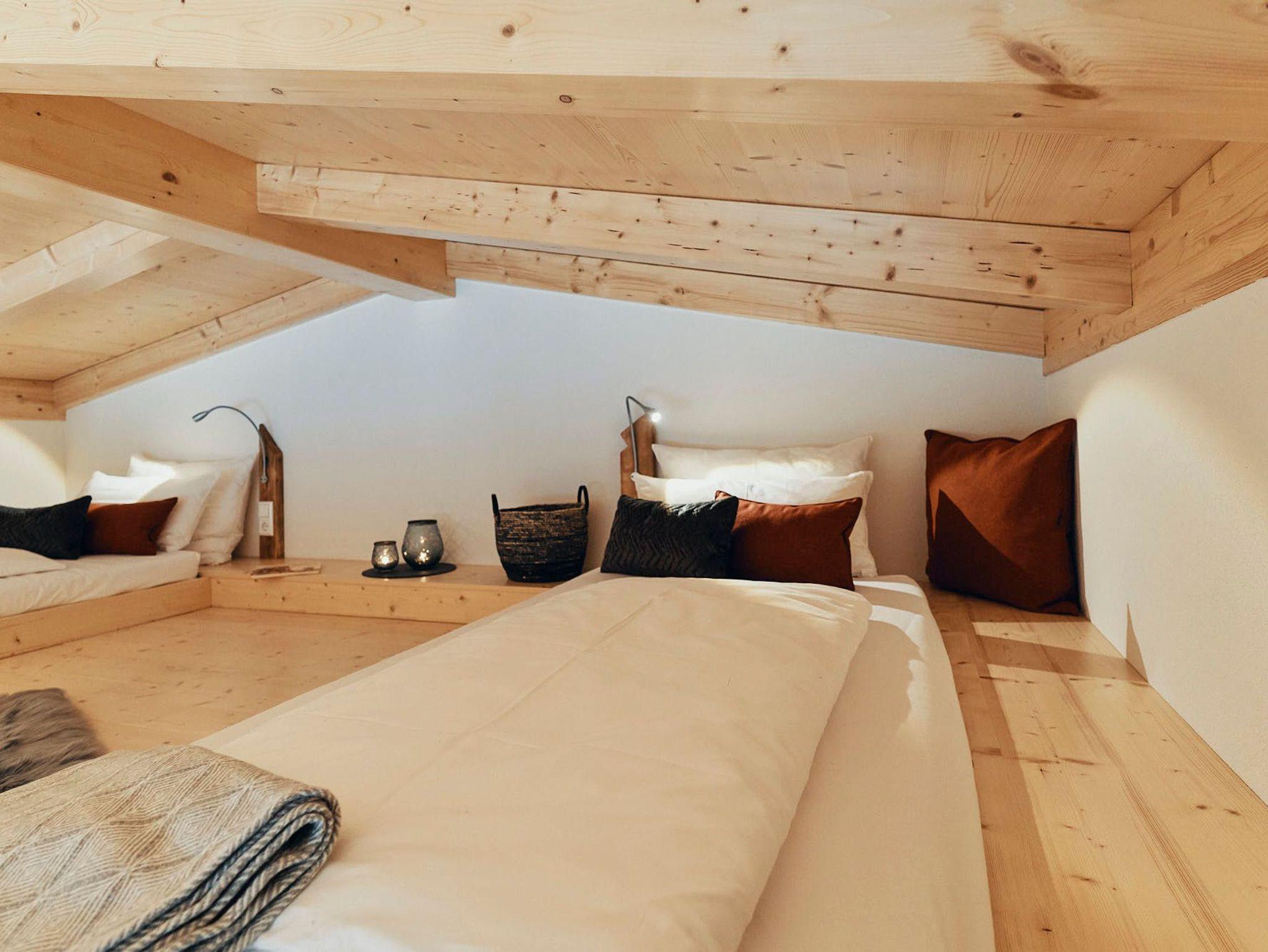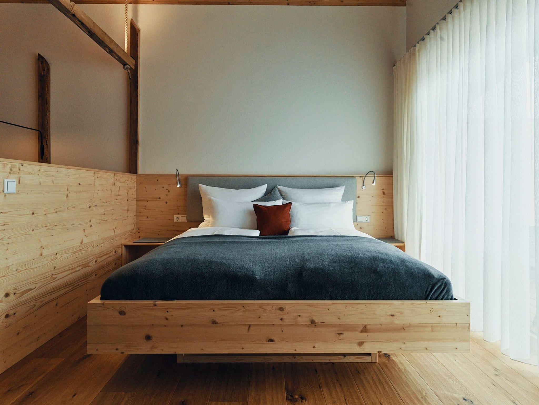 Acht einzigartige Apartments lichtdurchflutet und mit Platz für bis zu sechs Personen. Raumhohe Fenster lassen die Natur herein, während heimische Fichtenholzdecken eine Atmosphäre der Geborgenheit schaffen. Wohnen und Schlafen sind nur durch transparente Elemente getrennt, was den loftartigen Charakter der Räume unterstreicht.