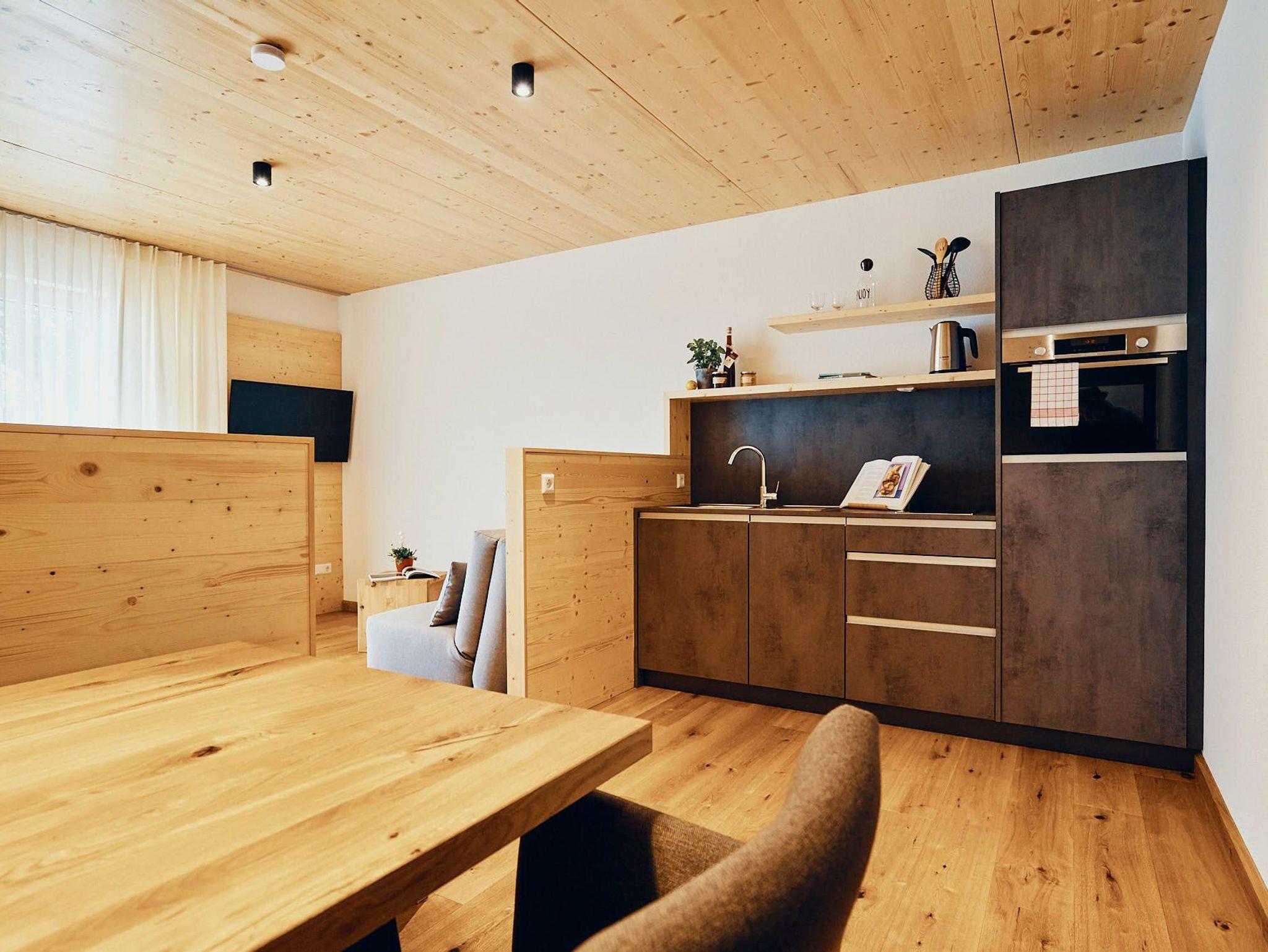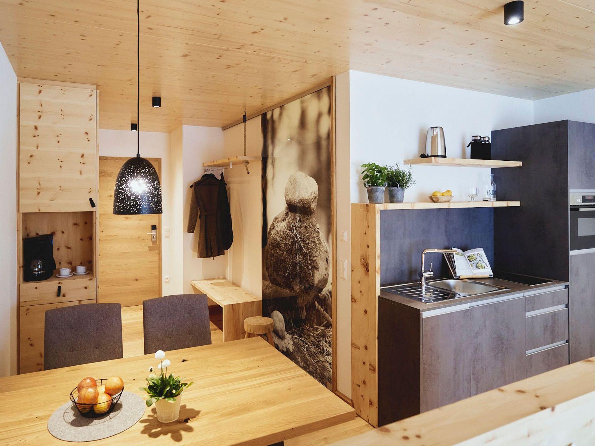 Fließende Übergänge verleihen Leichtigkeit, während handgefertigte Möbel aus der Tischlerwerkstatt individuelle Akzente setzen. Der gehobelte Eichenholzboden natürlich naturgeölt sorgt für eine spürbare Erdung und angenehme Wärme. Die kompakte, aber voll ausgestattete Küche macht Selbstversorgung zum Vergnügen. Eine ausziehbare Schlafcouch bietet zusätzlichen Raum für Gäste oder Tagträumer.