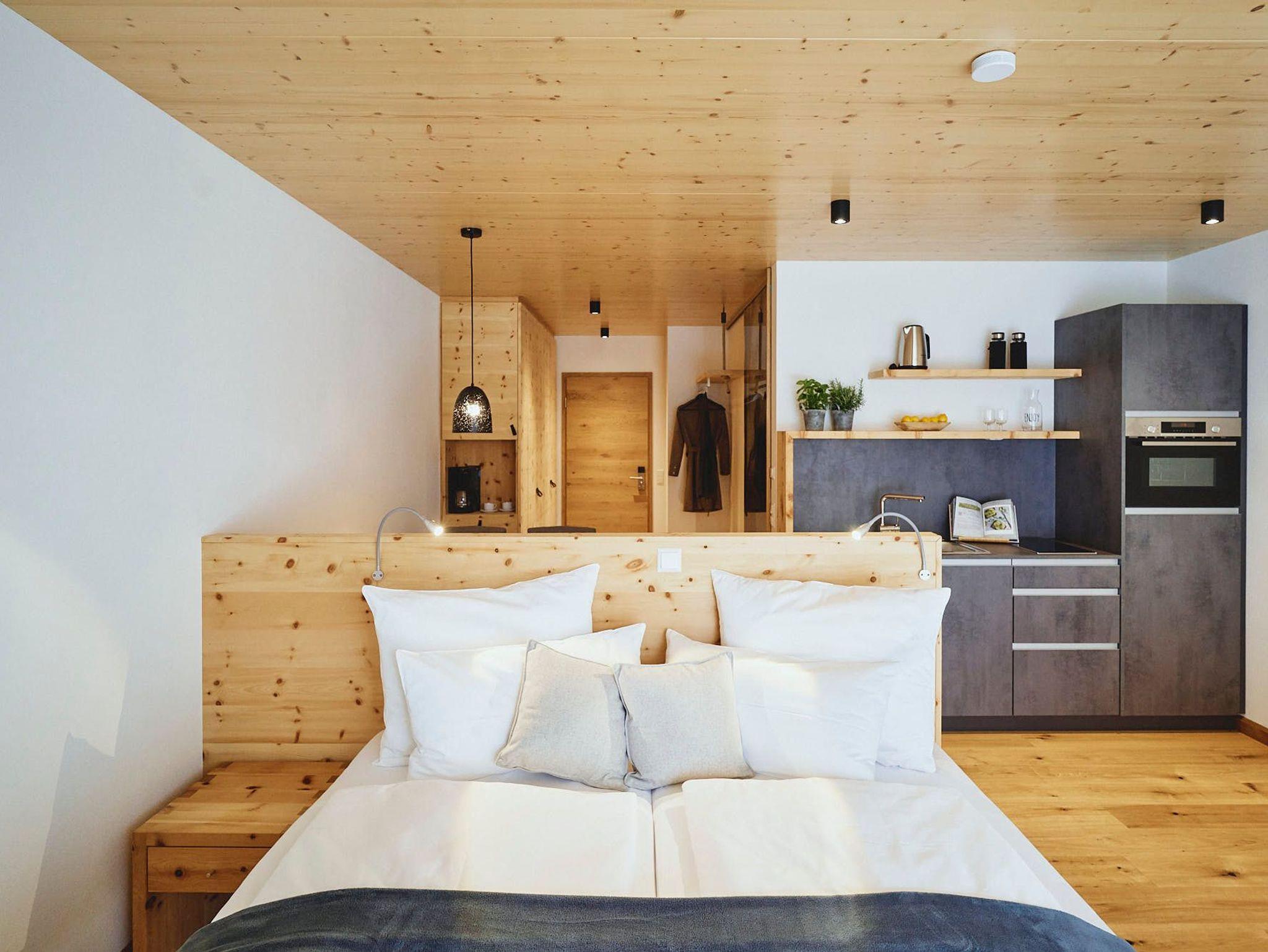 Acht einzigartige Apartments lichtdurchflutet und mit Platz für bis zu sechs Personen. Raumhohe Fenster lassen die Natur herein, während heimische Fichtenholzdecken eine Atmosphäre der Geborgenheit schaffen. Wohnen und Schlafen sind nur durch transparente Elemente getrennt, was den loftartigen Charakter der Räume unterstreicht.