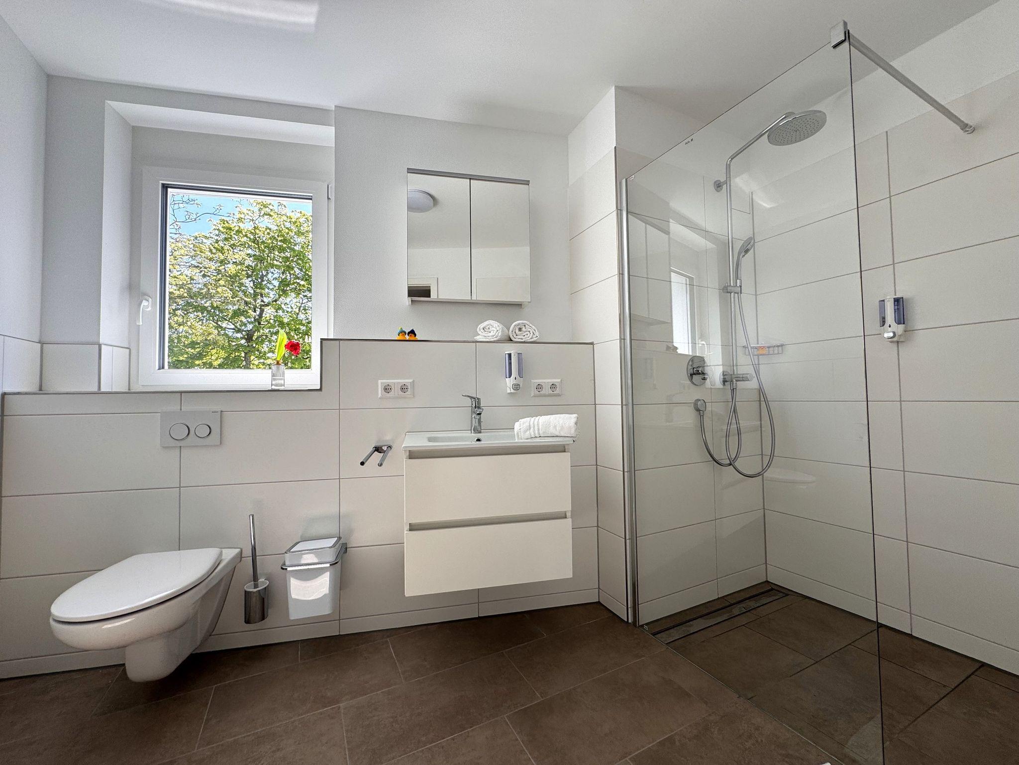 Entspannung pur: Das moderne Badezimmer, mit bodengleicher Dusche und integrierter Regendusche tut ihr Übriges dazu, dass Sie morgens erfrischt und gut gelaunt in den Tag starten.