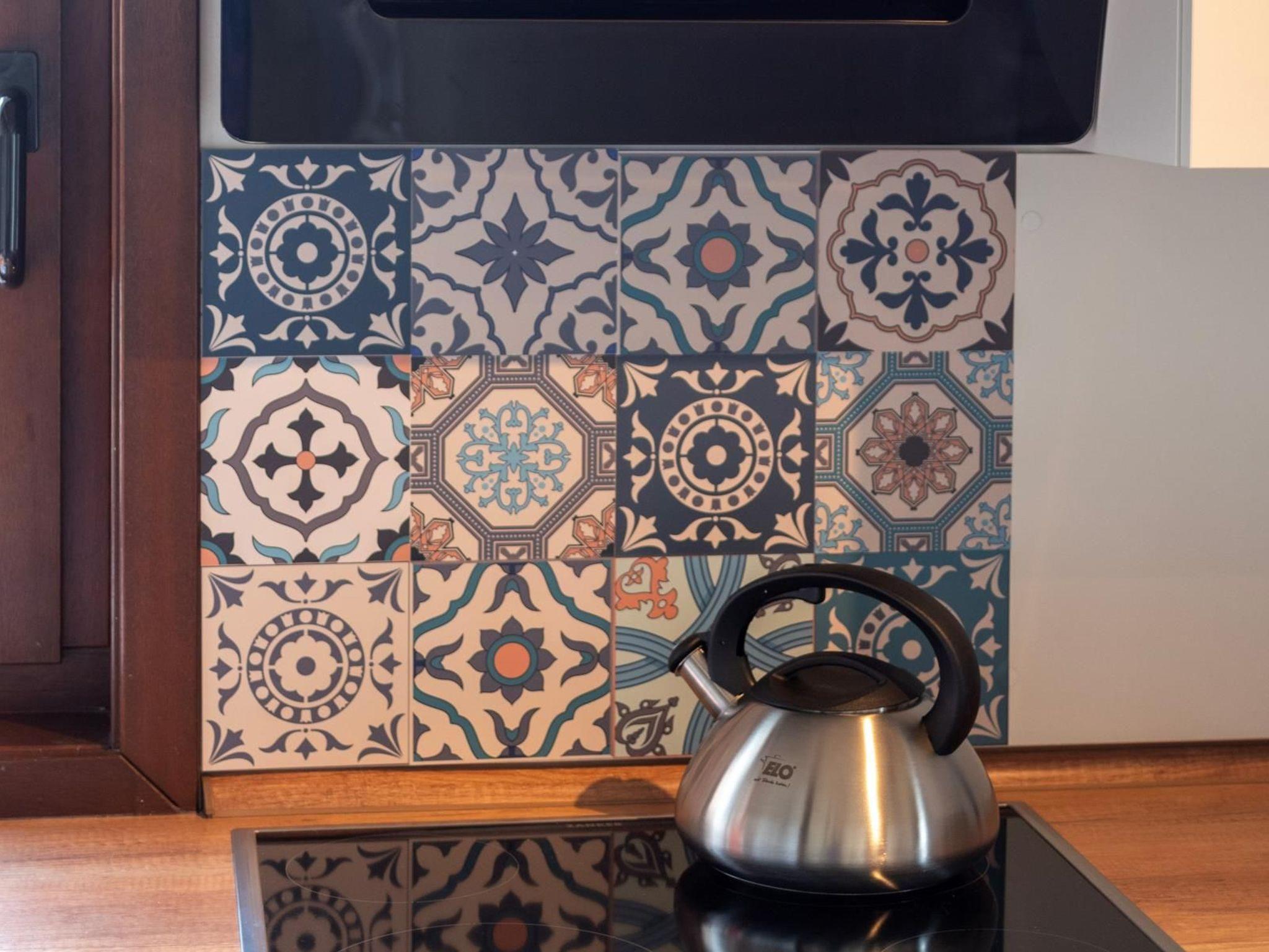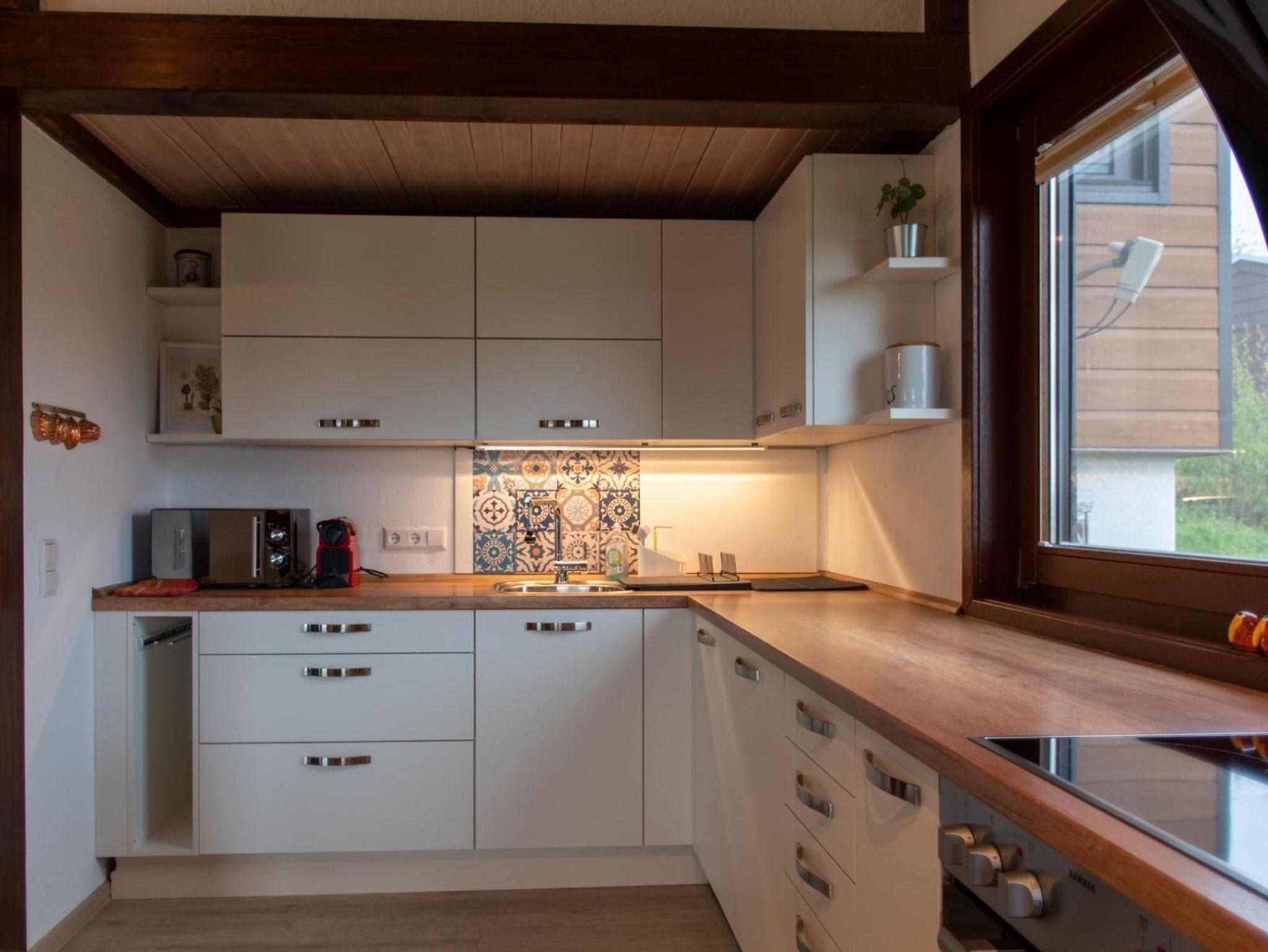 Voll ausgestattete Küche mit Kaffeemaschine, Mikrowelle, Geschirrspülmaschine, Backofen