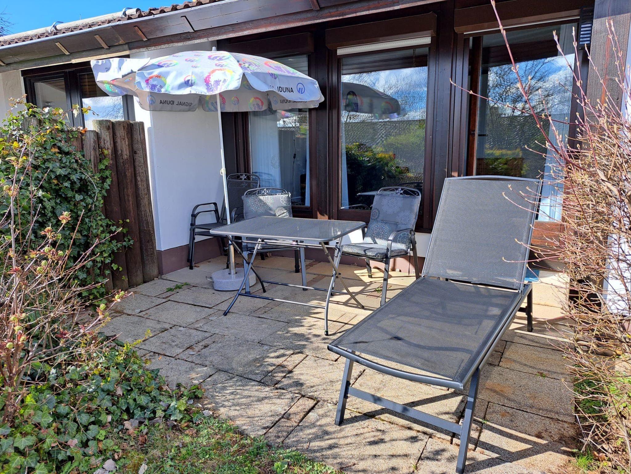 Die teilweise überdachte Terrasse ist möbliert (vier Stühle, Tisch, Sonnenschirm, zwei Relax-Liegen)