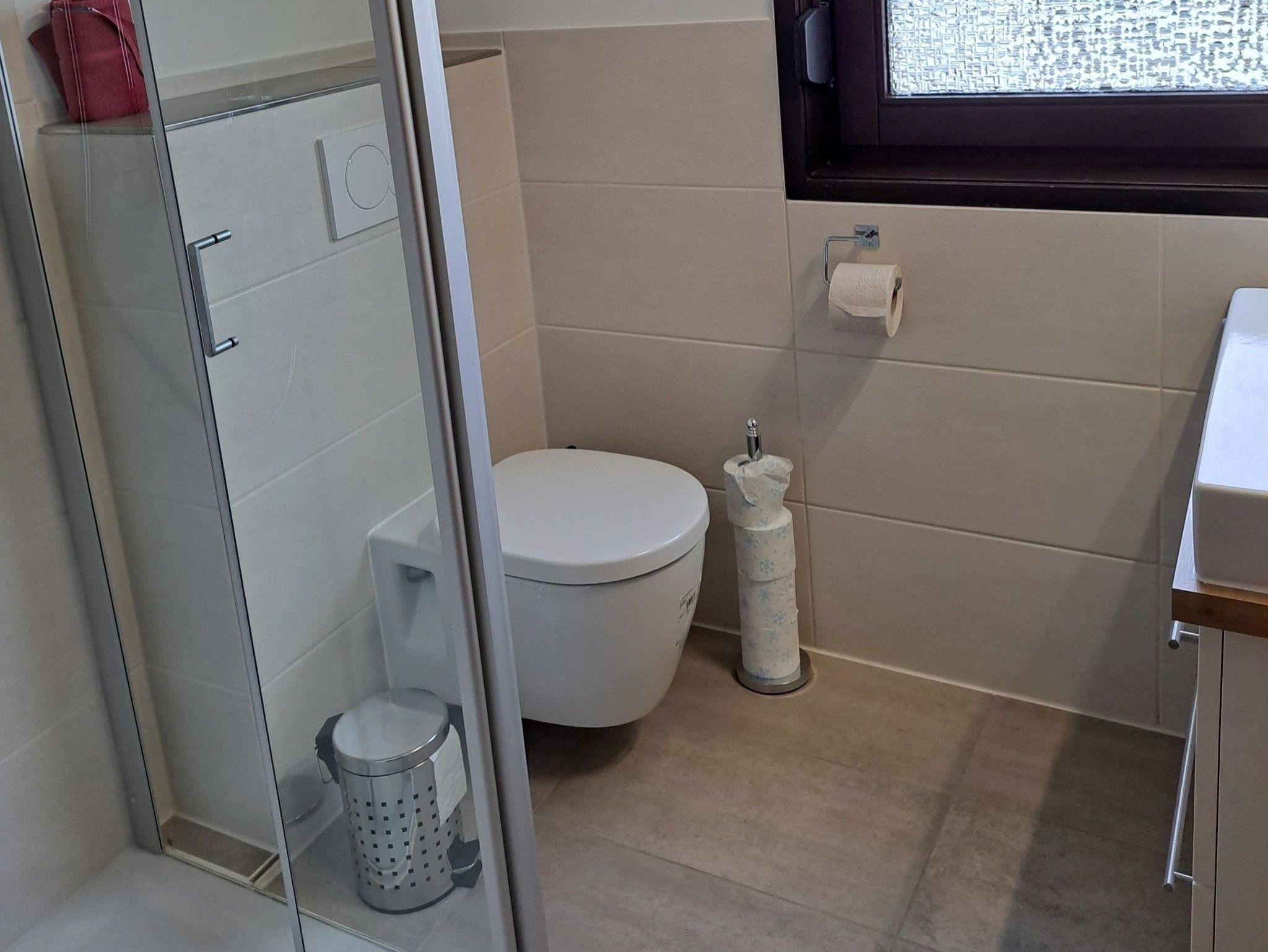 Bad: Dusche, WC, Waschbecken, viele Ablagemöglichkeiten, Handtuchwärmer, Föhn.
