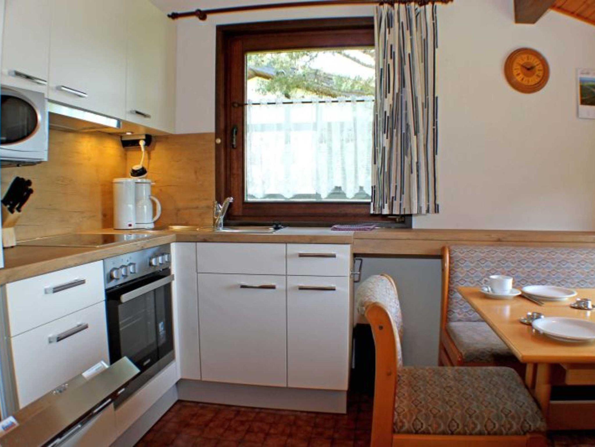 Küche mit Kühlschrank, Ceran-Kochfeld, Backofen (mit vielen Funktionen), Geschirrspüler, Mikrowelle, Kaffeemaschine, Wasserkocher und Toaster. Dunstabzug nach außen.