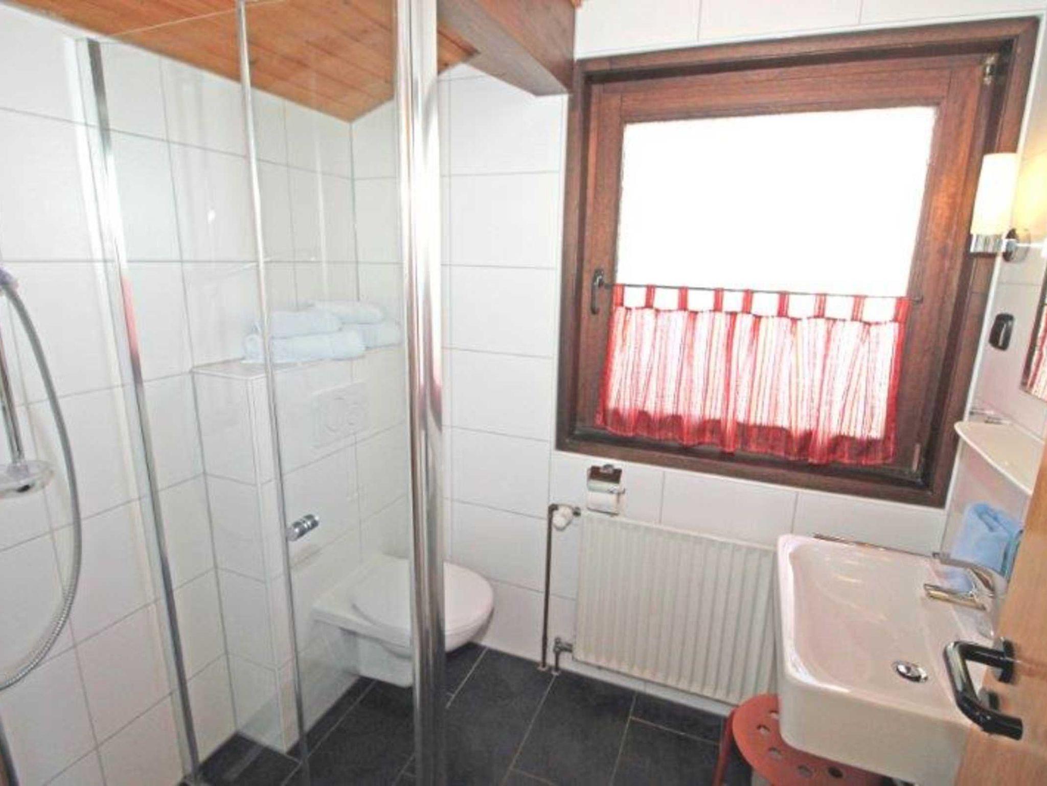 Bad mit WC, Waschbecken und bodengleicher Dusche.