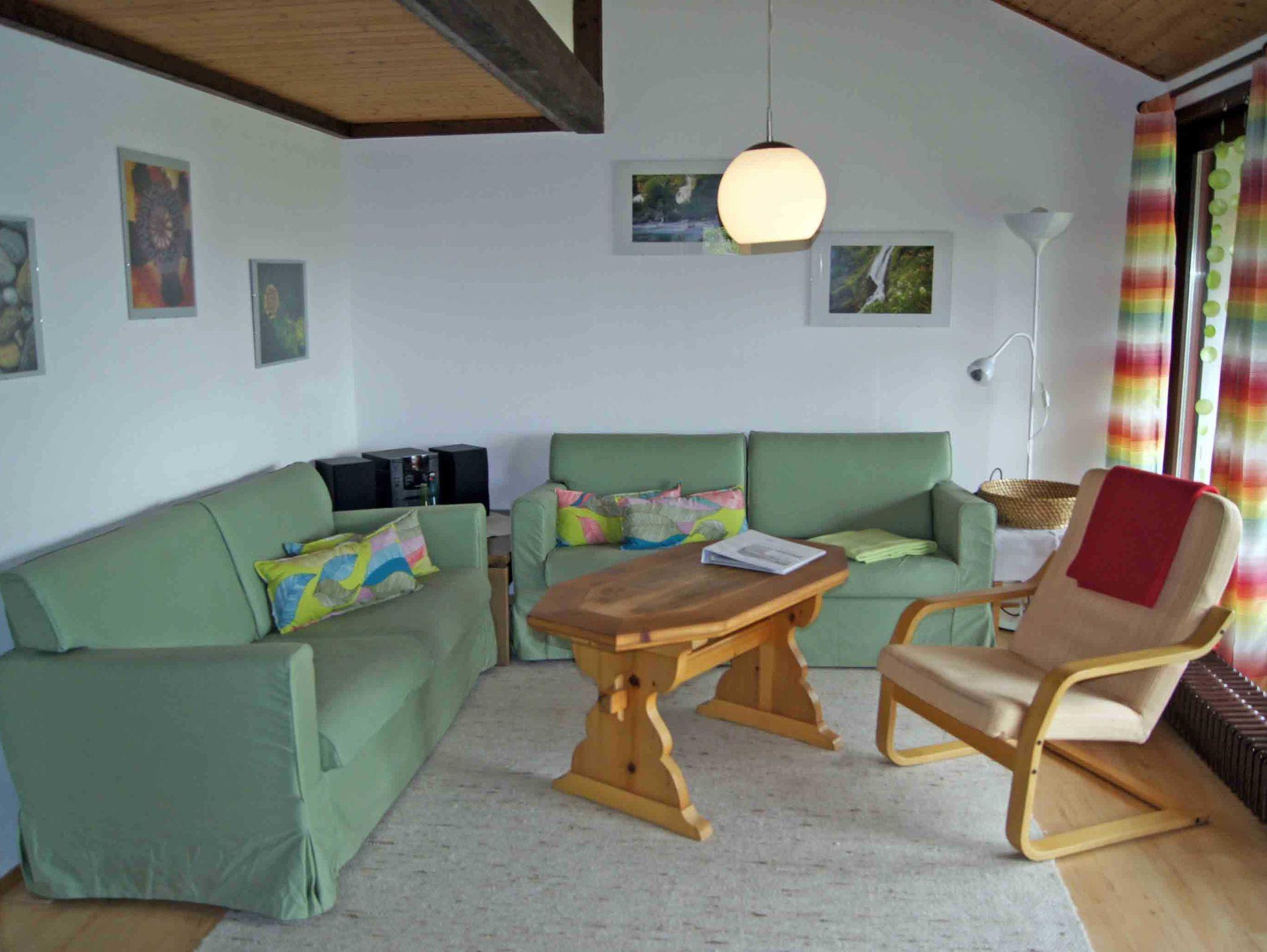 Auf Hohe des Hauseinganges befinden sich die zwei mit Rollladen ausgestatteten Schlafzimmer. Rechts das Ocean-Zimmer mit Doppelbett und zwei Einzelbetten in kuscheliger Nische und links das Brombeerzimmer. Von dieser Ebene fuhrt eine kurze Treppe zum Wohnbereich hinunter. Dieser besteht aus einem Wohnzimmer, modern eingerichtet mit HD-TV, Stereo Anlage mit CD-Player und gemutlichen Sitzgelegenheiten. Die Kuche mit Essecke schliesst sich direkt am Wohnzimmer an. In der Kuche unterstutzen Sie unter anderem eine Kaffeemaschine, ein Kuhlschrank, eine Mikrowelle, ein Backofen, vier Glaskeramik-Kochfelder viel Geschirr und eine Geschirrspulmaschine bei der Erstellung Ihrer schmackhaften Gerichte und beim Abwasch nach dem Genuss dieser. Auf der untersten Ebene des Hauses befindet sich das Badezimmer. Dieses ist ebenfalls modern eingerichtet und ladt zu einem entspannenden Duscherlebnis ein. Ein Haartrockner ist ebenfalls vorhanden.