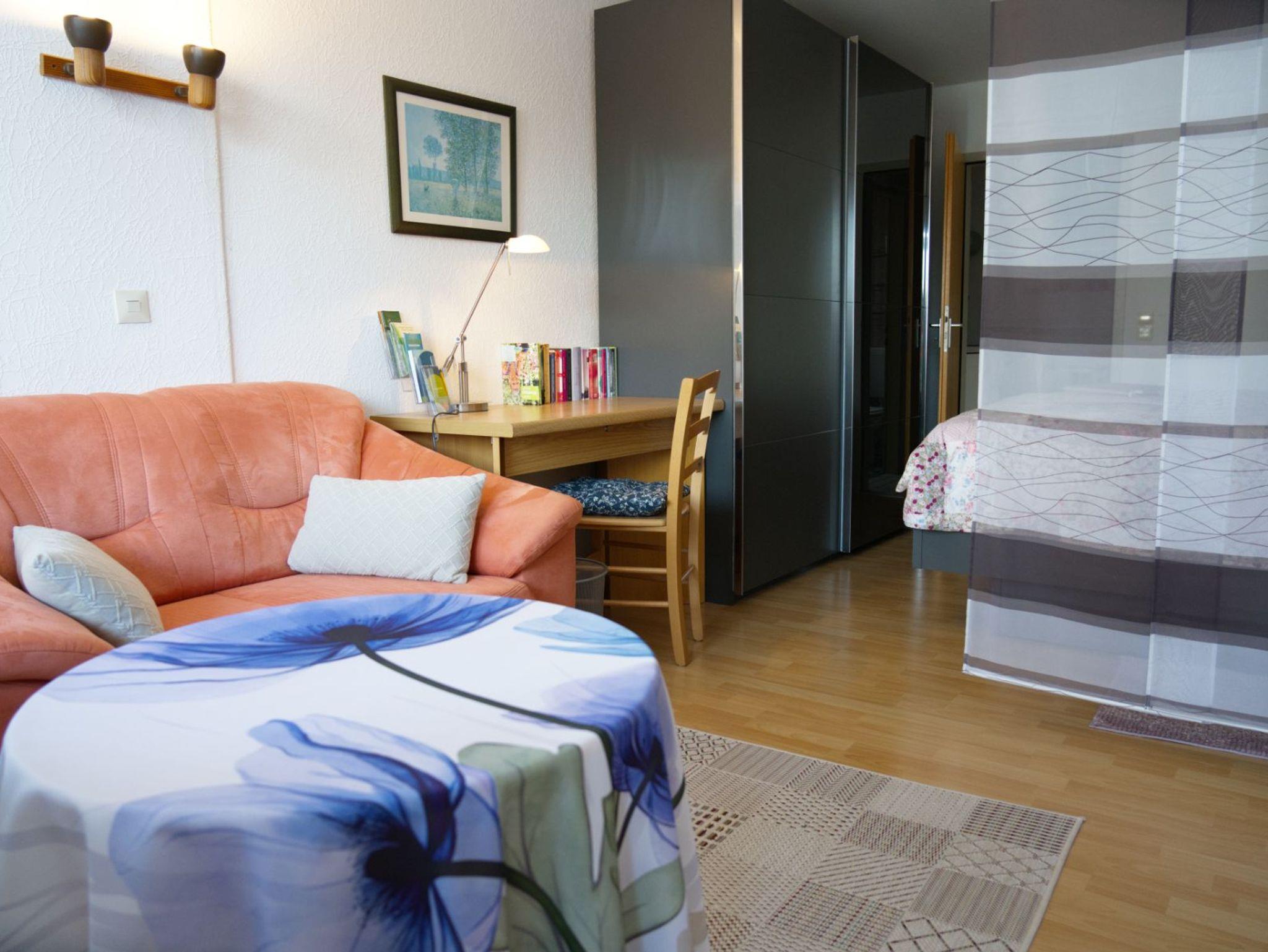 Die Nichtraucher Ferienwohnung Nr.3 hat einen schönen Aussen Sitzplatz und ist ca. 44qm gross. Ein kombinierter Wohn- und Schlafraum lädt zum gemütlichen Erholen ein. Ein Doppelbett, Sofa, Kleiderschrank und SAT Fernseher runden die Wohnharmonie ab. In der separaten Küche gibt es einen gemütlichen Essplatz.