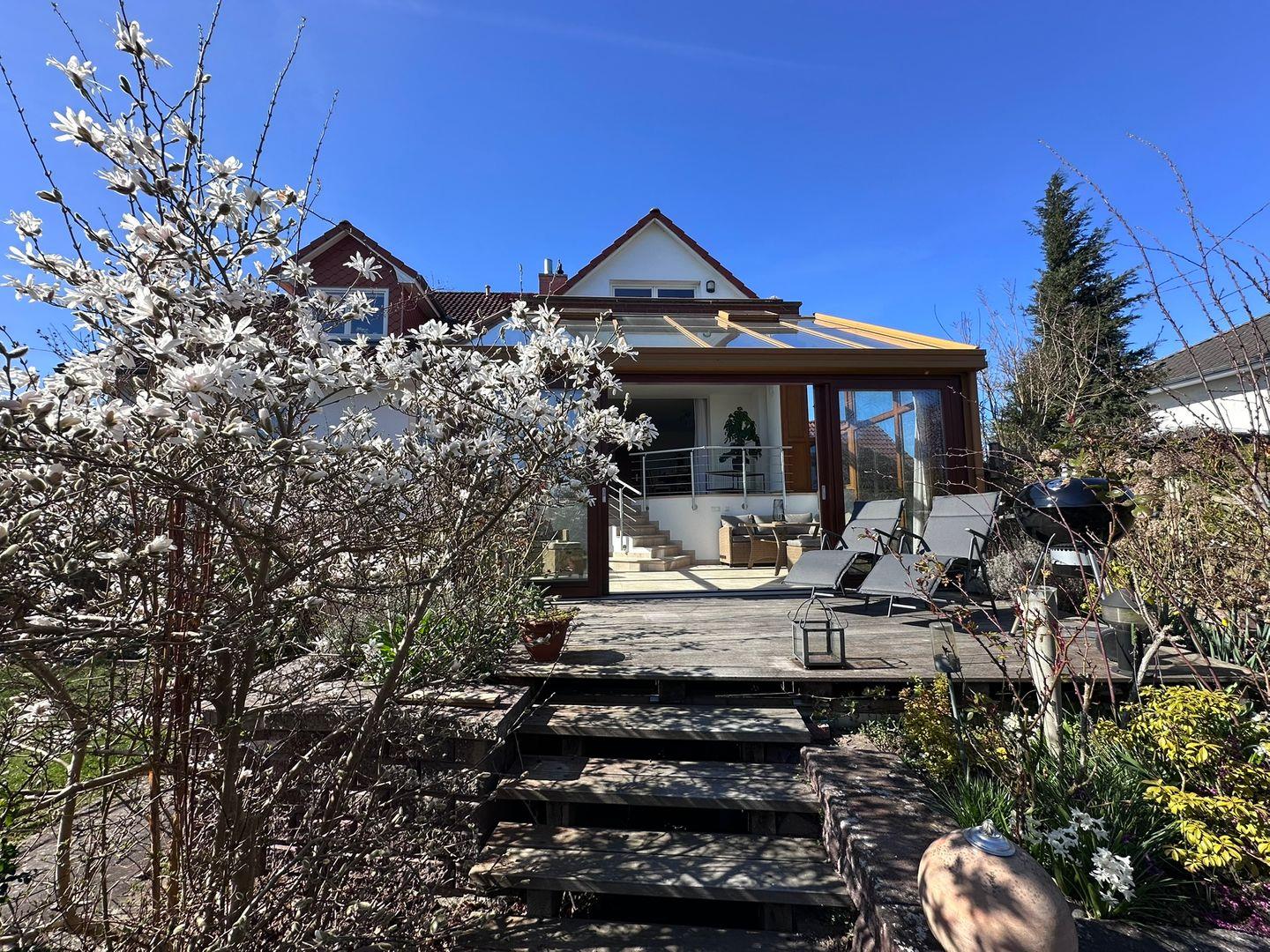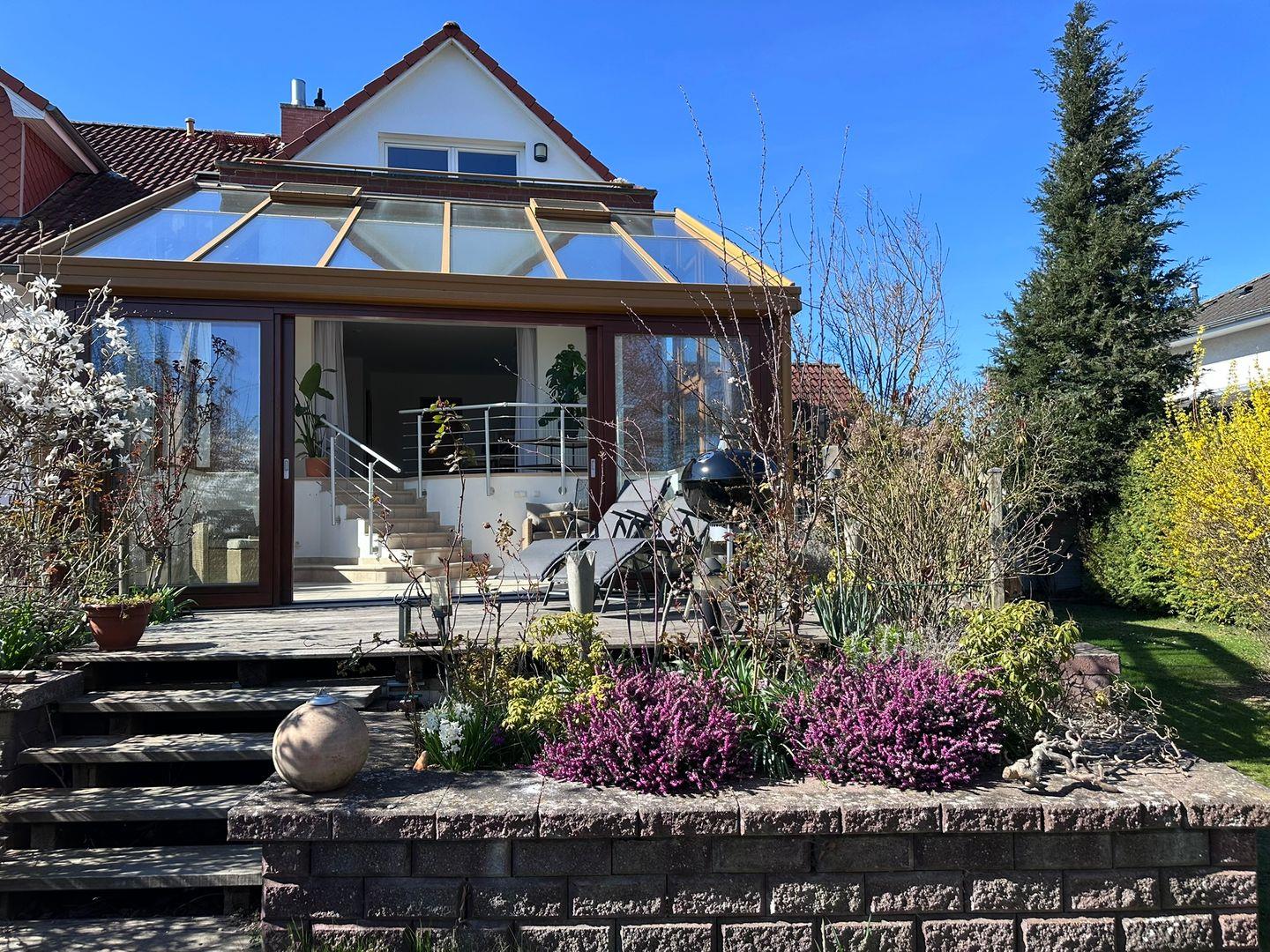 Ein besonderes Highlight des Hauses ist der Wintergarten, der Ihnen einen schönen Blick auf den Garten bietet und sich perfekt eignet, um auch an kühleren Tagen das Tageslicht zu genießen. Die überdachte Terrasse lädt dazu ein, im Freien zu speisen oder einfach nur die Ruhe und den Blick in den Garten zu genießen. Der Garten selbst ist mit Gartenmöbeln und einem Grill ausgestattet, ideal für gesellige Barbecues mit der Familie oder Freunden.
