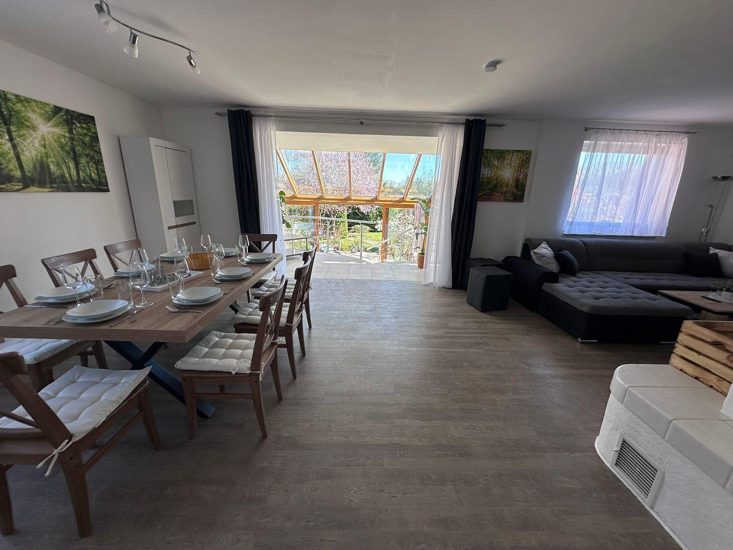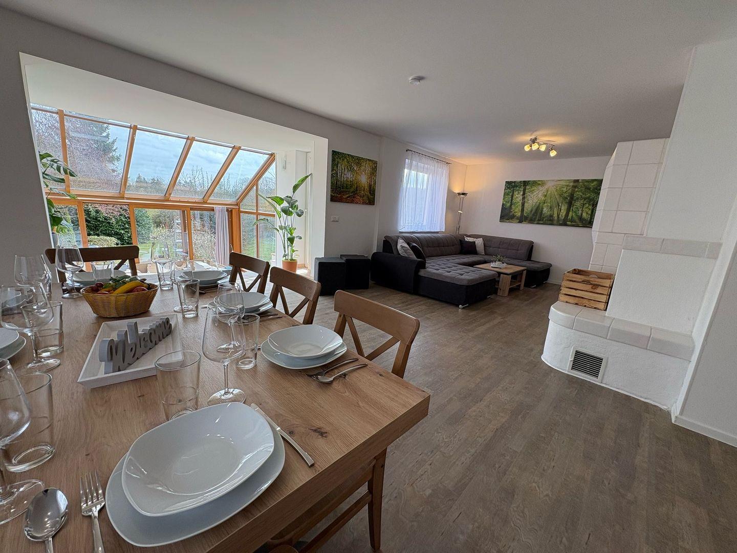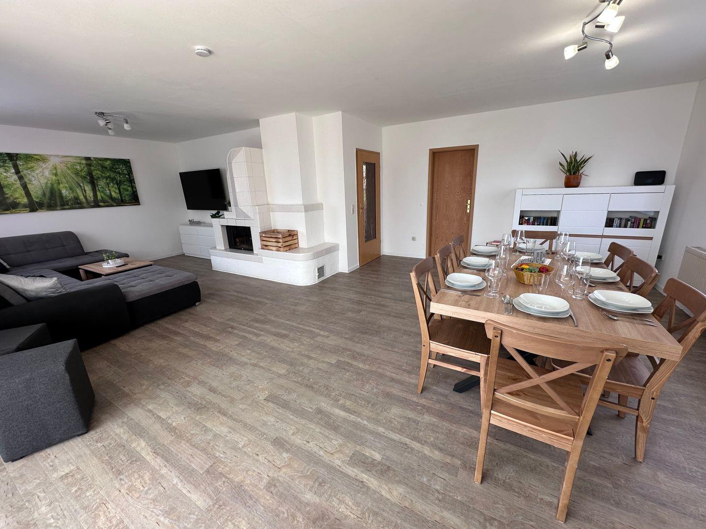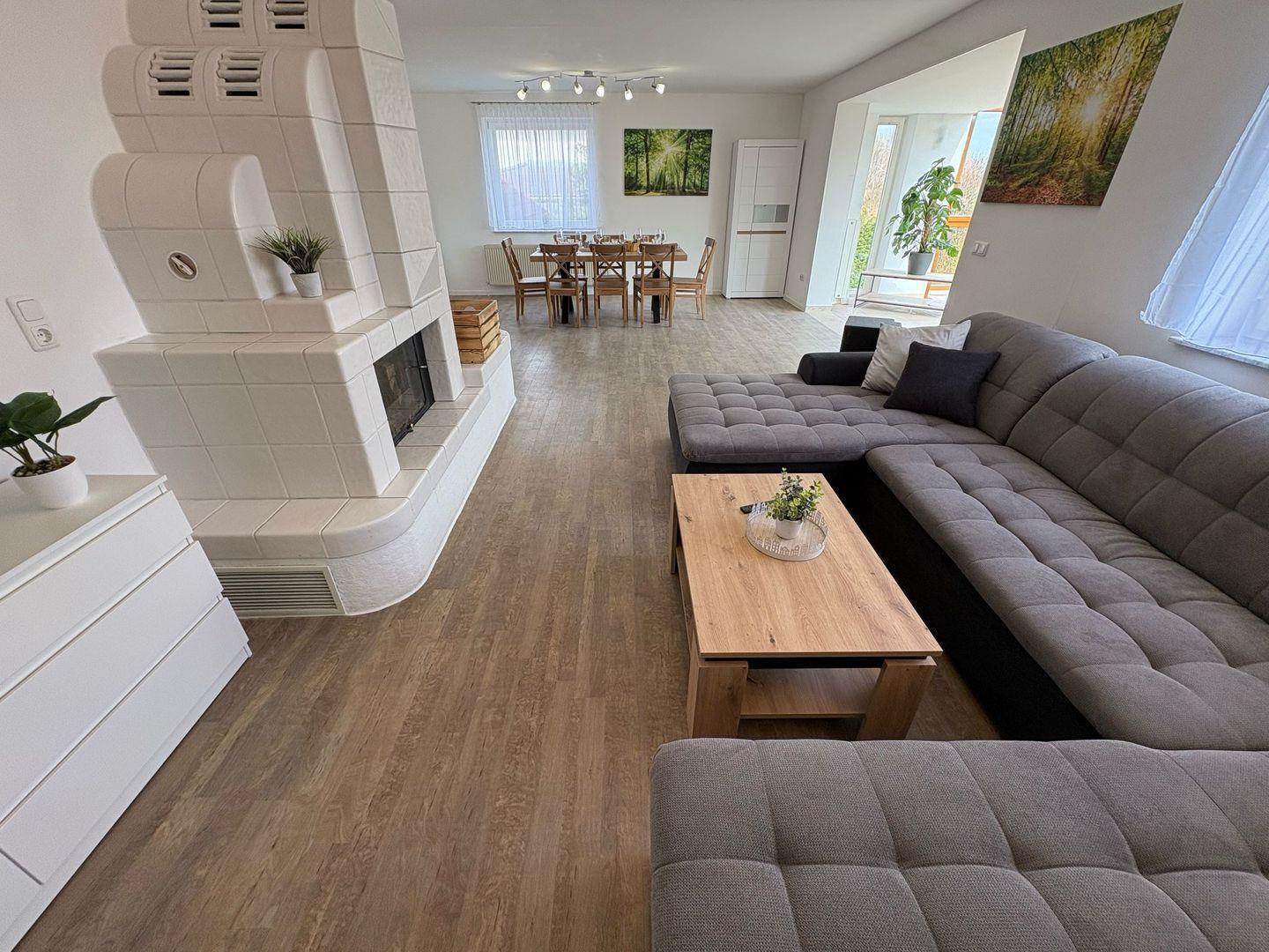 Die Ferienwohnung bietet Schlafmöglichkeiten für bis zu 6 Personen, verteilt auf zwei geschmackvoll eingerichtete Schlafzimmer. Das Wohnzimmer, ausgestattet mit einem bequemen Sofa und einem 65 Zoll großen Fernseher, lädt nach einem erfüllten Tag am Strand zum Entspannen ein. Zudem befindet sich eine vielseitige Sofaecke im Wohnzimmer, die zusätzlichen Platz für gesellige Abende bietet. Ein integrierter Essbereich, der Platz für alle Gäste bietet, sorgt dafür, dass Sie gemeinsame Mahlzeiten und unvergessliche Moment genießen können.