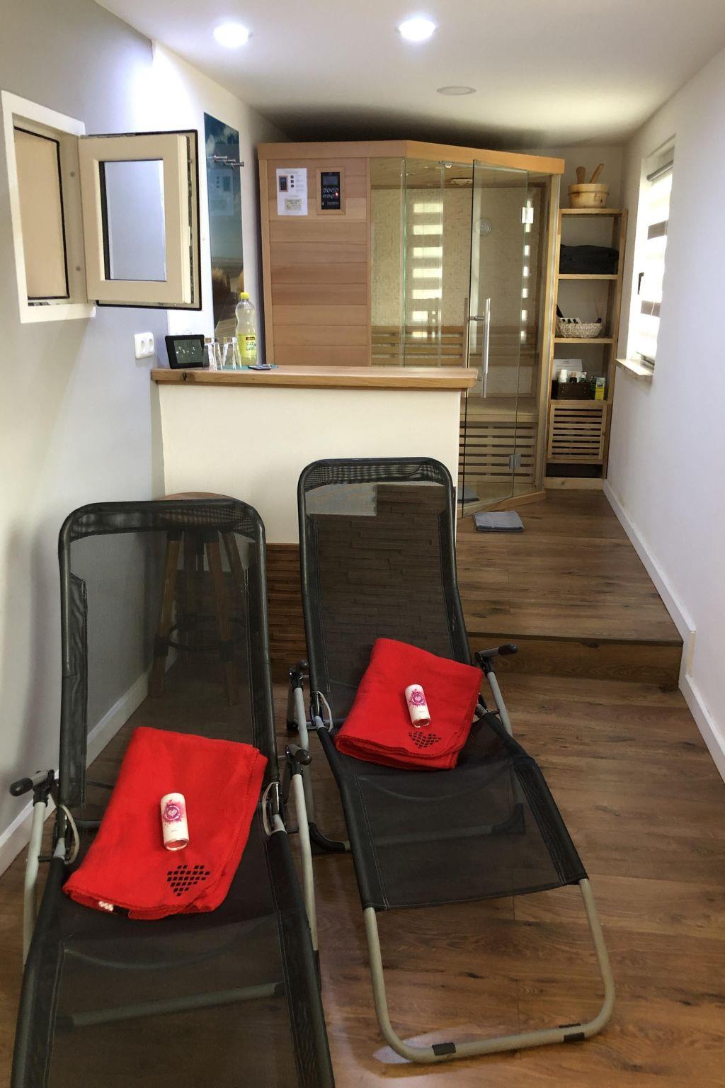 Outside, a 700 m2 fenced garden invites you to relax and unwind. Enjoy sunny days or balmy evenings on the terrace, equipped with garden furniture, deckchairs and a barbecue. Additional relaxation is provided by our wellness facilities, including a sauna with relaxation area and shower as well as a pool house with whirlpool, fireplace and comfortable deckchairs.