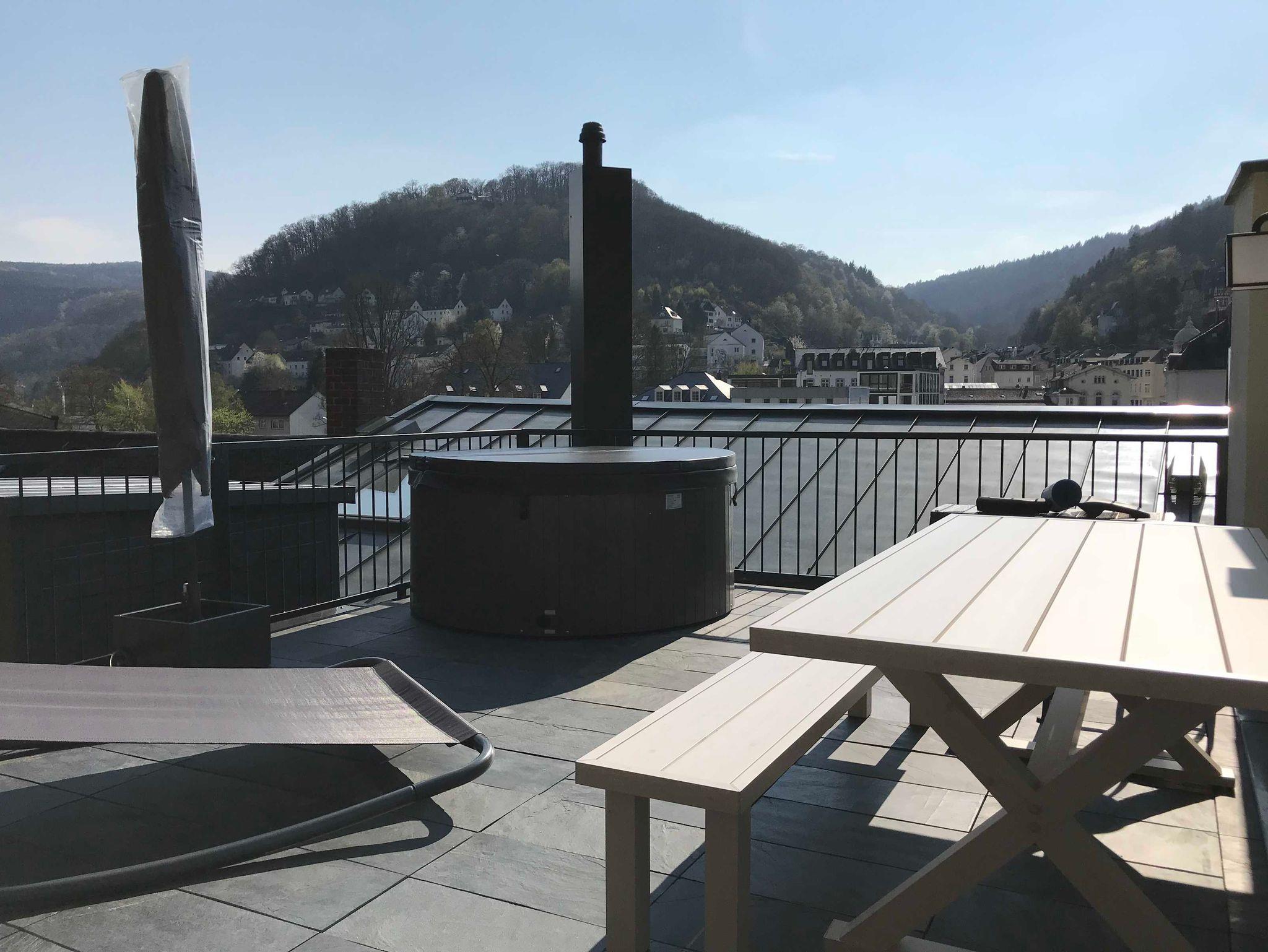 Das im Dachgeschoß liegende Apartment „Au Ciel“ hat eine eigene Dachterrasse mit Jacuzzi, ist für 2 Personen geeignet und ist über einen Aufzug erreichbar.