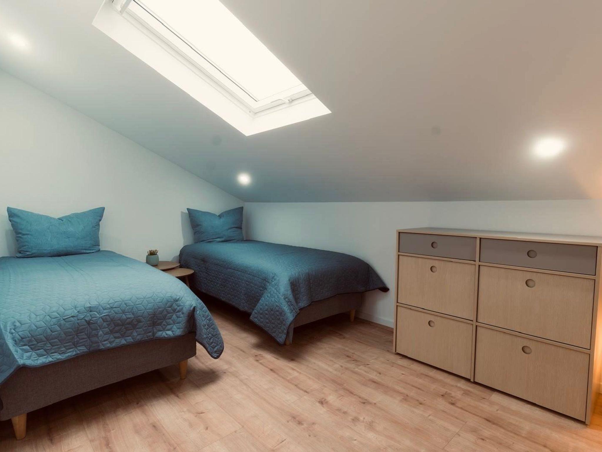 Zwei separate Schlafzimmer bieten ideale Rückzugsorte: Eines ist mit einem großzügigen Boxspringbett (180 cm) ausgestattet, das andere mit zwei einzelnen Boxspringbetten (je 90 cm) – perfekt für Familien mit Kindern oder kleine Gruppen.