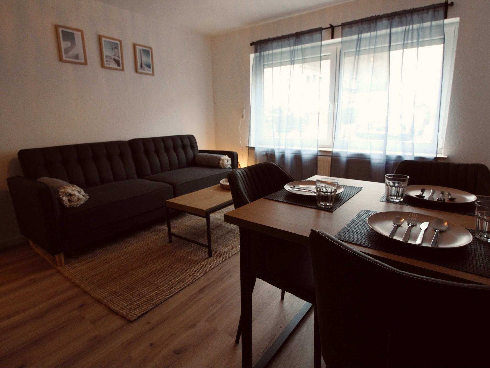 Ferienwohnung „Yacoub“ (ca. 50 m² | bis zu 3 Personen) Elegant und gemütlich – ideal für Paare oder kleine Gruppen. Ein Schlafzimmer mit einem großen Boxspringbett, eine komfortable Schlafcouch im Wohnbereich, eine moderne Küche und ein behaglicher Essbereich lassen keine Wünsche offen. Natürlich auch mit Zugang zum Grillplatz.