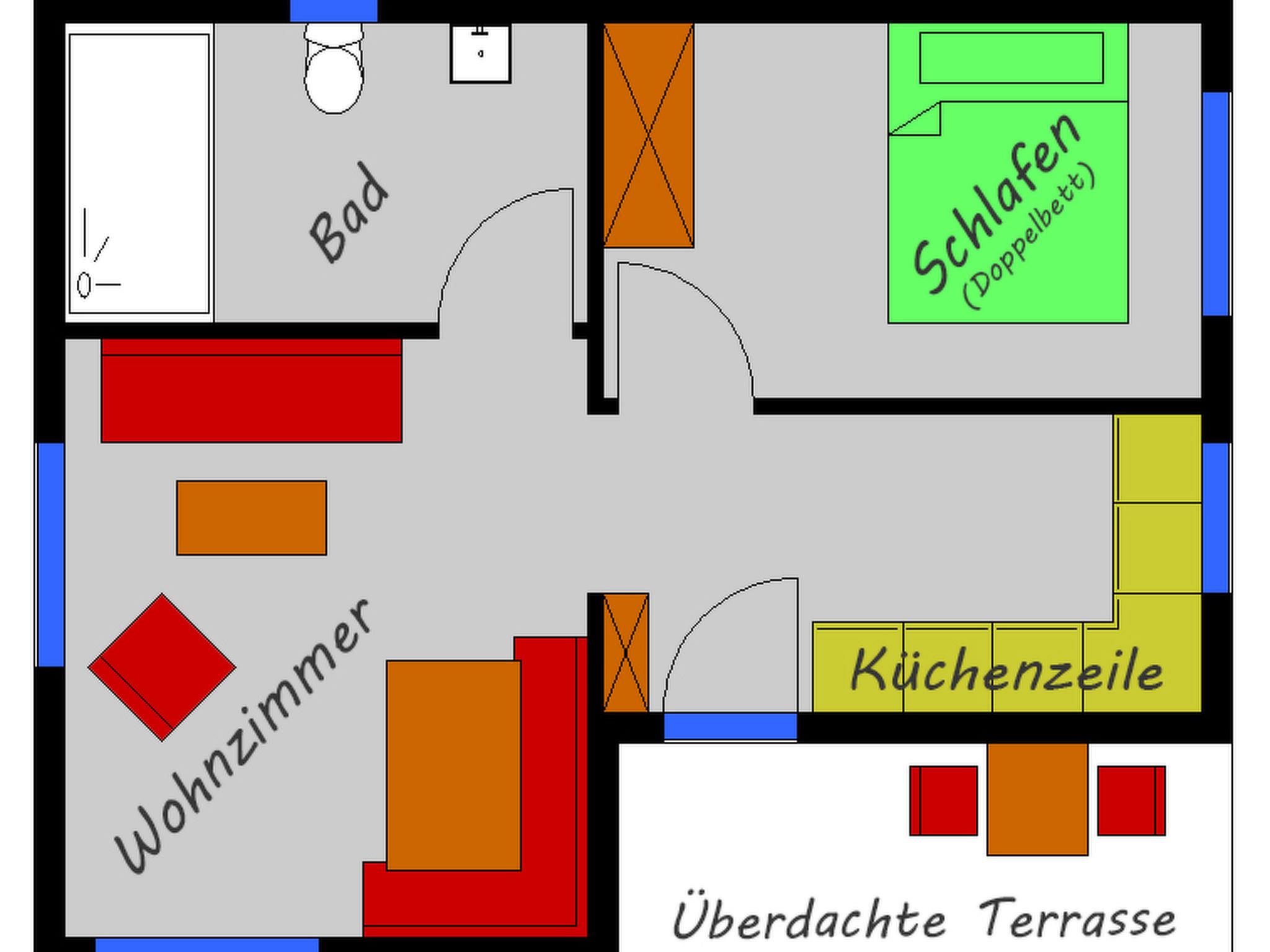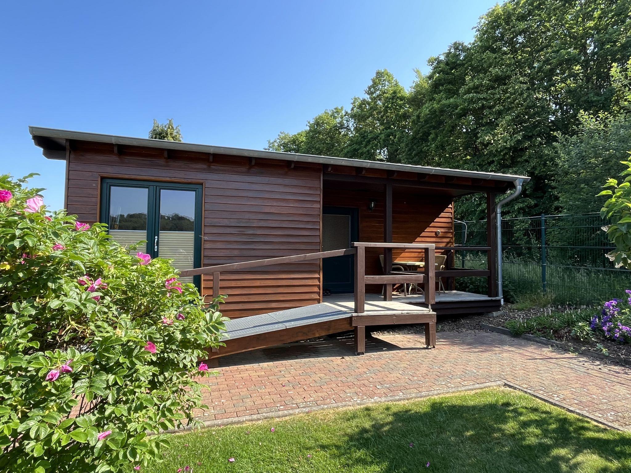 2-room bungalow 45 m2. Modern furnishings: living/sleeping room with 1 sofabed, dining table, dining nook, satellite TV, radio and DVD. Exit to the terrace. 1 room with 1 double bed. Open kitchen (4 gas rings, toaster, kettle, microwave, electric coffee machine). Shower/WC. Underfloor heating. Terrace. Terrace furniture. Facilities: children's high chair, baby cot. Internet (WiFi, free). Please note: non-smokers only. Maximum 1 pet/ dog allowed. Smoke alarm, fire extinguisher. The bungalow is barrier-free and wheelchair accessible.