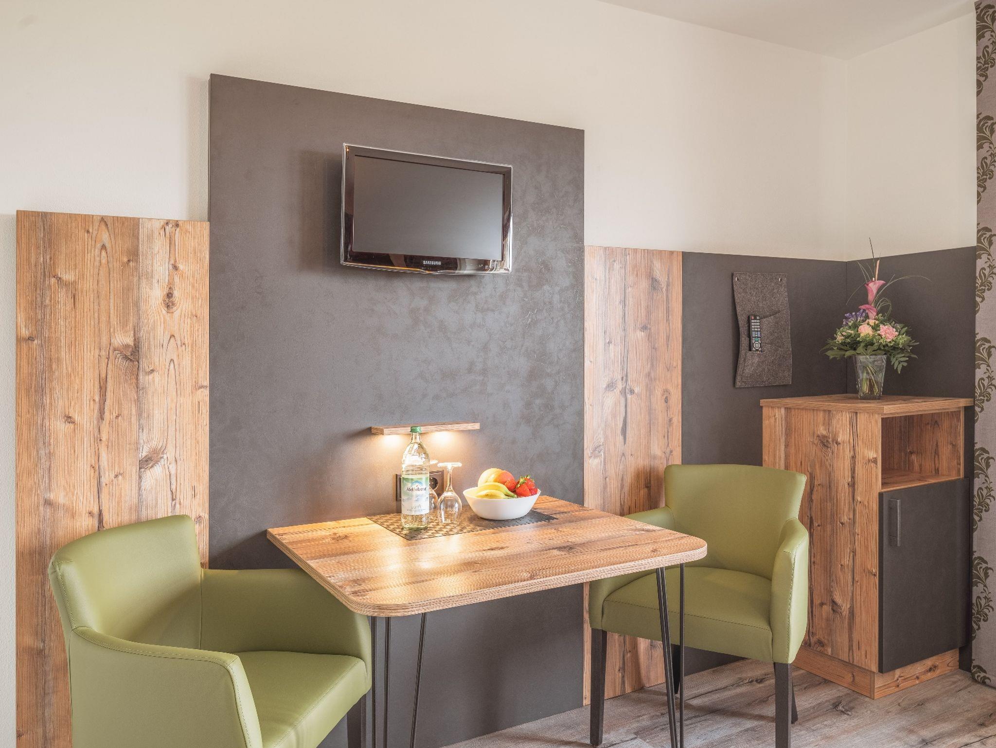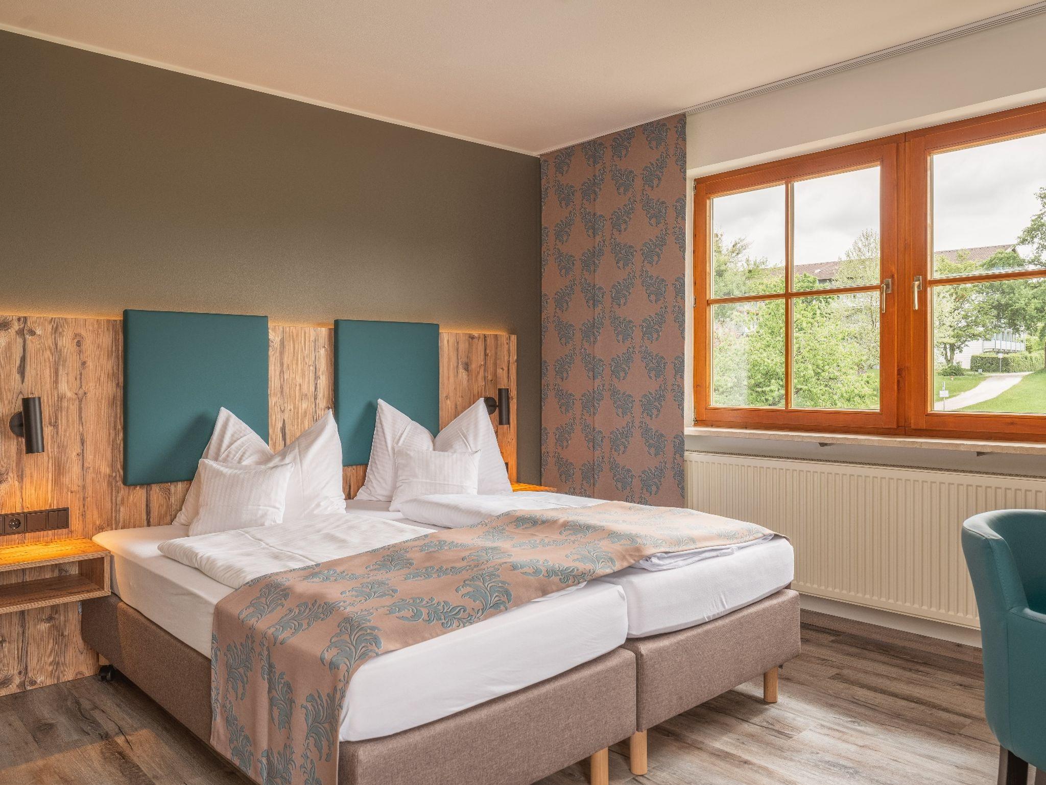 Alle Doppelzimmer haben Balkon, DU/WC, Telefon, Fernseher, kostenloses WLAN und eine Couch. Ebenso ist ein Ganzkörperspiegel, eine Garderobe und ein Kleiderschrank mit Kleiderhaken und Ablegeflächen vorhanden. Die Zimmer sind ausgestattet mit einem Kühlschrank, Tisch und Stühle, Wasserkocher, Geschirr und Besteck. Der Balkon mit teilweise Berg-u.Seeblick und freiem Weitblick über Wiesen, Felder und auf die nahelegende Chiemgautherme mit Simsseeklinik ist bestückt mit Sonnenschirm, Sitzgelegenheit mit Tisch und Stühle, Wäscheständer und Liegestühle zum Sonnen. Ein Kühlschrank für kalte Getränke und einer Brotzeit ist auch vorhanden. Das Bad hat einen Spiegel , beheizten Handtuchhalter mit Handtücher und einen Fön. Für die kalte Jahreszeit ist eine Zentralheizung vorhanden. Zur Verdunkelung sind Rolladen an den Fenstern und Balkontüren.
