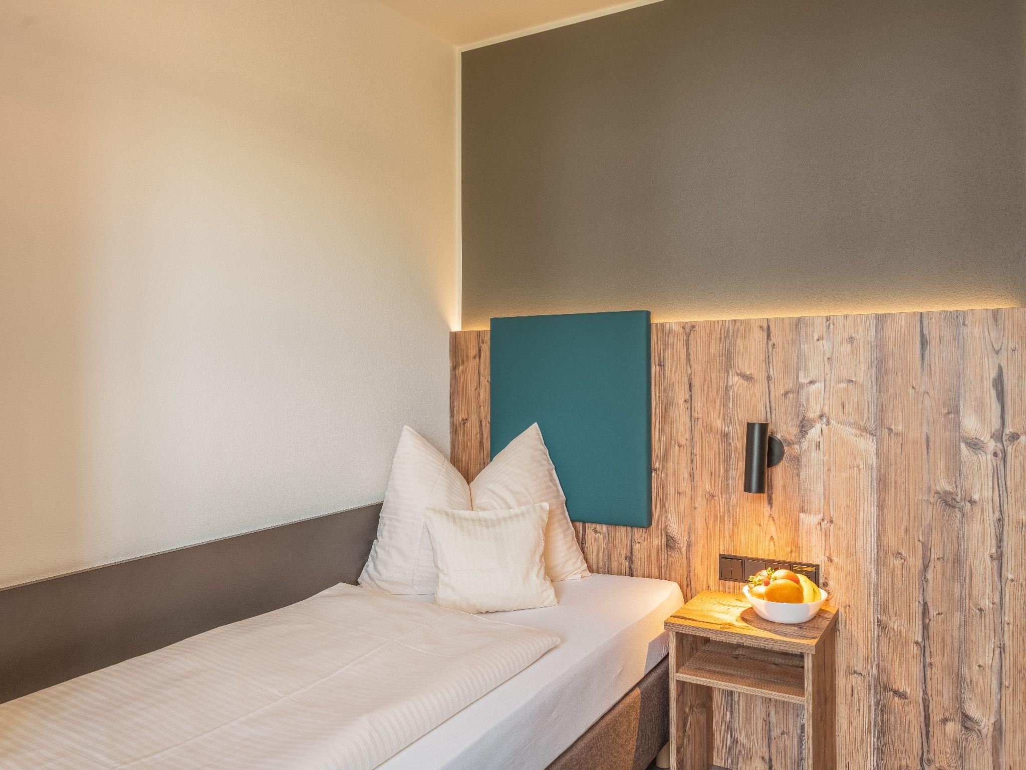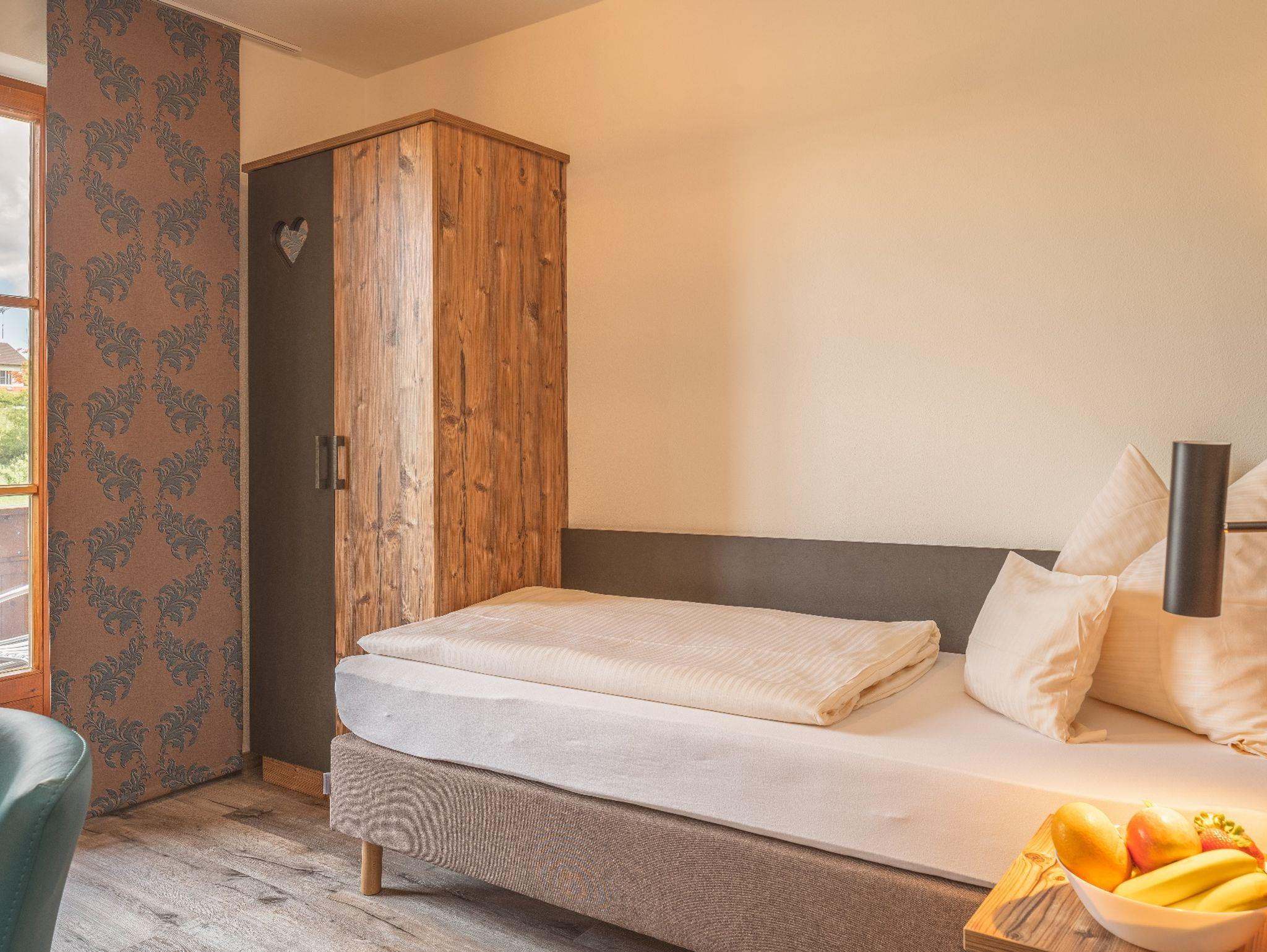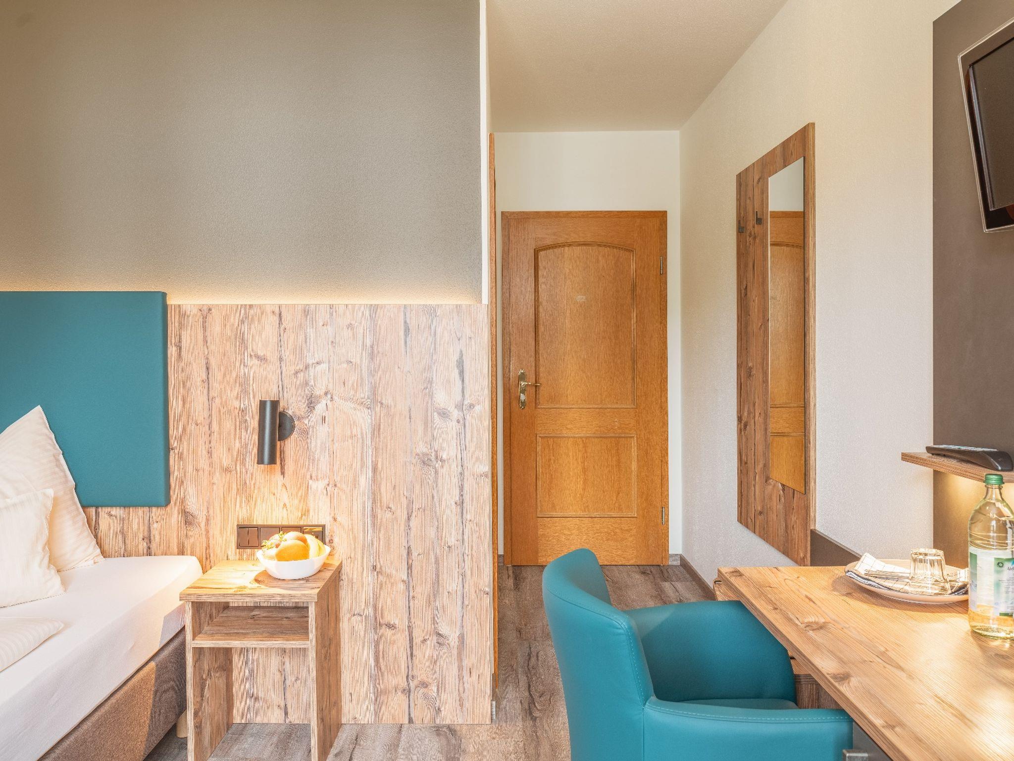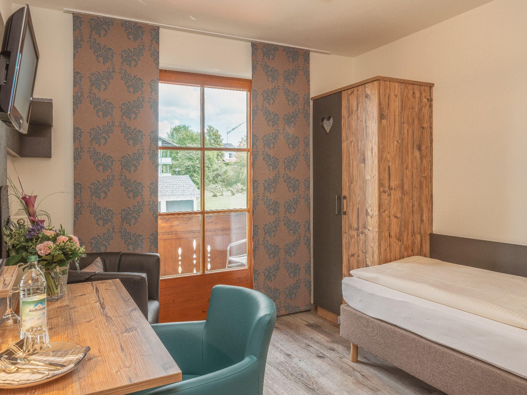 Die Einzelzimmer mit DU/WC, Telefon, Fernseher, kostenloses WLAN haben Terrasse oder Balkon mit einem wundervollen Weitblick auf die Berge und den Simsse. Ebenso ist ein Ganzkörperspiegel, eine Garderobe, und ein Kleiderschrank mit Kleiderhaken und Ablegeflächen vorhanden. Die Zimmer sind ausgestattet mit einem Kühlschrank für kalte Gestränke und einer Brotzeit, Teller, Besteck, Wasserkocher, Tisch und Stuhl. Das Bad hat einen Spiegel, beheizten Handtuchhalter mit Handtücher, und einen Fön. Für die kalte Jahreszeit ist eine Zentralheizung vorhanden. Die Terrasse oder auch Balkon sind mit Sonnenschirmen, Tische, Stühle und Sonnenliegen ausgestattet. Zur Verdunkelung sind Rolladen an den Fenstern und Balkontüren.