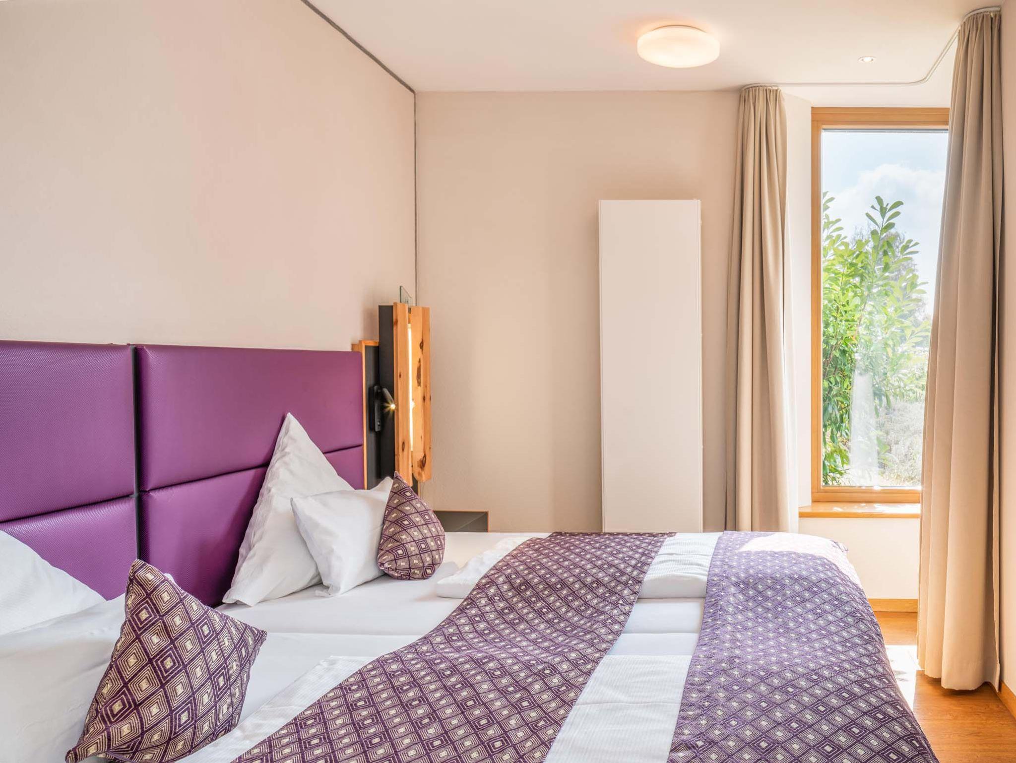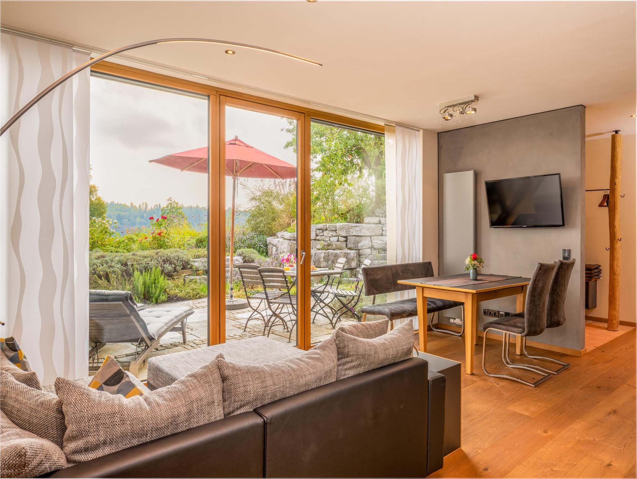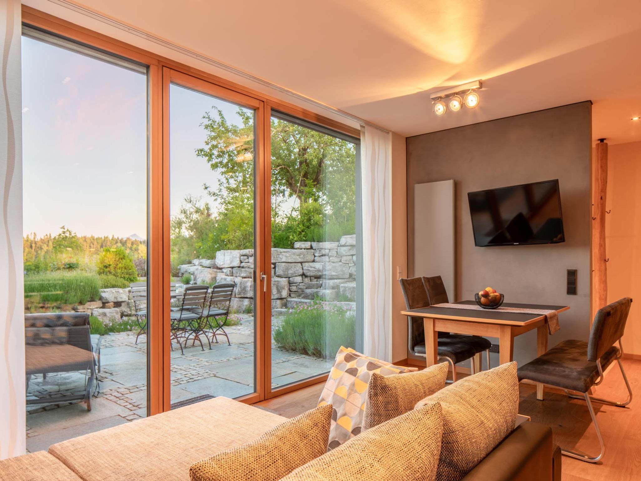 Die lichtdurchflutete Wohnung „Wellvital“ mit offenem Wohnraum und großem Panoramafenster bietet einen unvergleichlichen Blick über den dazugehörigen Lavendel-Duftgarten, den Pelhamer See sowie die Chiemgauer Alpenkette. Für das körperliche und seelische Wohlbefinden stehen in jedem der beiden Schlafräume große Betten bereit, die mit ausgezeichneten Matratzen ausgestattet sind. Es sind zwei Bäder vorhanden, eines davon direkt einem Schlafzimmer zugeordnet. Das größere Bad ist als privater Spa-Bereich gestaltet und ist mit einer Wellness-Badewanne für zwei Personen, einer geräumigen Dusche und einer Infrarotkabine ausgestattet. Die einzigartige Illusionsmalerei ist das Highlight der exklusiven Ausstattung.